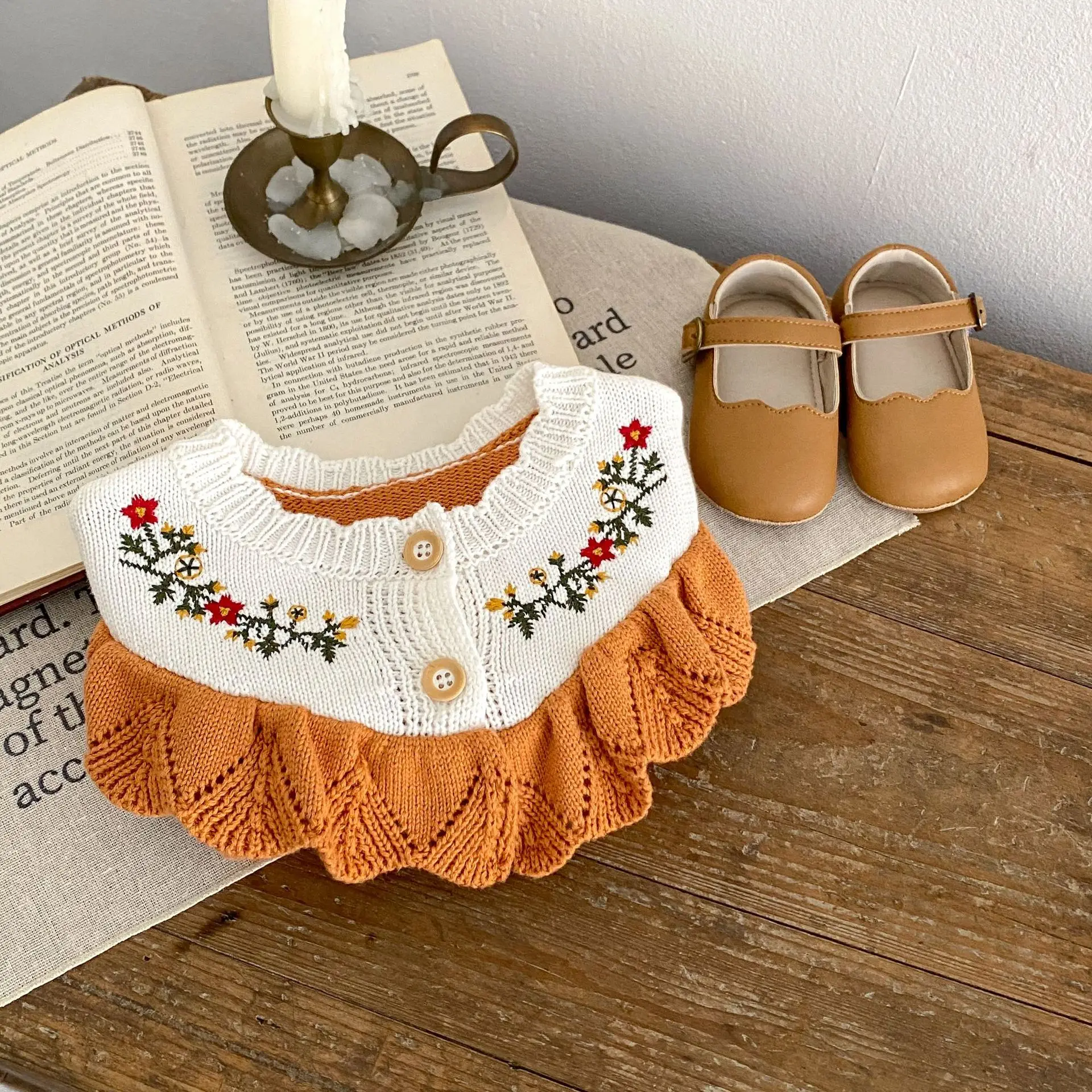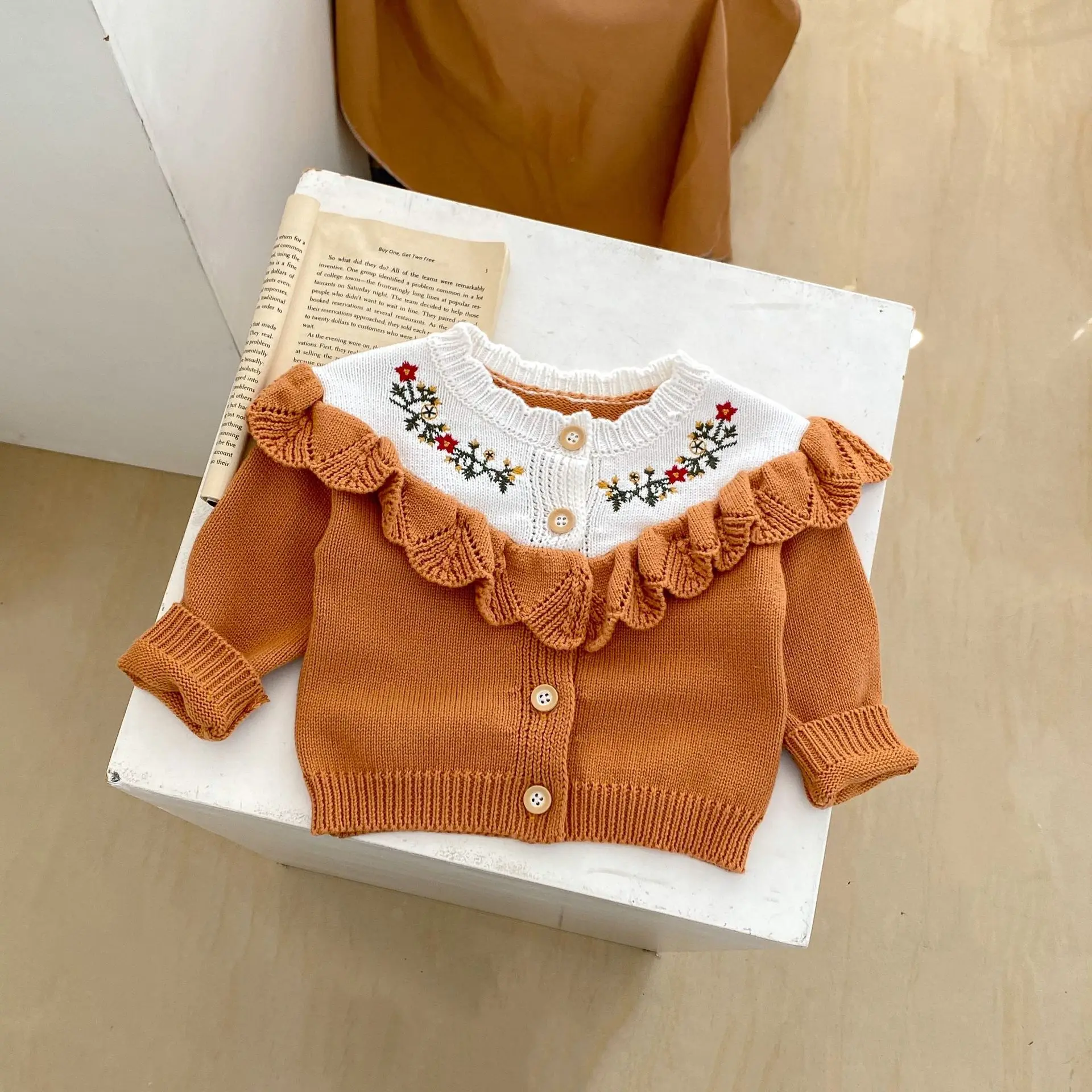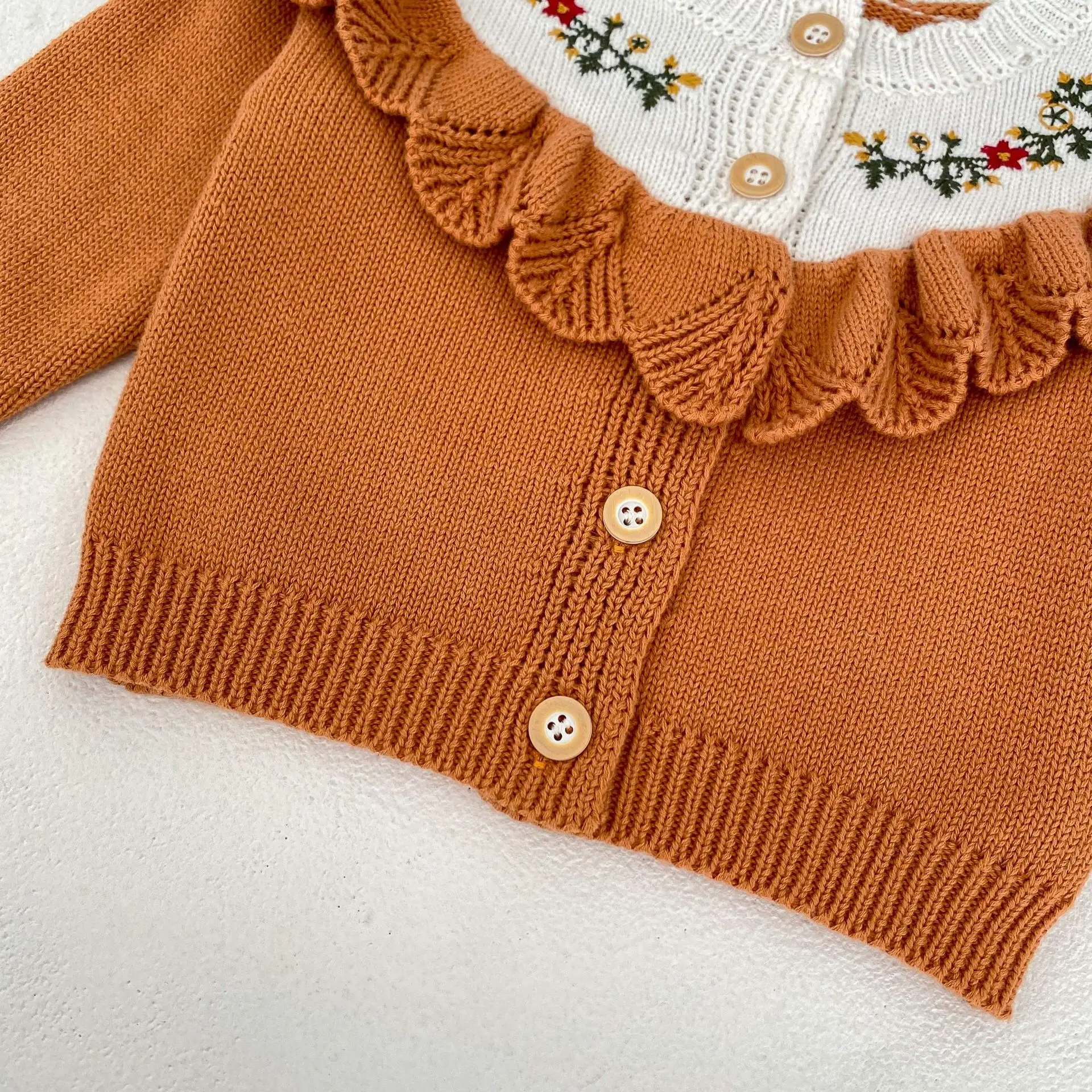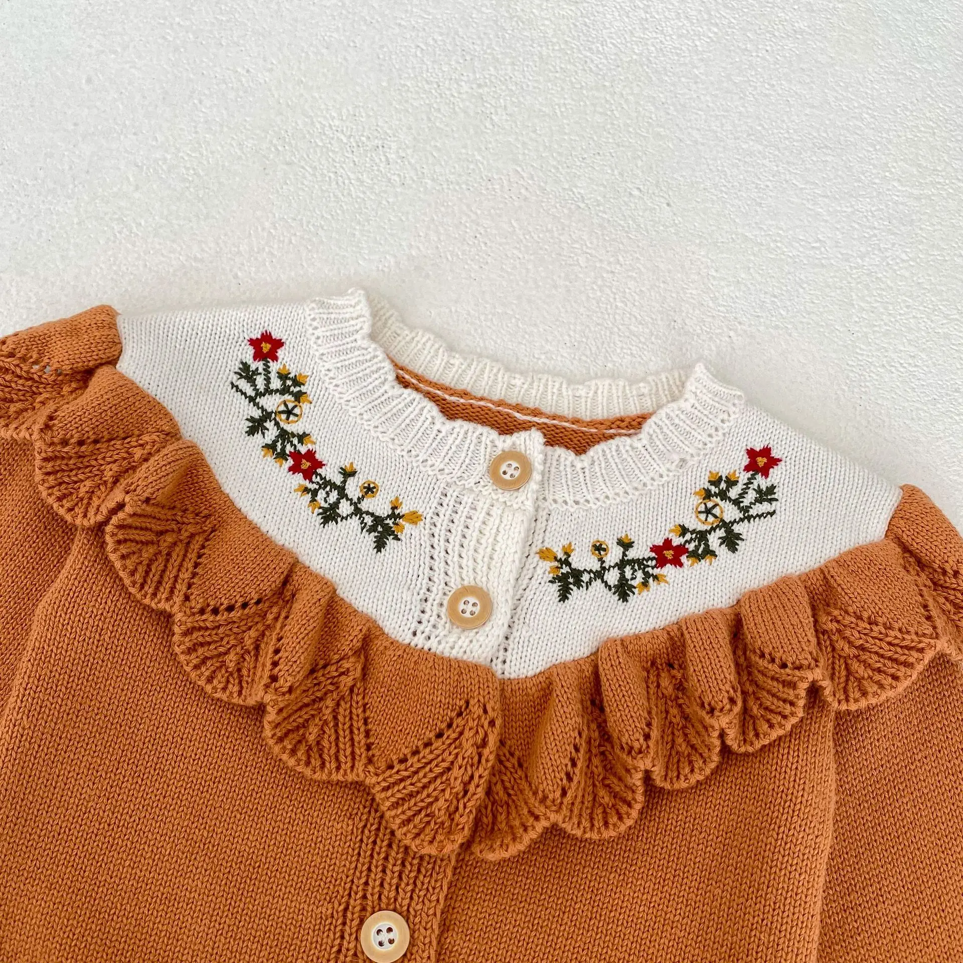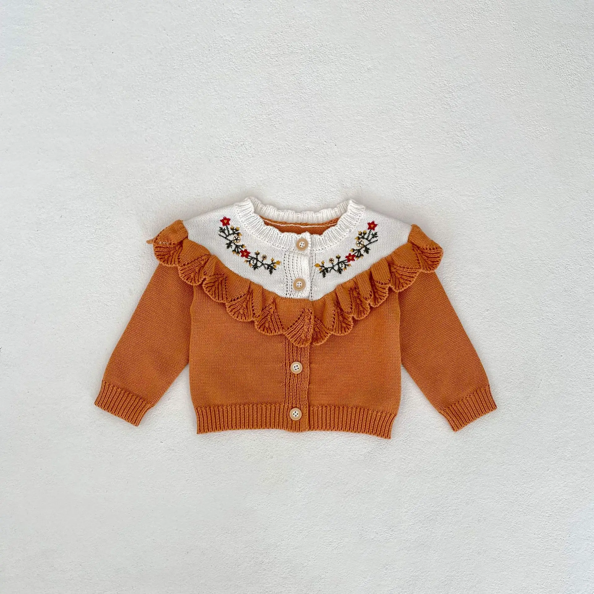 Baby cardigan, ruffled knit jacket with floral embroidery, orange [mh0006408]