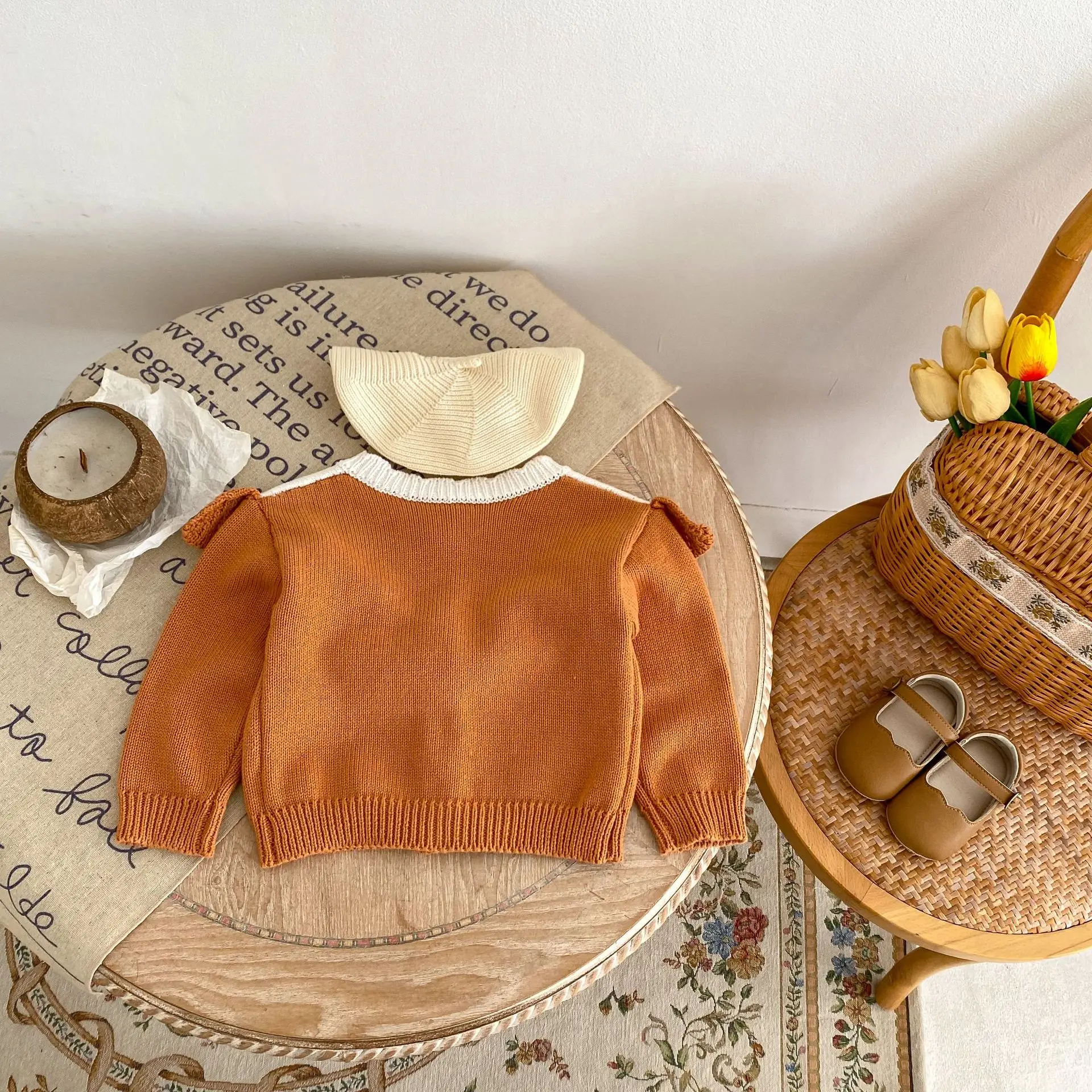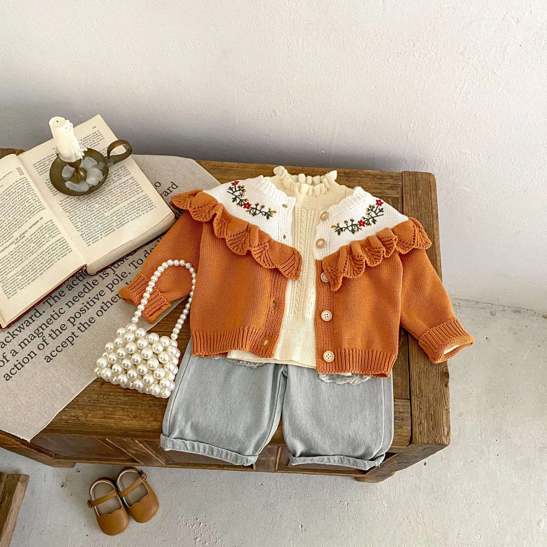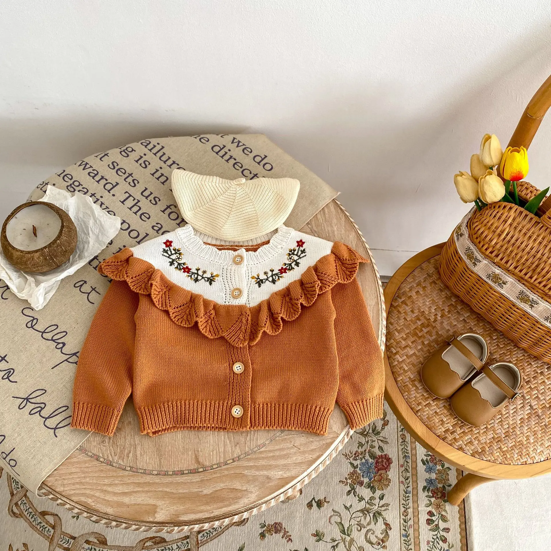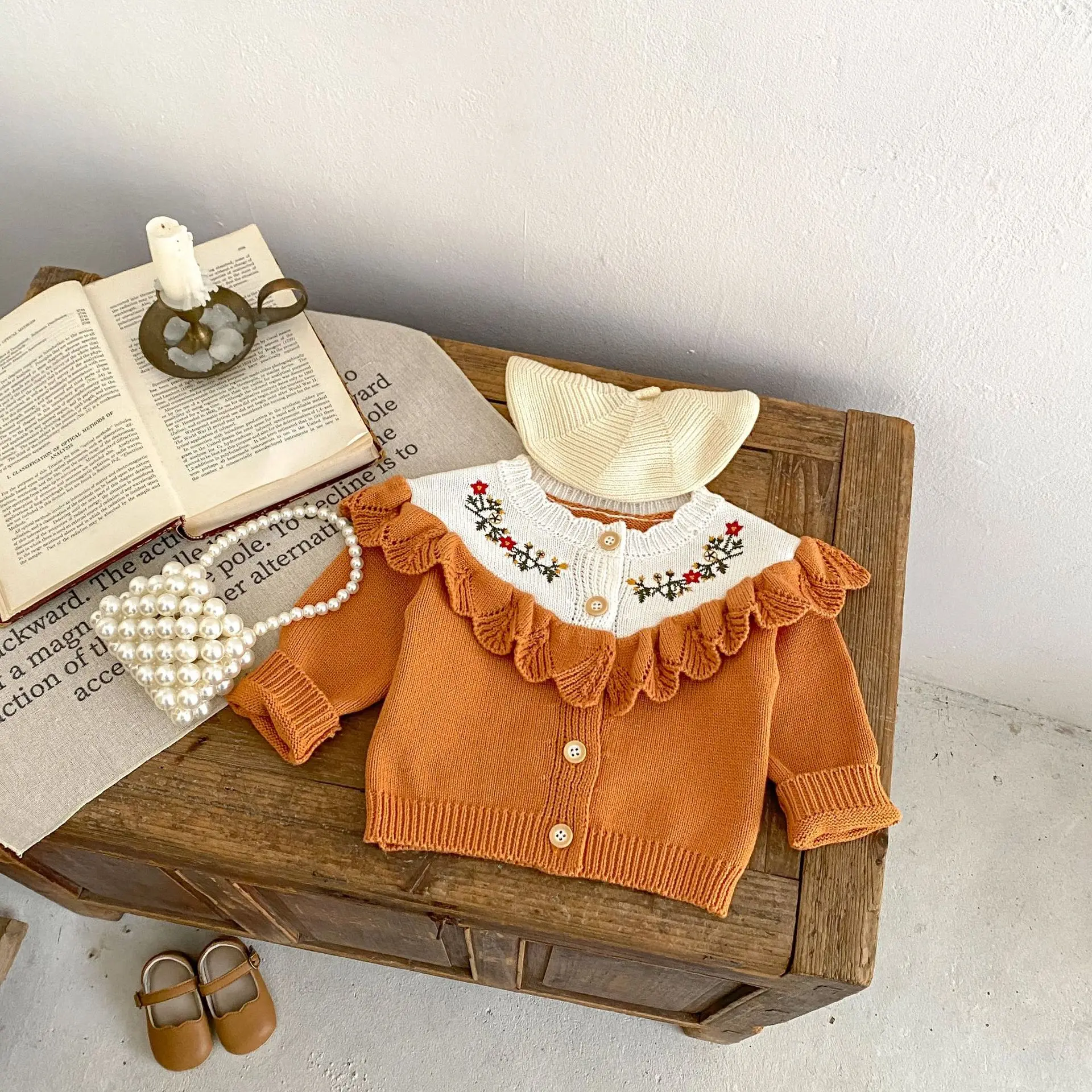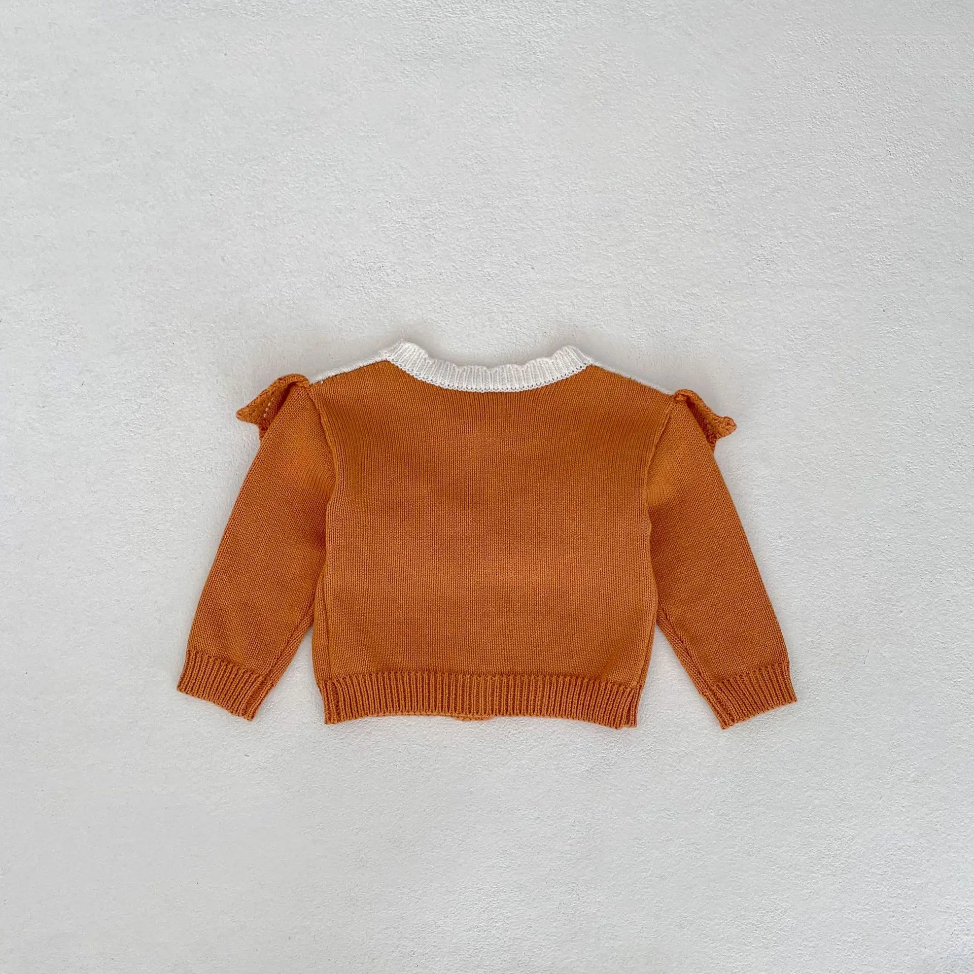 A baby cardigan that will keep you warm even on cool autumn days. The cute floral embroidery design and elegant ruffle frills give it a stylish impression. The high-quality knit material is soft to the touch and protects your child's style. The vibrant orange color will help develop your child's sense of fashion.