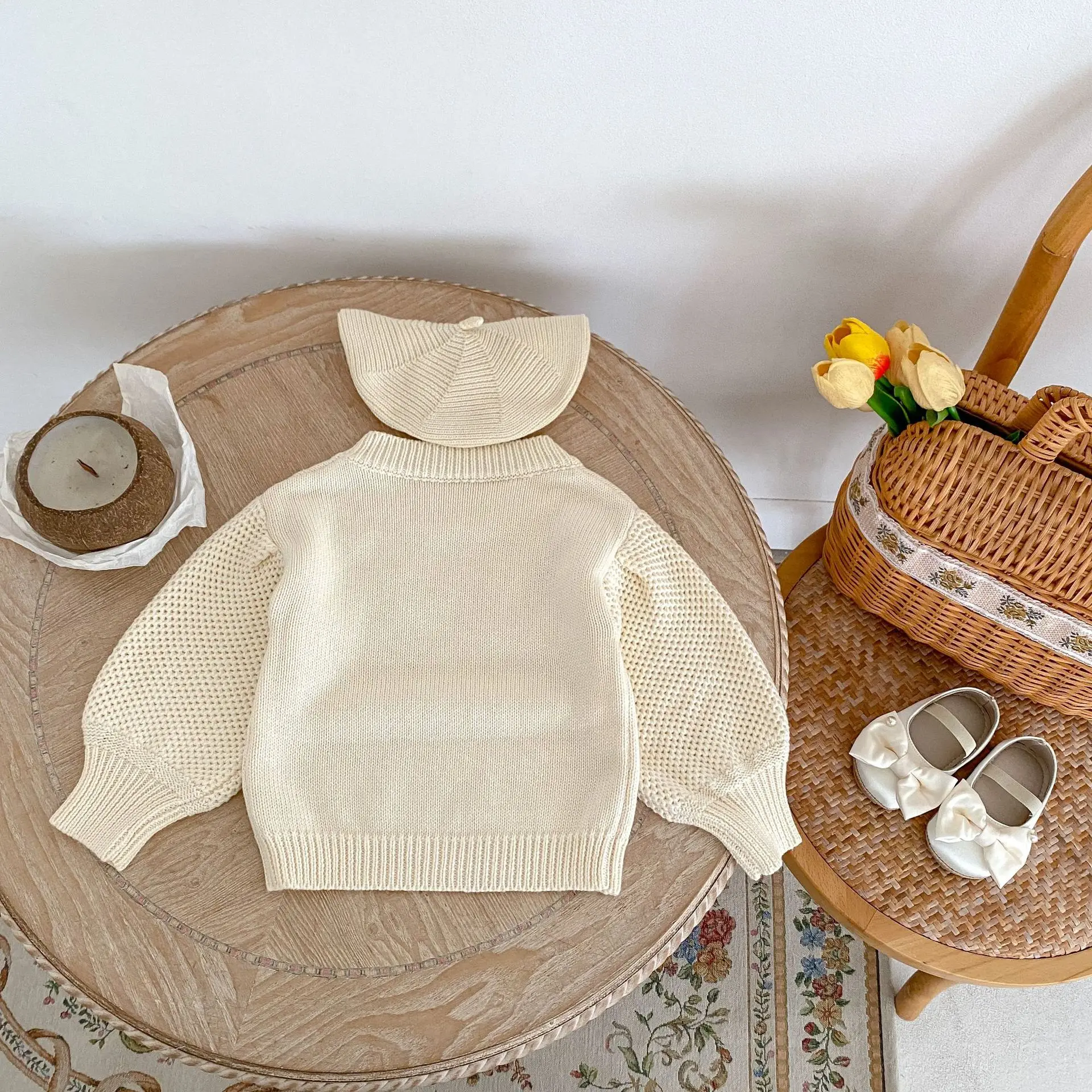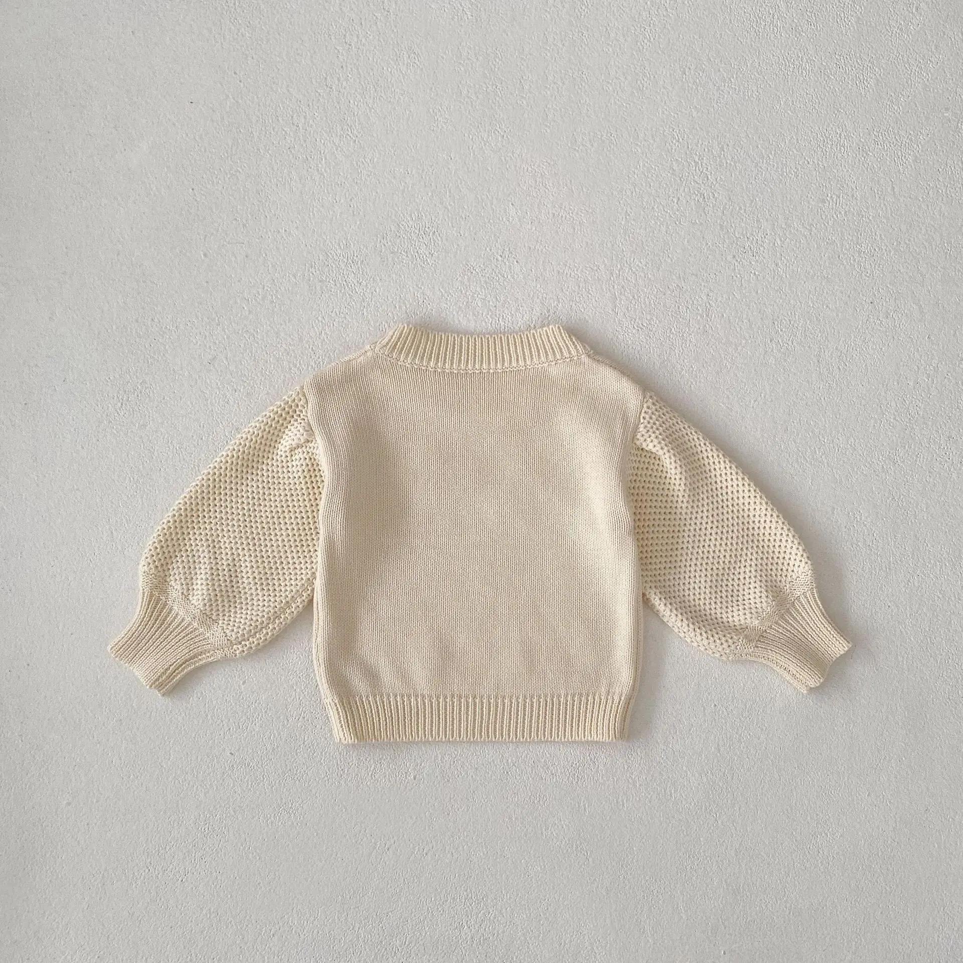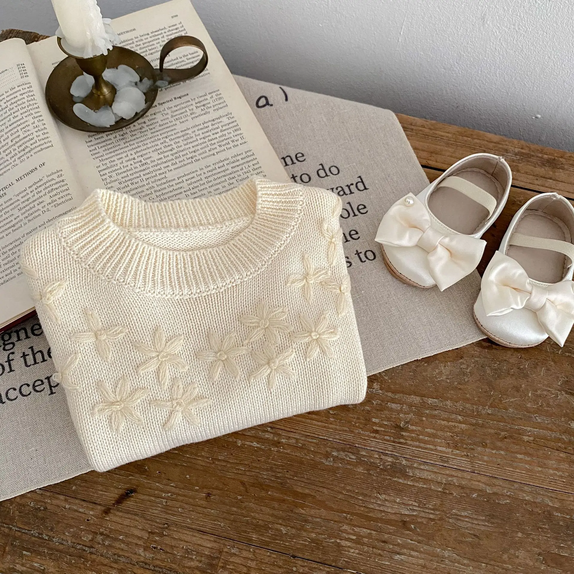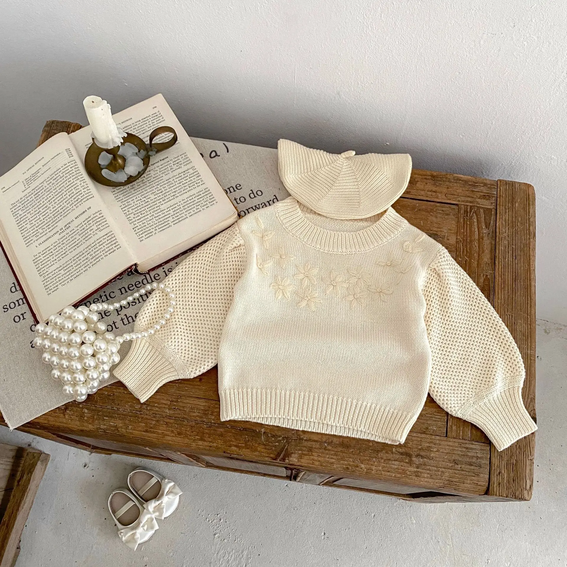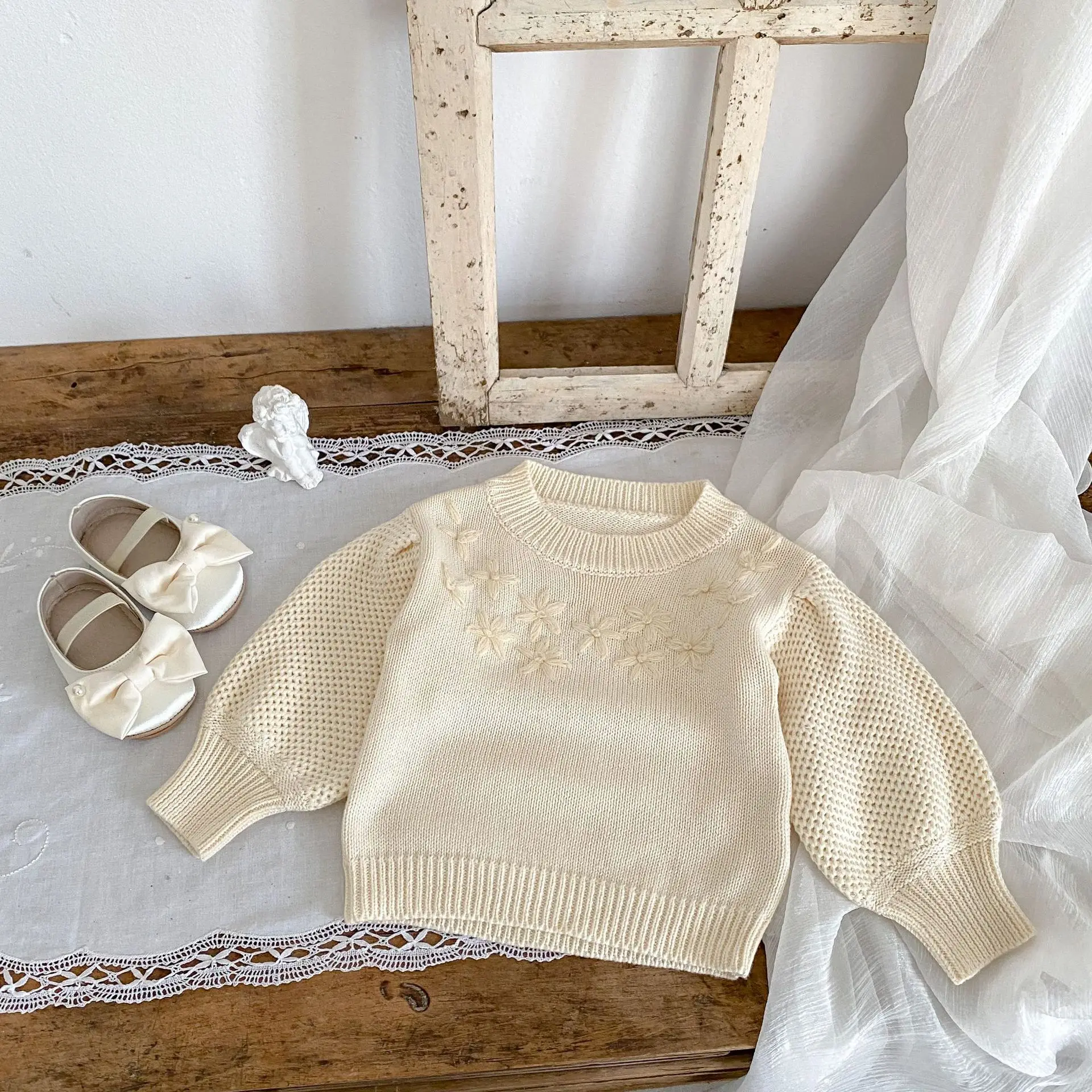 Baby top knit sweater with flower embroidery in apricot white [mh0006410]
