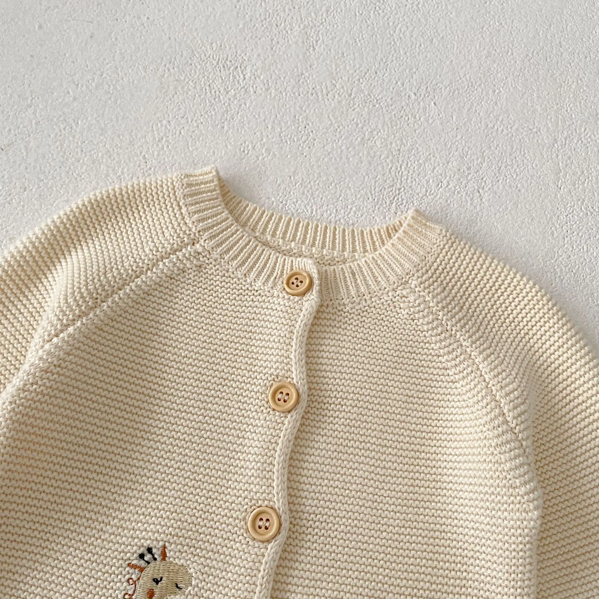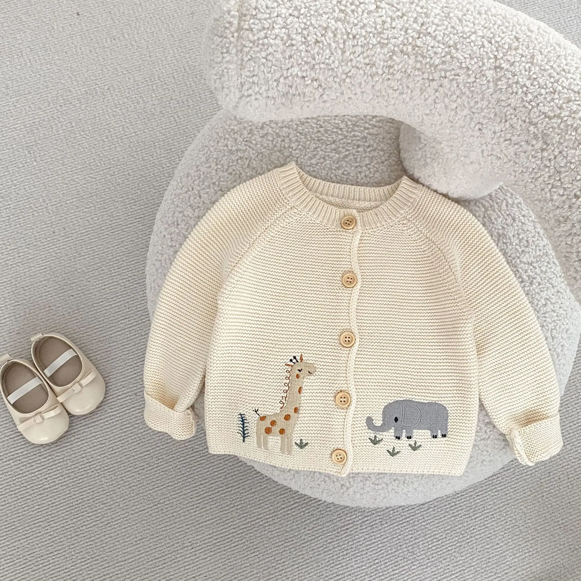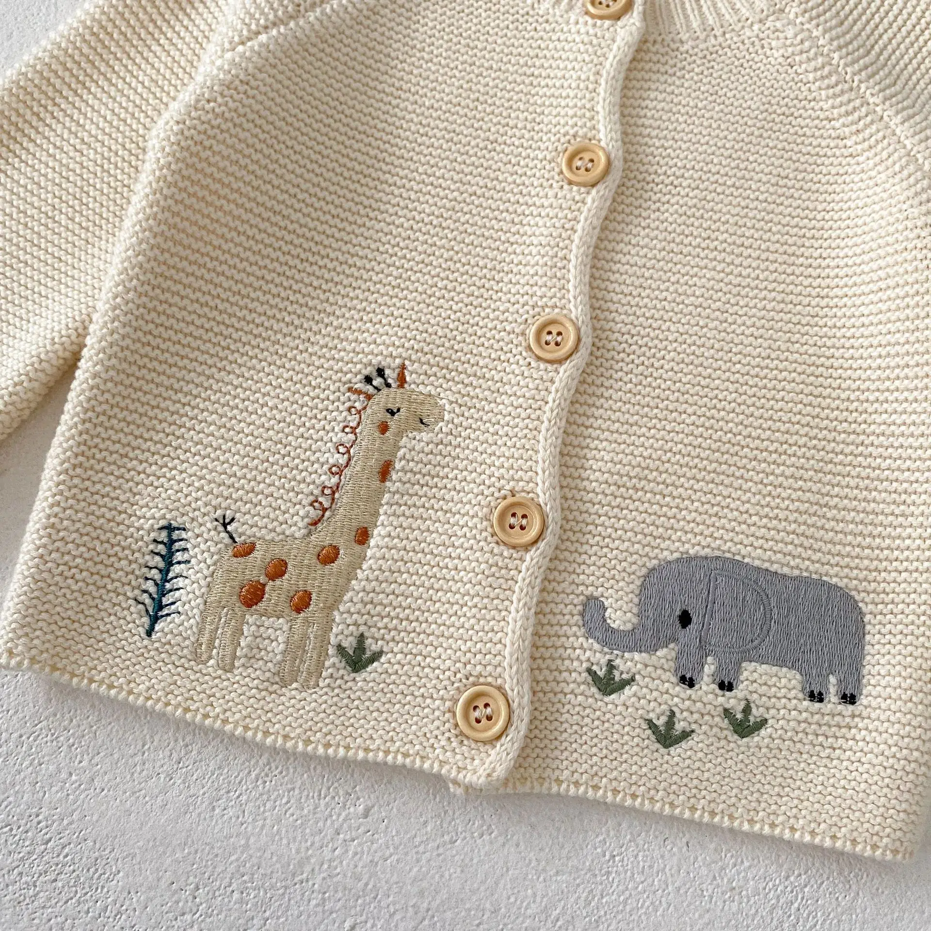 Baby cardigan knit jacket with animal embroidery featuring elephants and giraffes in apricot and white [mh0006412]
