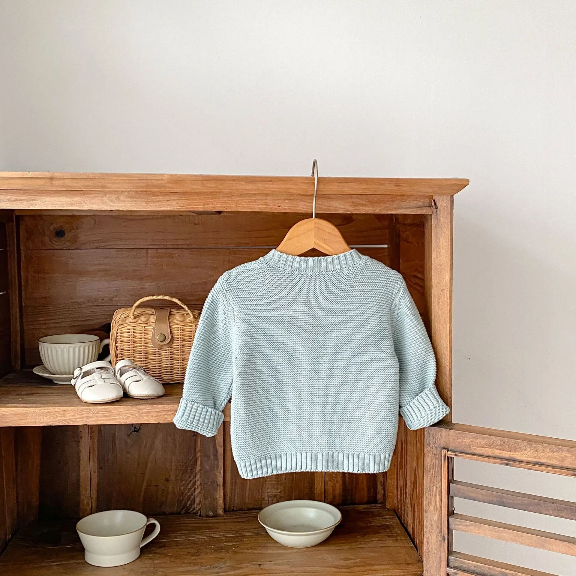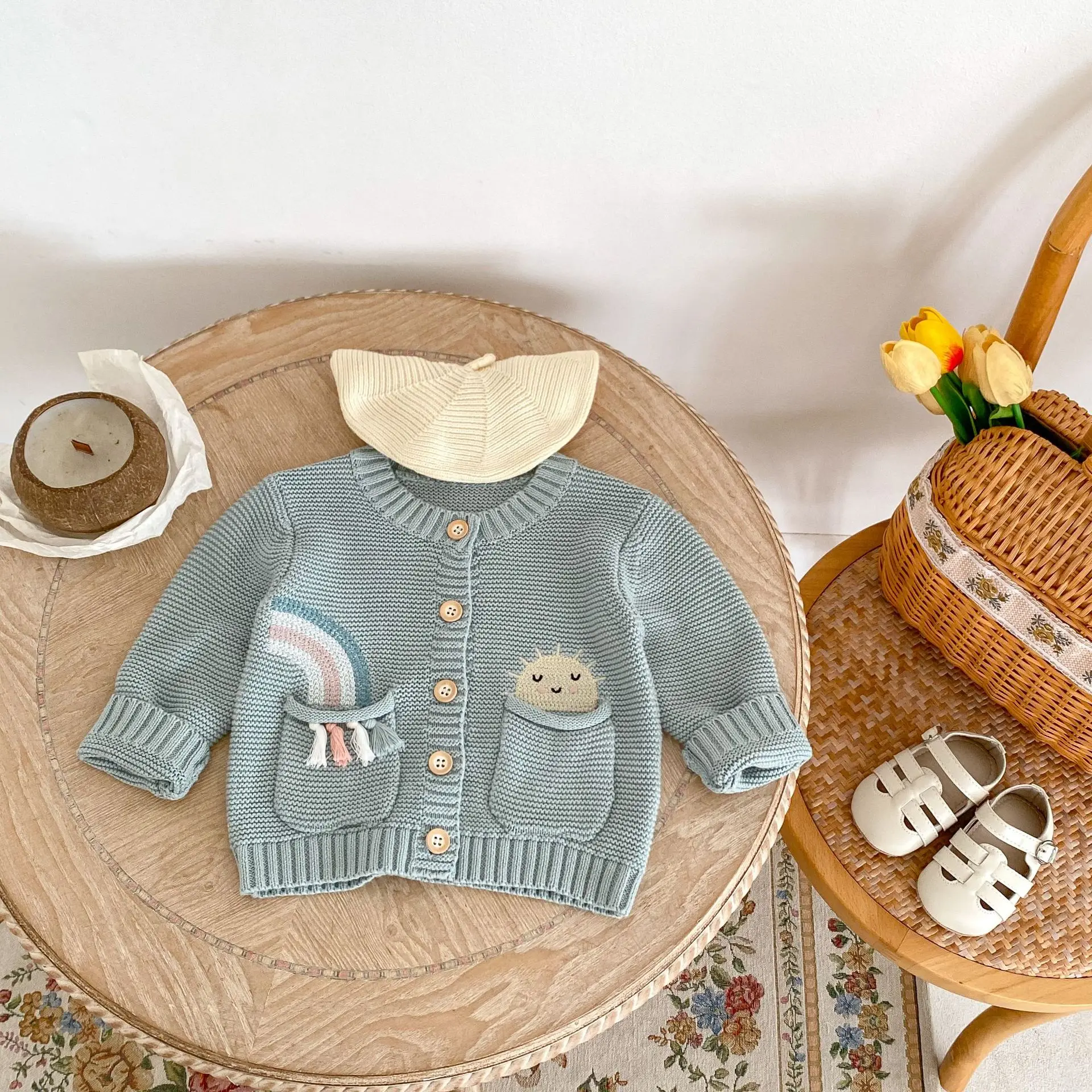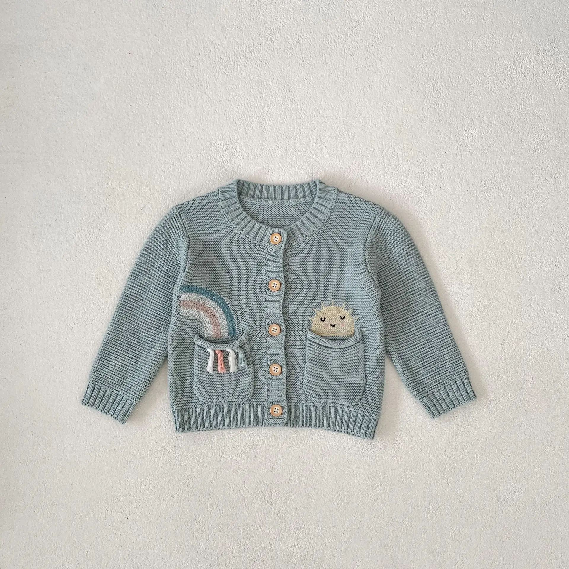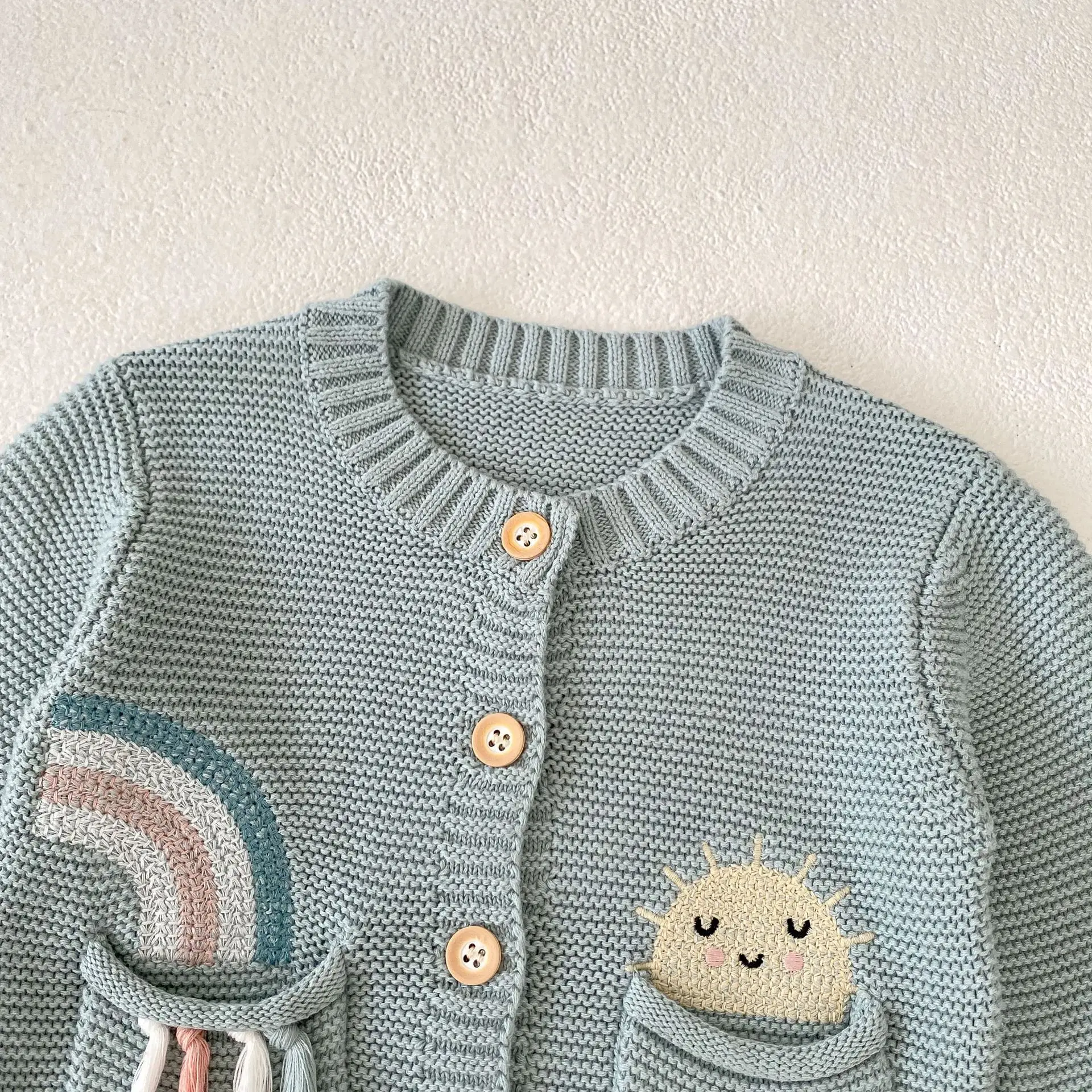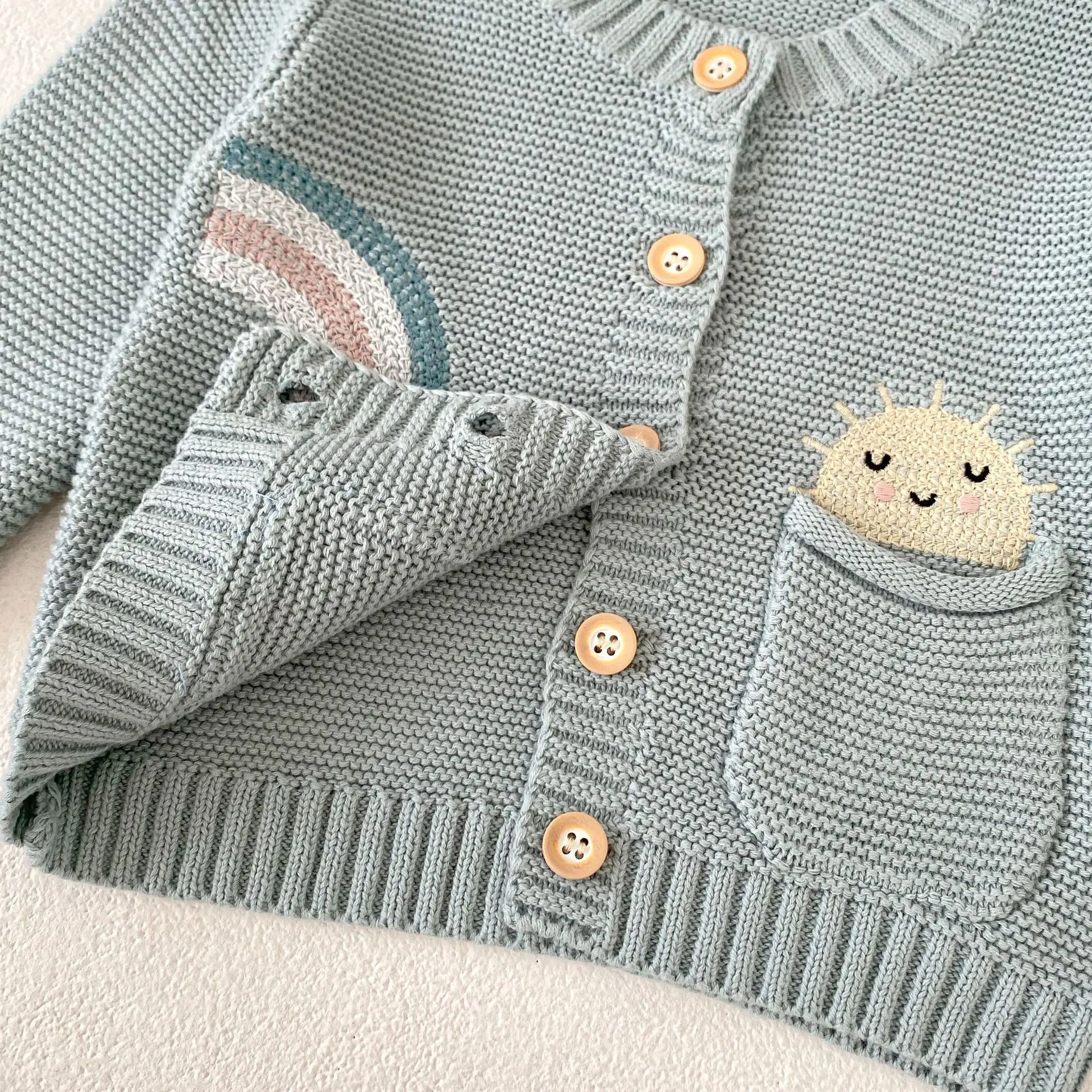 A baby cardigan that combines elegance and glamour. The embroidered rainbow is perfect for autumn, and will add color to your child's fashion. It also has pockets for practicality, and the soft cotton material keeps you warm. This high-quality knit jacket is perfect for stylish babies.