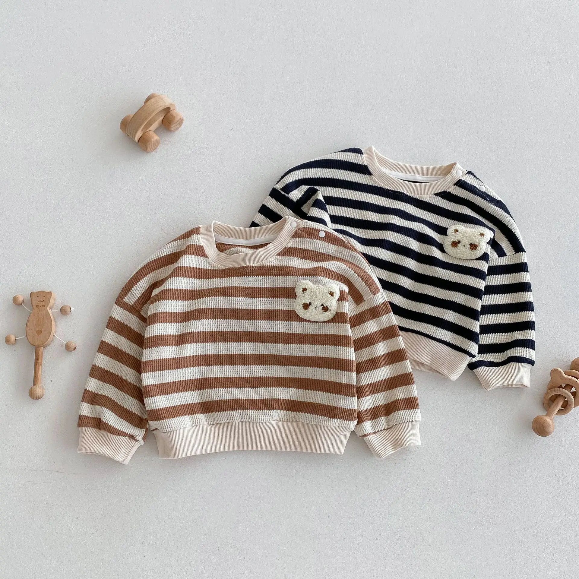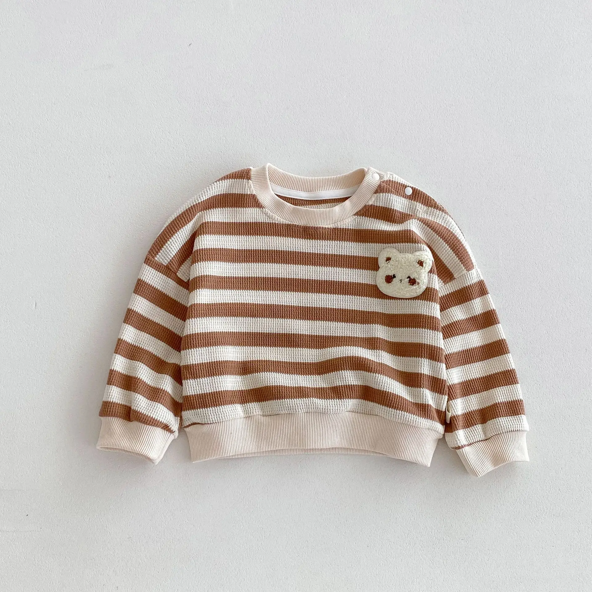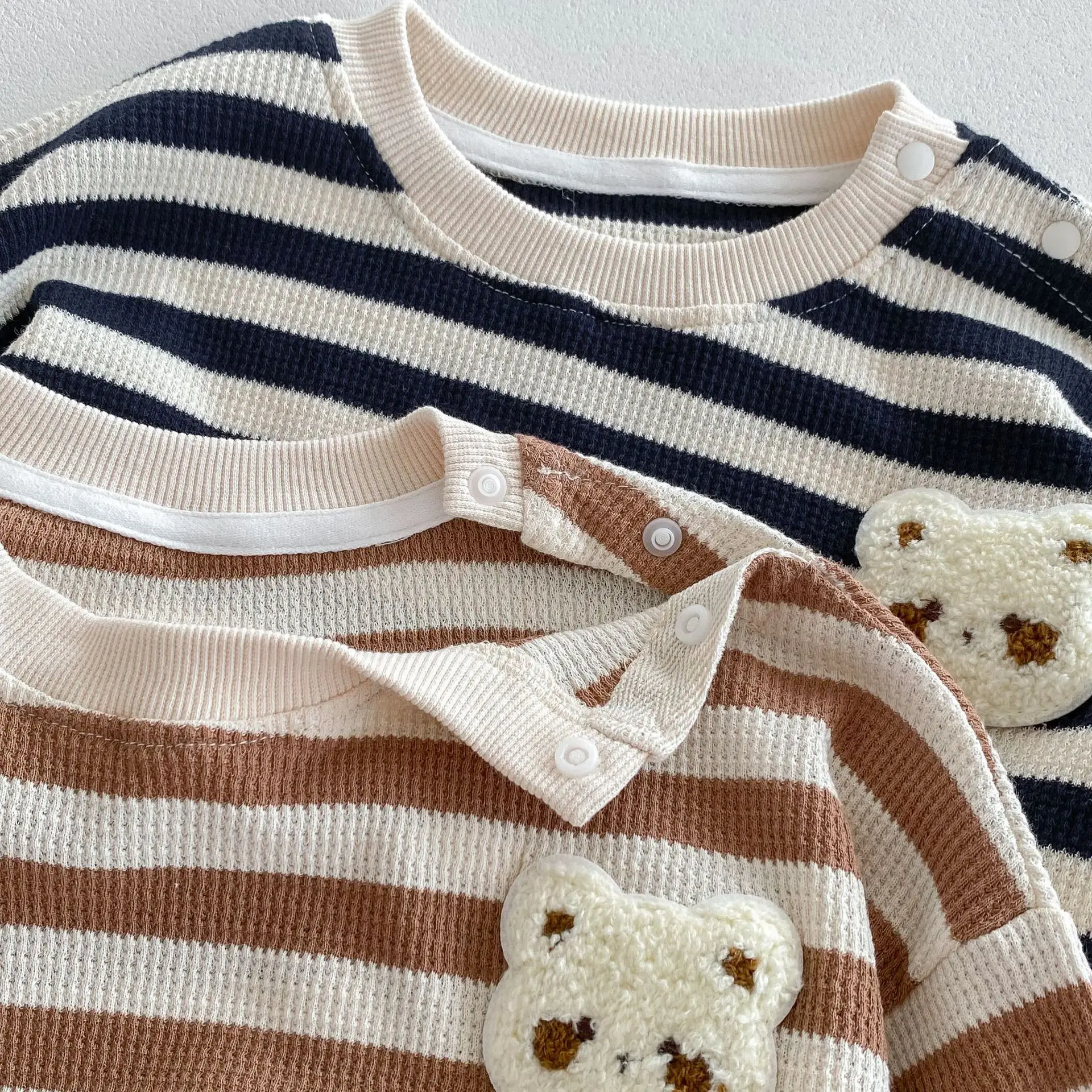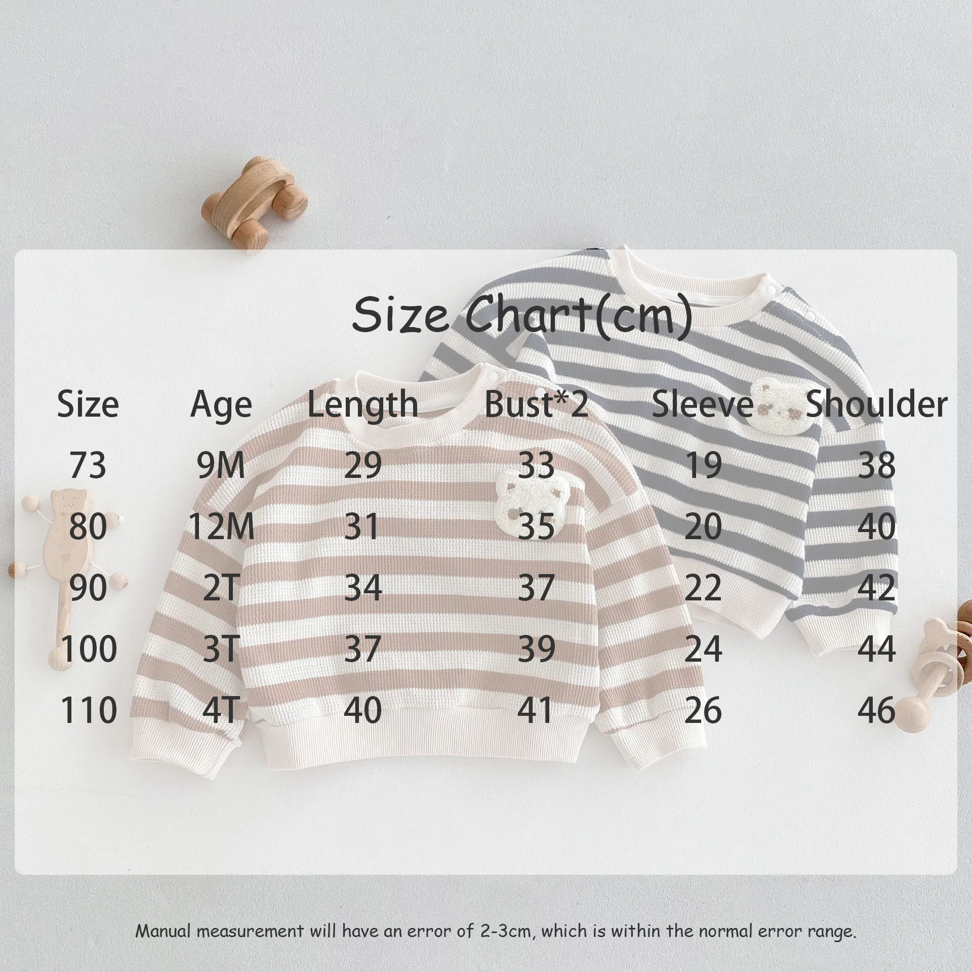 A long sleeve striped T-shirt with a cute bear print, perfect for fall, suitable for boys and girls ages 0-4. The loose O-neck design is made to keep your child comfortable. It's a free and casual style for kids.
