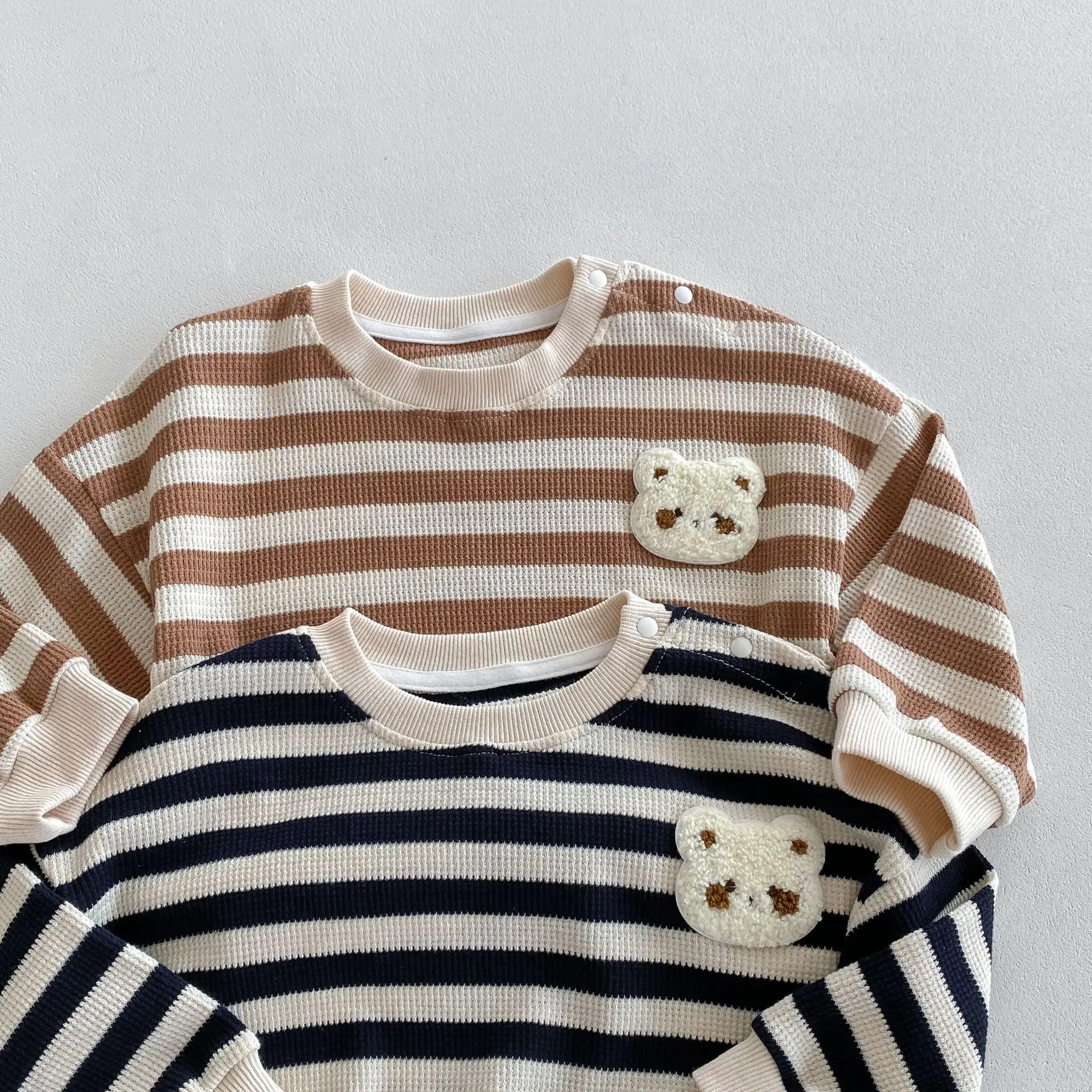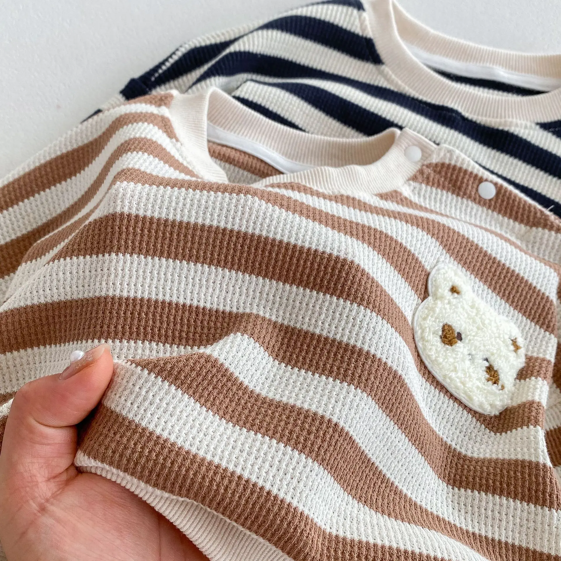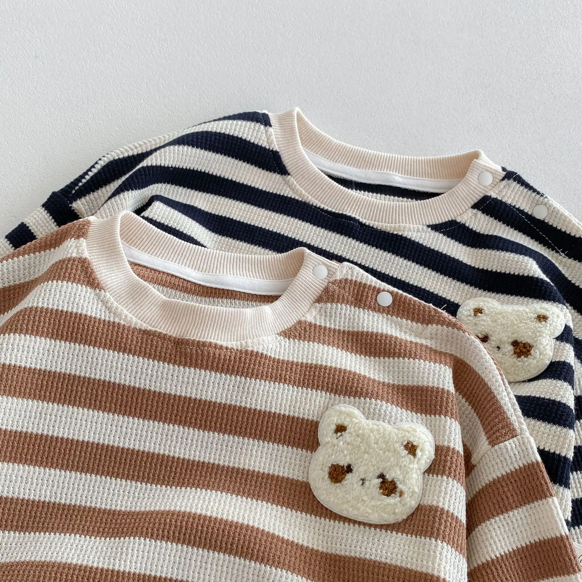 A long sleeve striped T-shirt with a cute bear print, perfect for fall, suitable for boys and girls ages 0-4. The loose O-neck design is made to keep your child comfortable. It's a free and casual style for kids.