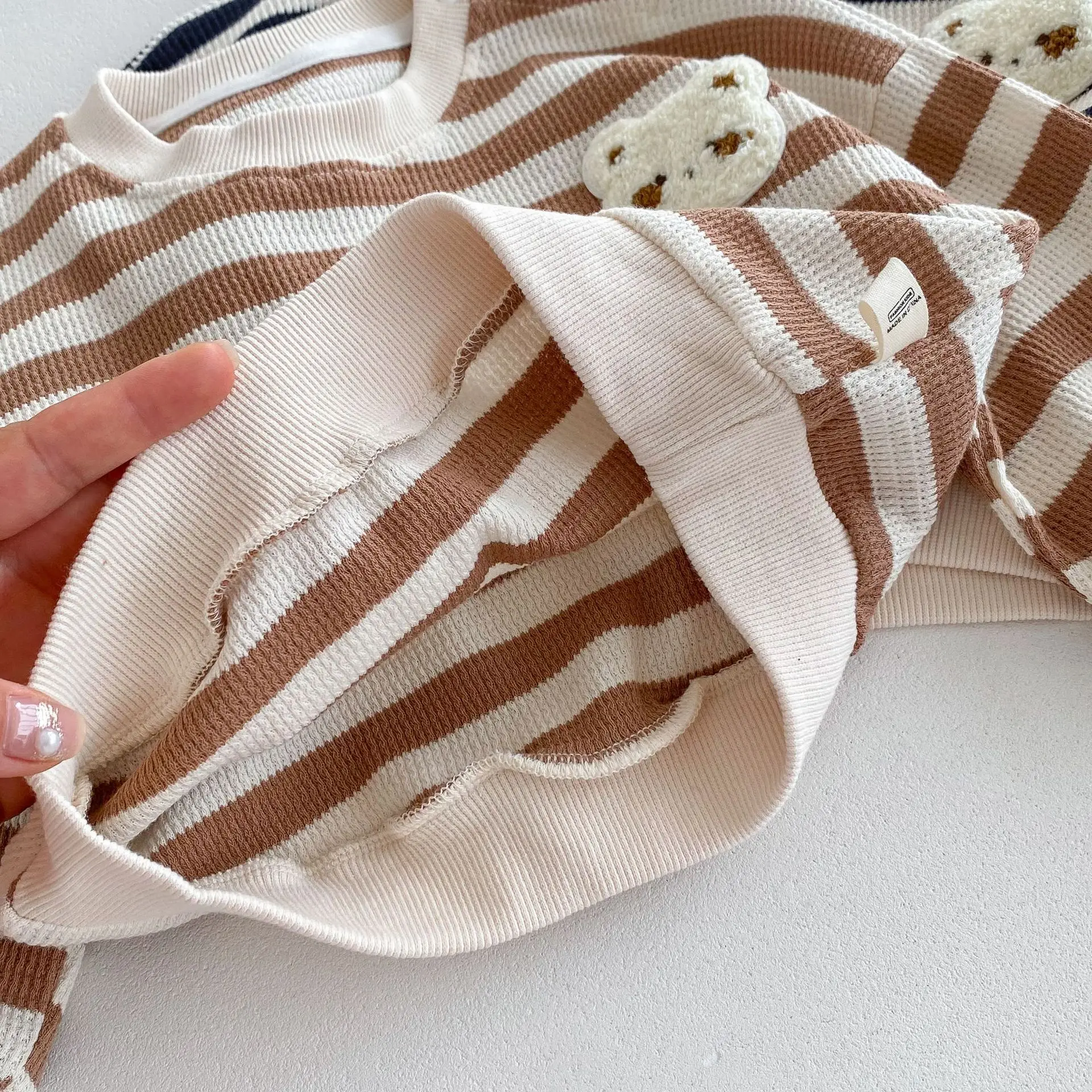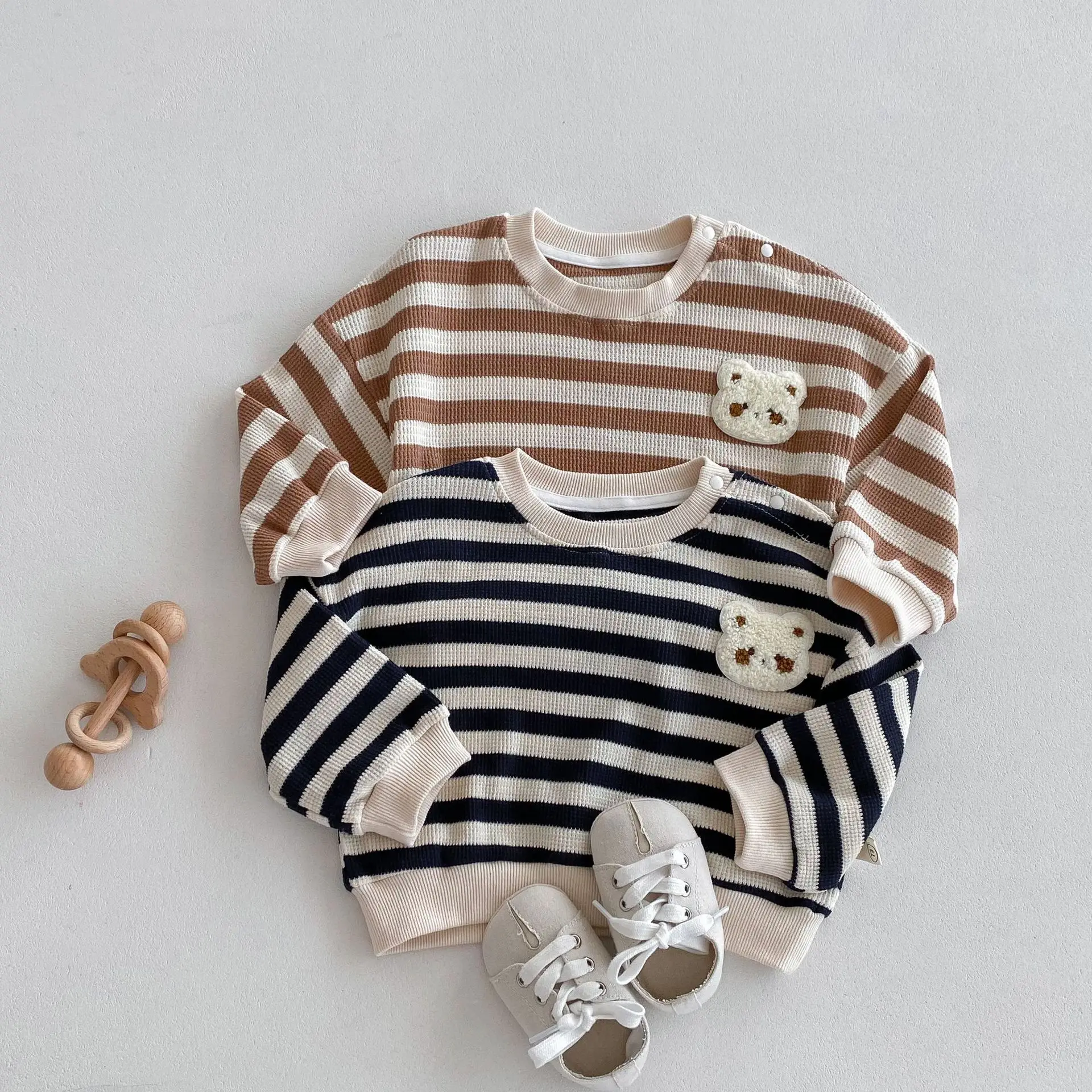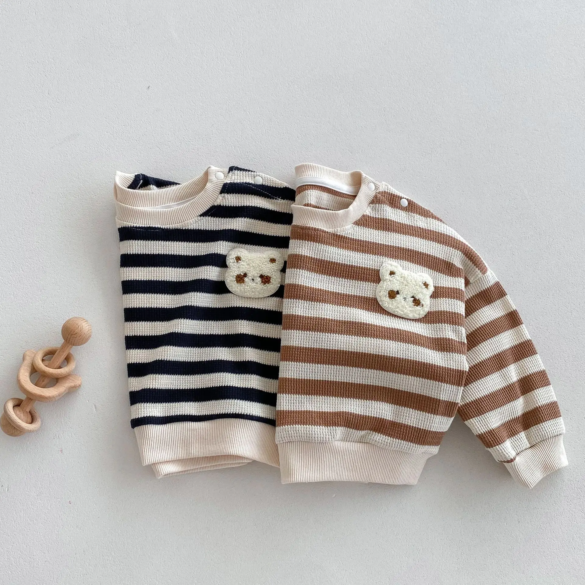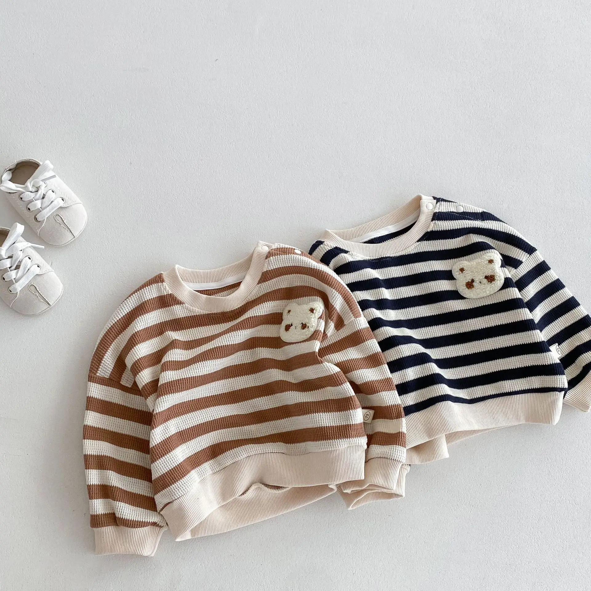A long sleeve striped T-shirt with a cute bear print, perfect for fall, suitable for boys and girls ages 0-4. The loose O-neck design is made to keep your child comfortable. It's a free and casual style for kids.