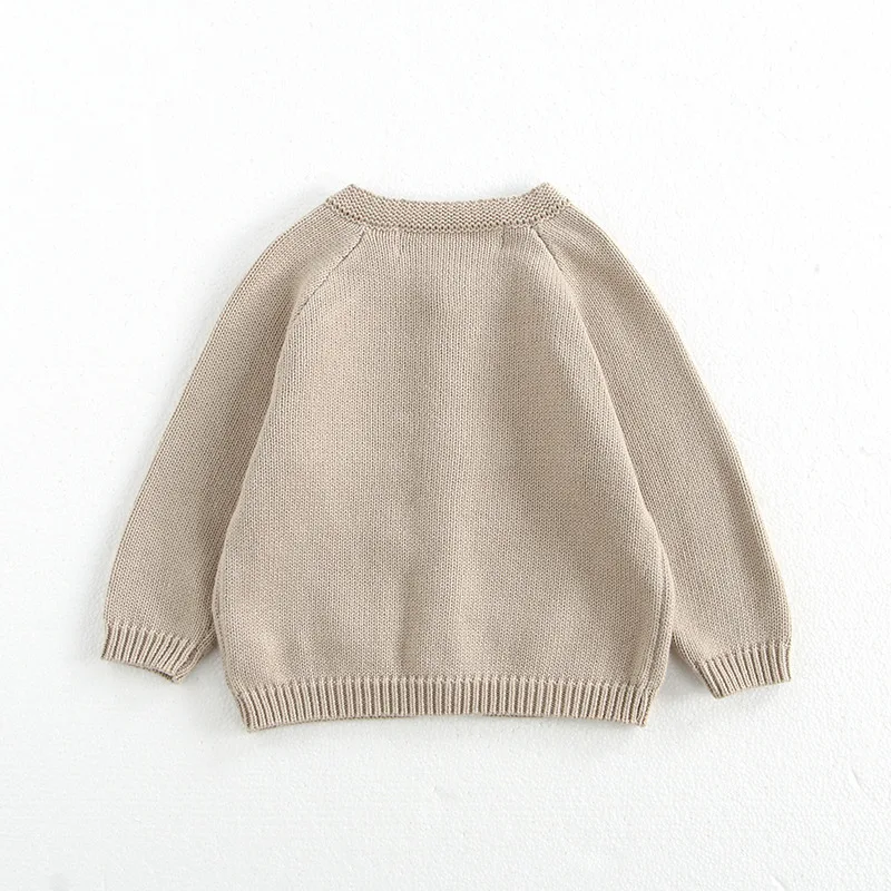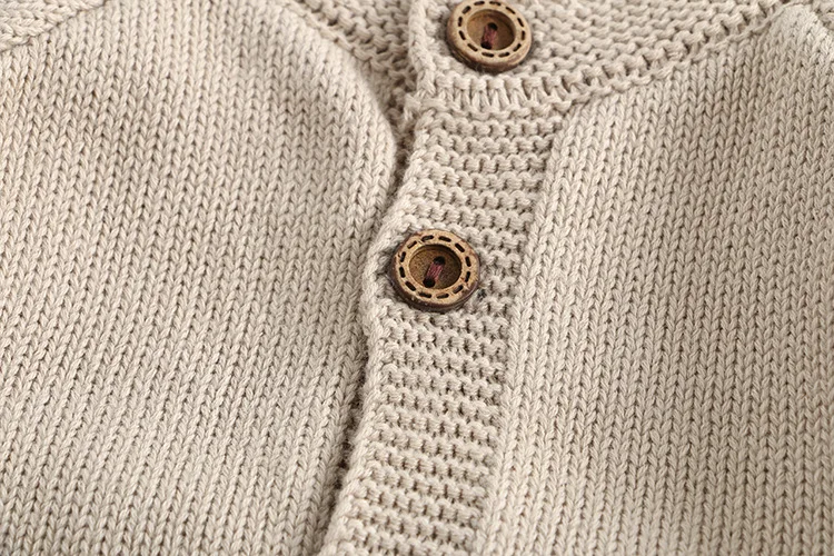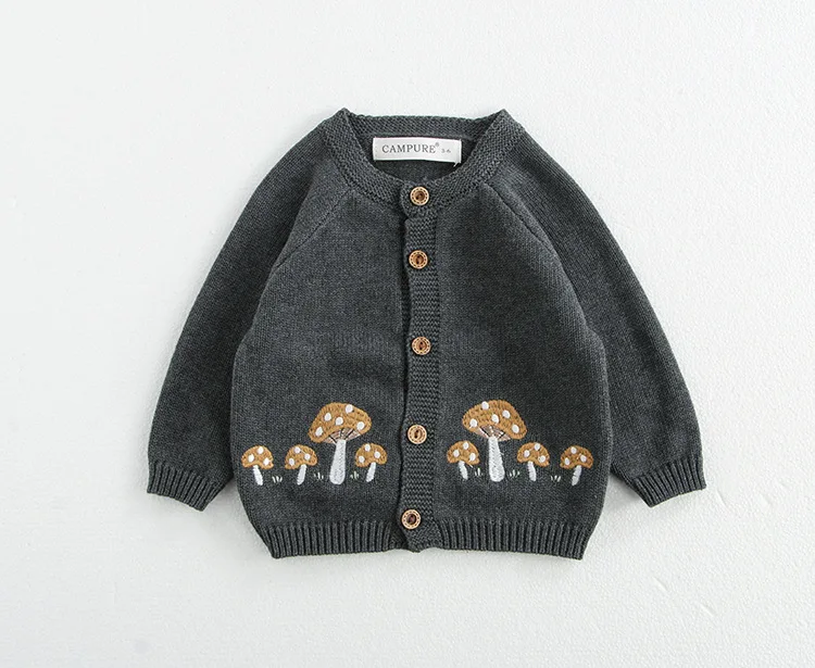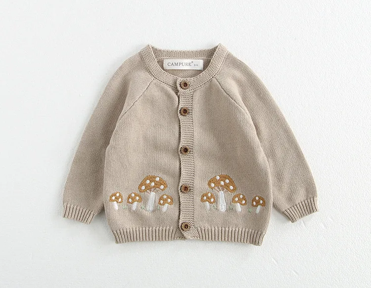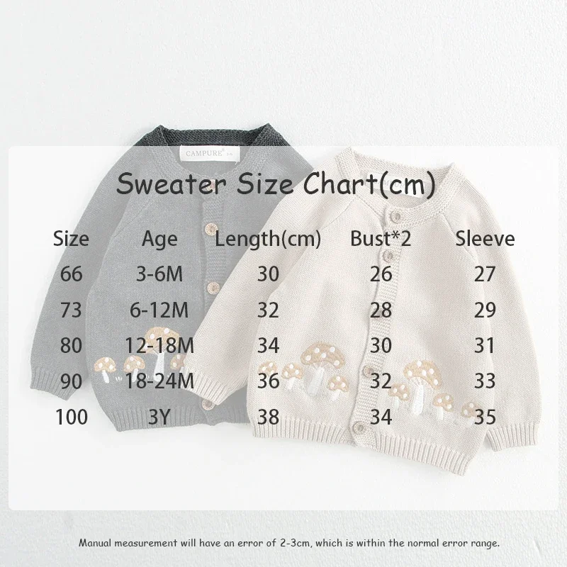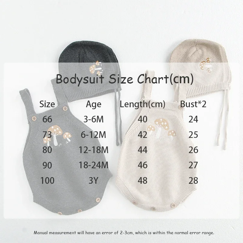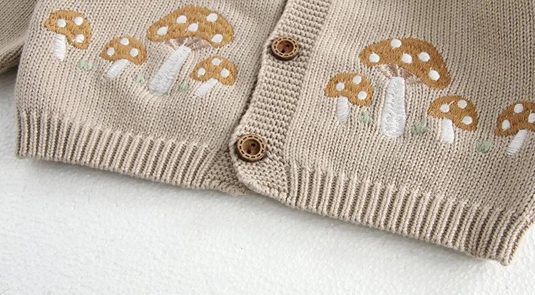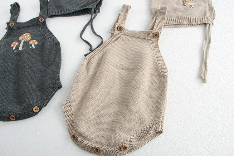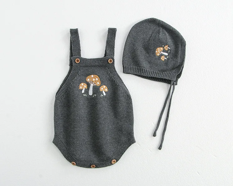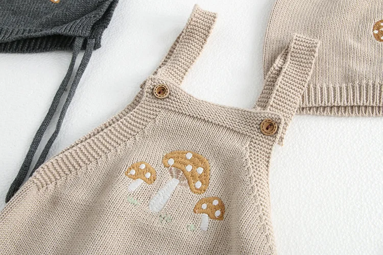 This cardigan and romper set is perfect for your baby. It includes a knitted cardigan jacket with mushroom embroidery, a suspender bodysuit with mushroom embroidery, and a cute bonnet hat. Available in two colors, it will complete your baby's stylish and warm style. The soft knit material is gentle on your baby's skin and provides a comfortable fit.