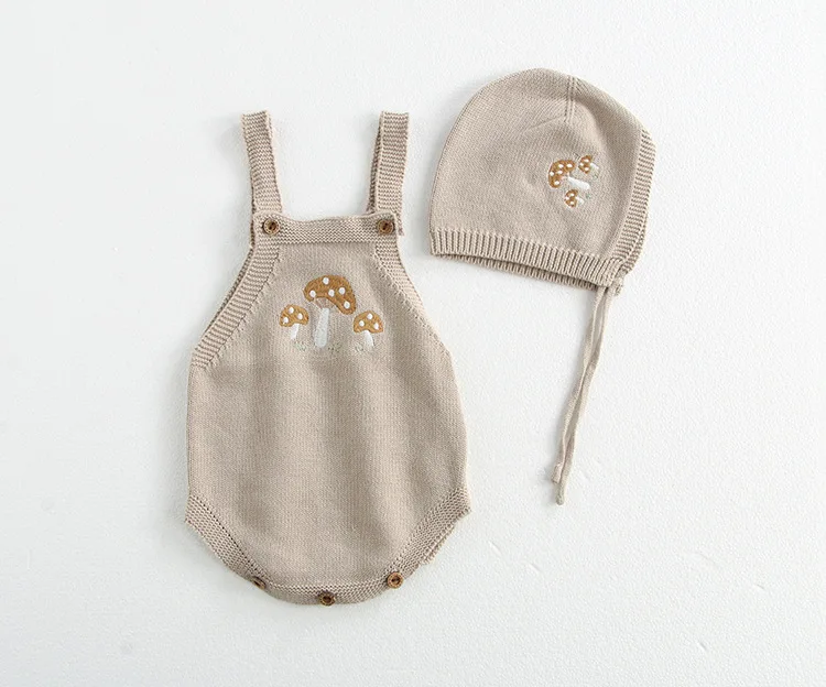 #Baby cardigan #Romper set #Mushroom embroidery #Knitted cardigan #Suspender bodysuit #Bonnet hat #Baby clothes #2-piece set