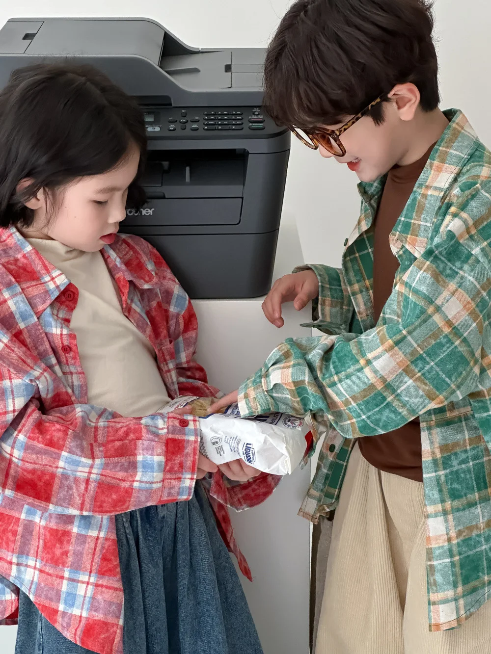 A long-sleeved loose shirt for kids with a trendy check pattern. Perfect for casual styles or for days when you want to look a little more stylish. The loose silhouette ensures ease of movement and makes your child's daily style even more comfortable. There are two colors to choose from, each with a different look. The simple collar adds a neat look and is great as a shirt or a jacket. It goes well with denim and skirts, and is extremely versatile. A must-have item for everyday use in your wardrobe. Also recommended as a gift.