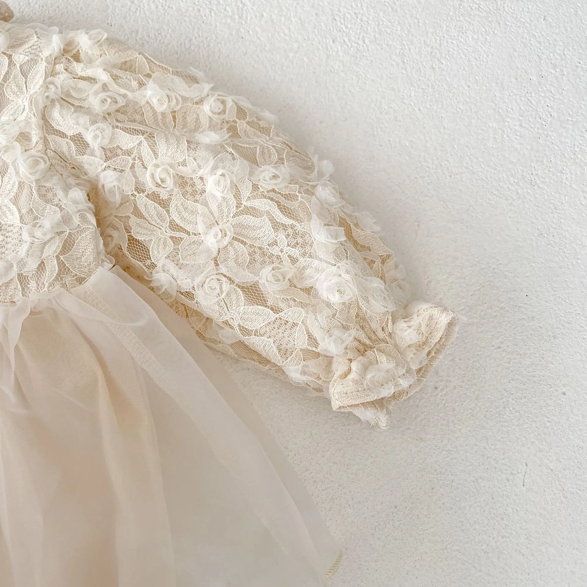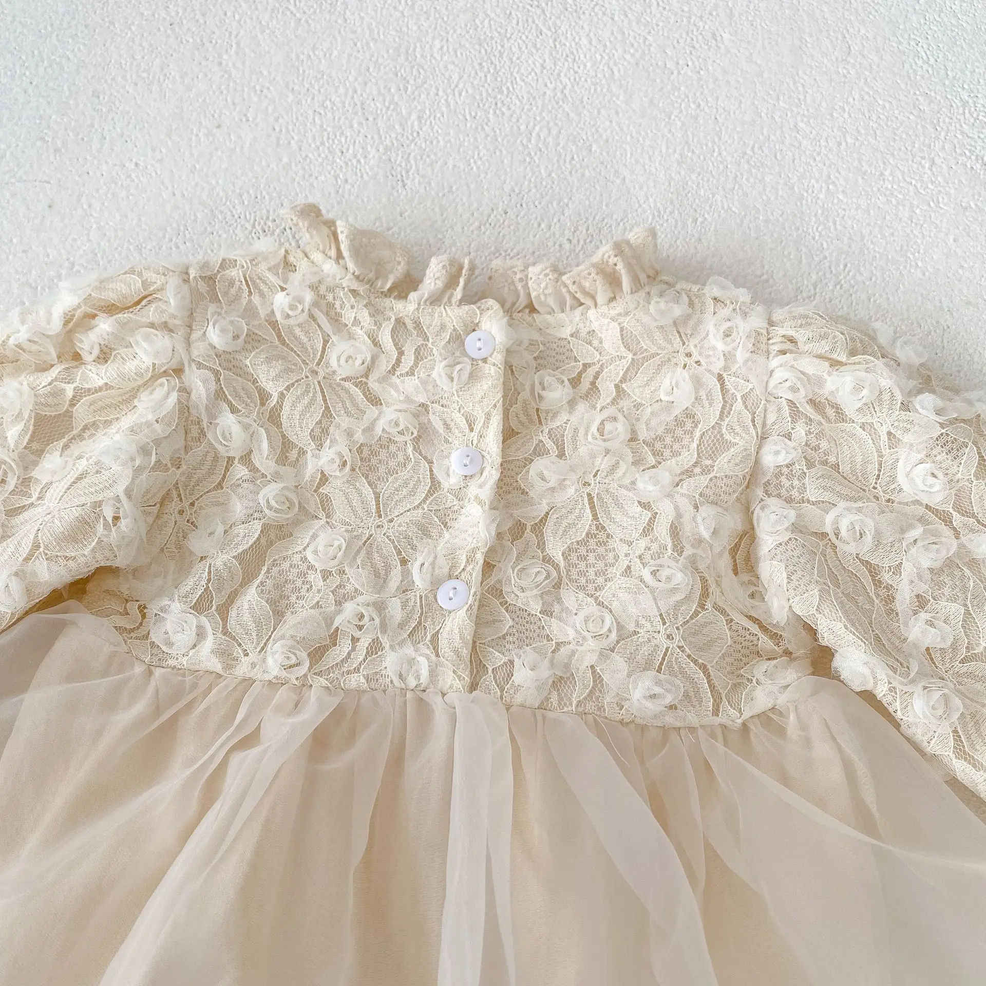 A long-sleeved dress romper with a docking design featuring a cute stand-up ruffle collar and tutu skirt. The apricot color creates a soft and gentle atmosphere. The lace and ruffle details are the highlights, and the 3D flower decorations add to the cuteness. Made from comfortable materials, this dress is both stylish and comfortable to wear. This baby princess style is perfect for special occasions and outings.