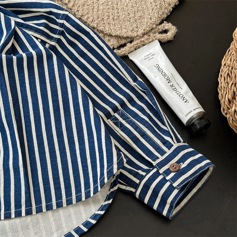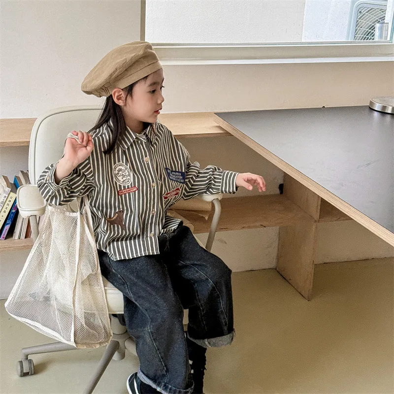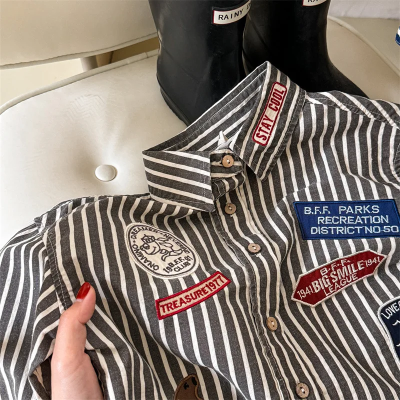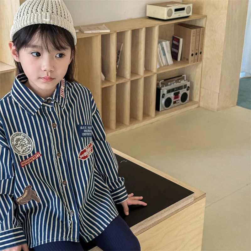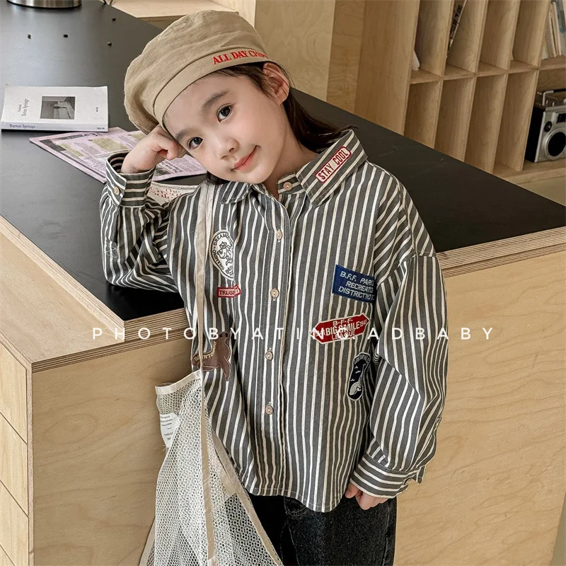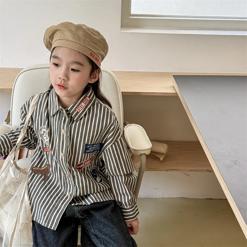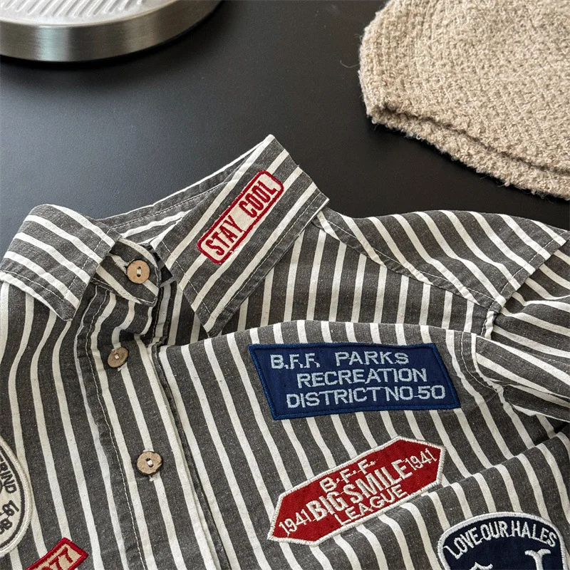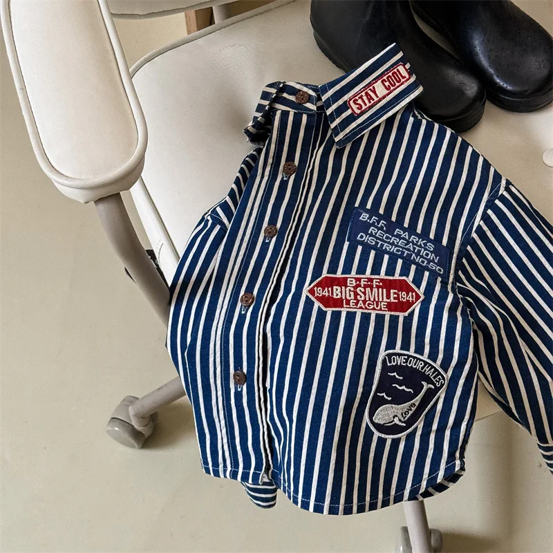 A kids' long-sleeved shirt featuring a striped pattern and embroidered patch. The casual yet playful design gives a stylish impression. Available in two colors, it is easy to match with any outfit and is perfect for the fall season. The soft material and long sleeve design provide a comfortable fit, making it ideal for active children. The buttoned front and detailed embroidery add an accent to your everyday style.