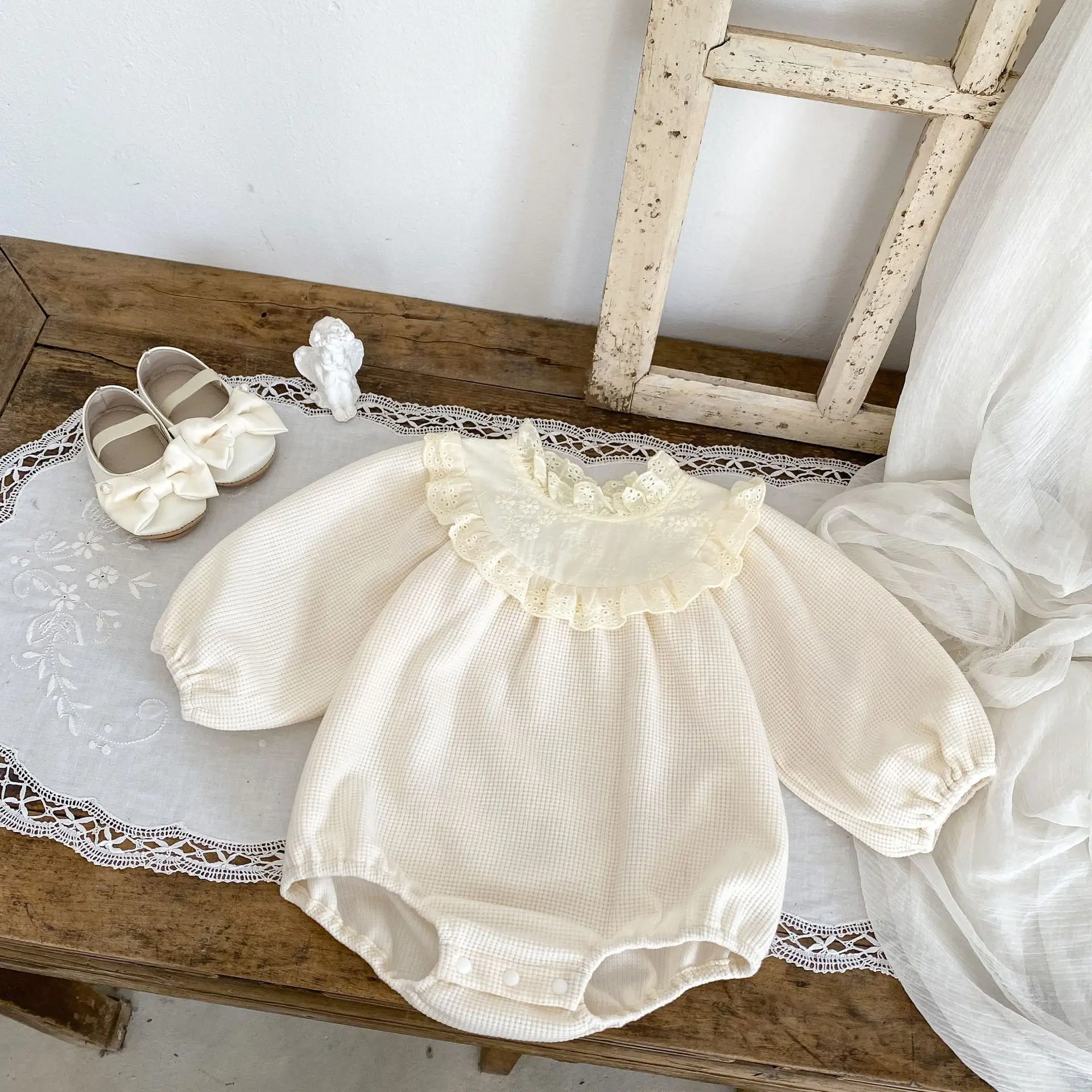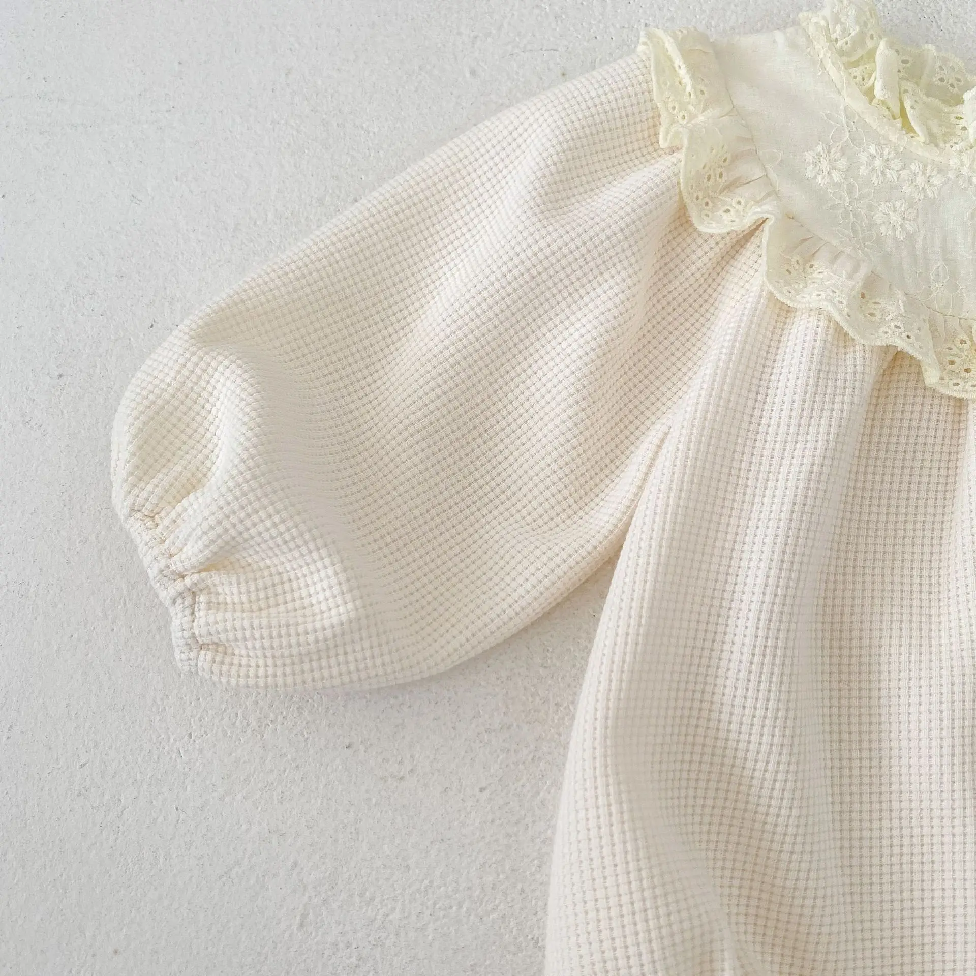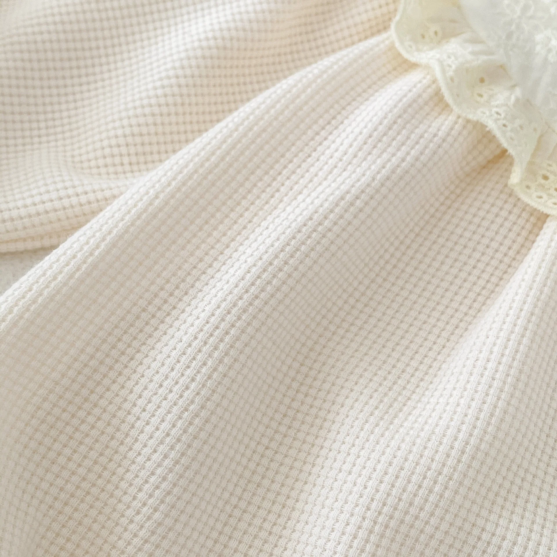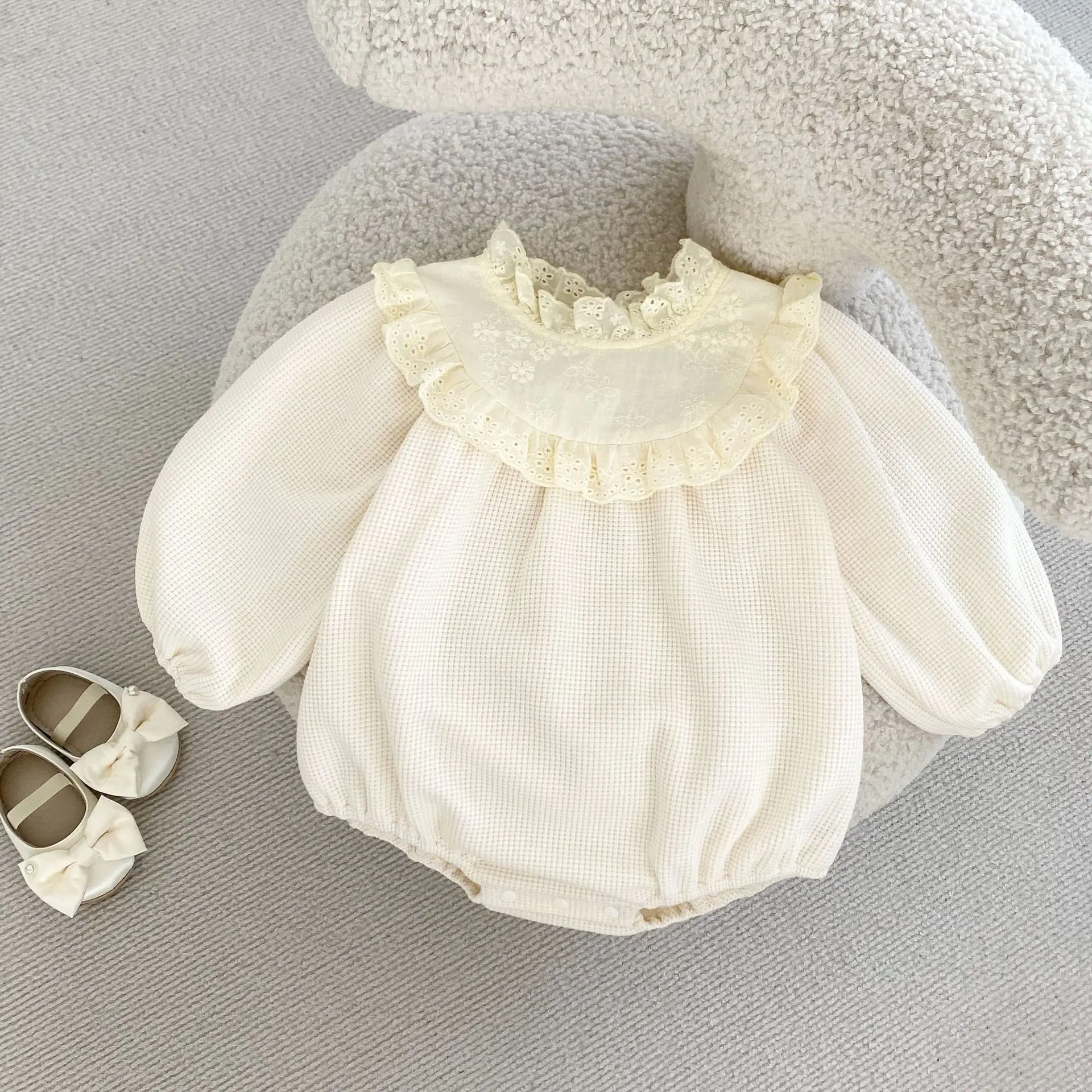 #Baby rompers #Lace details #Waffle fabric #Long sleeve bodysuit #Stand collar #Autumn outfit #Korean baby clothes #Newborn clothes
