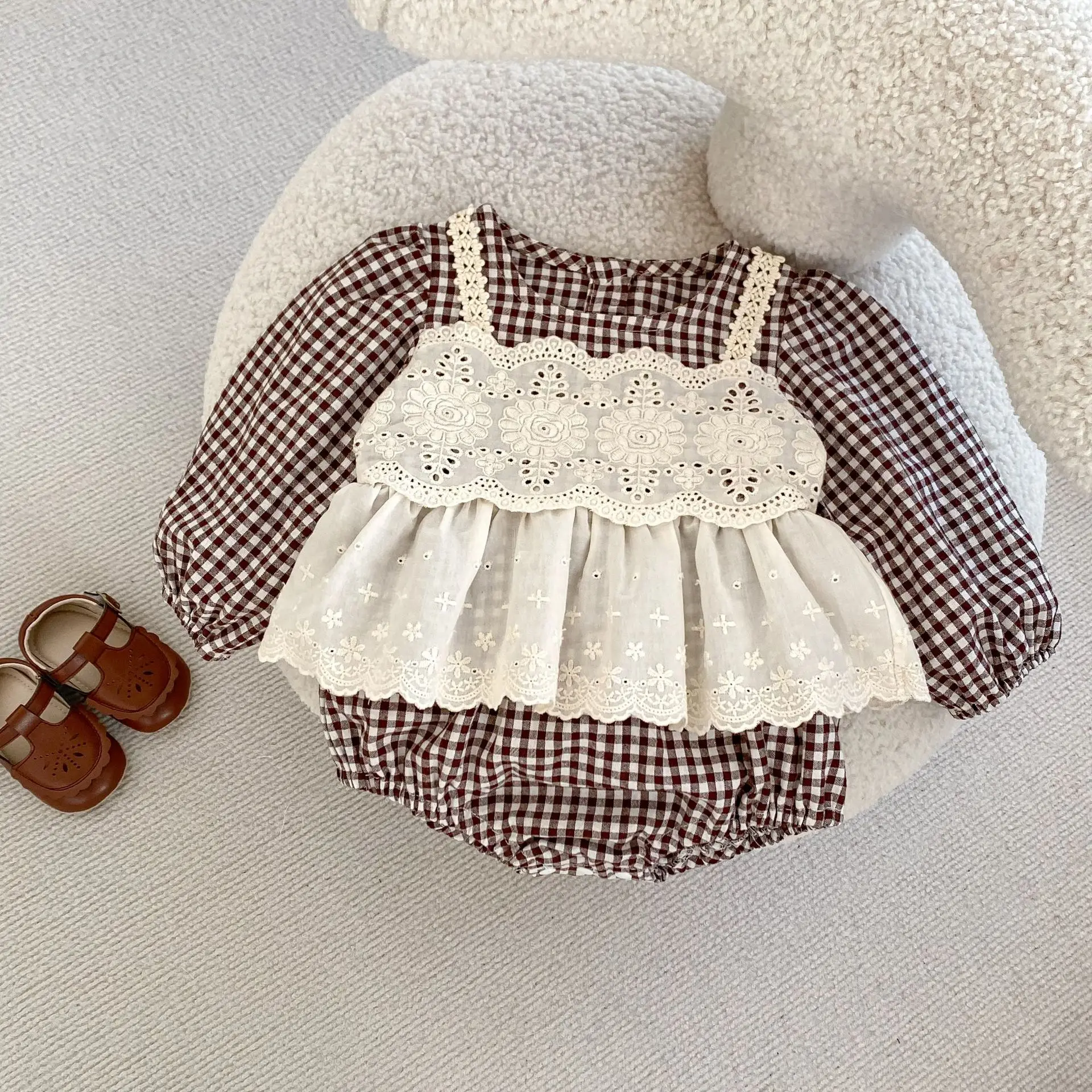 Baby romper with lace apron and check pattern, long-sleeved bodysuit [mh0007182]