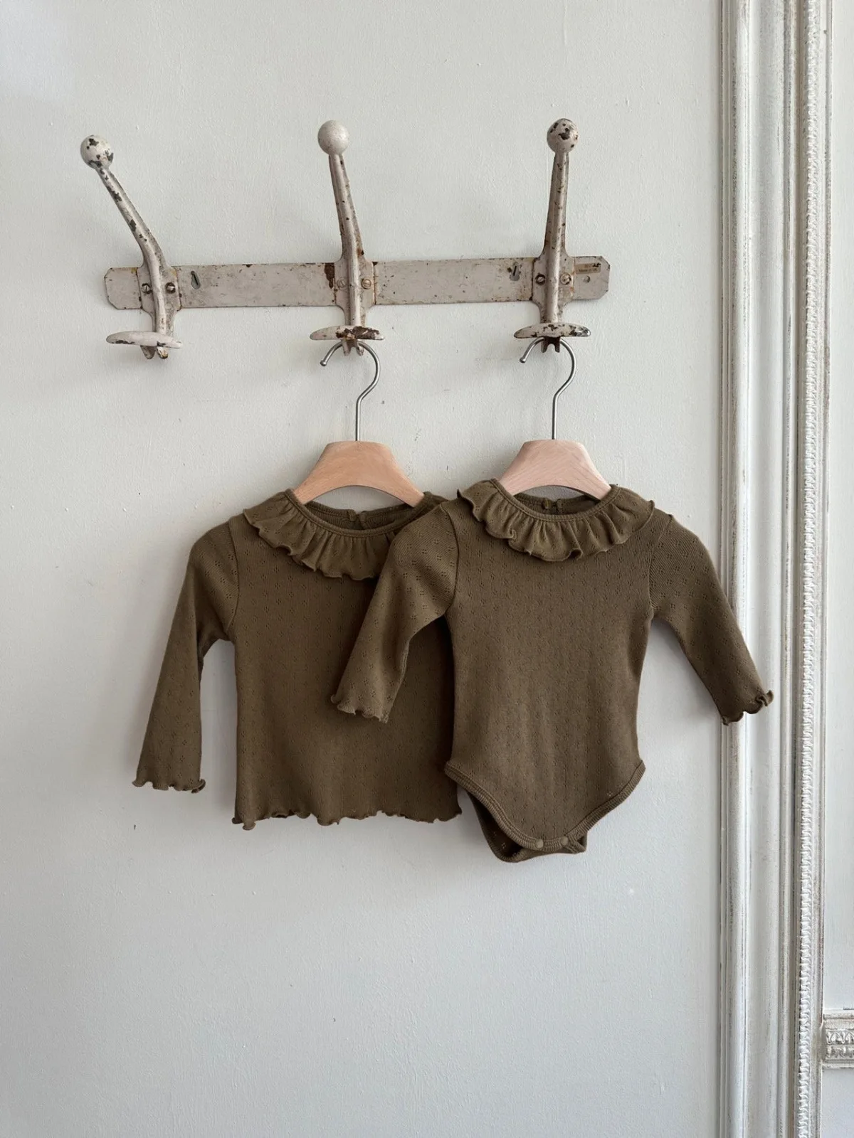 This simple long-sleeved T-shirt with a cute ruffled collar is a baby item that is easy to use for daily outfits. The soft cotton material gently wraps around your baby's skin, making it comfortable to wear for long periods of time. Although it is simple, the ruffled collar accents the design, making it a piece that can be worn casually or stylishly. Available in three colors, each color is easy to incorporate into your outfit and is perfect for the fall season. It is easy to use and can be used for a wide range of occasions, from everyday use to going out.