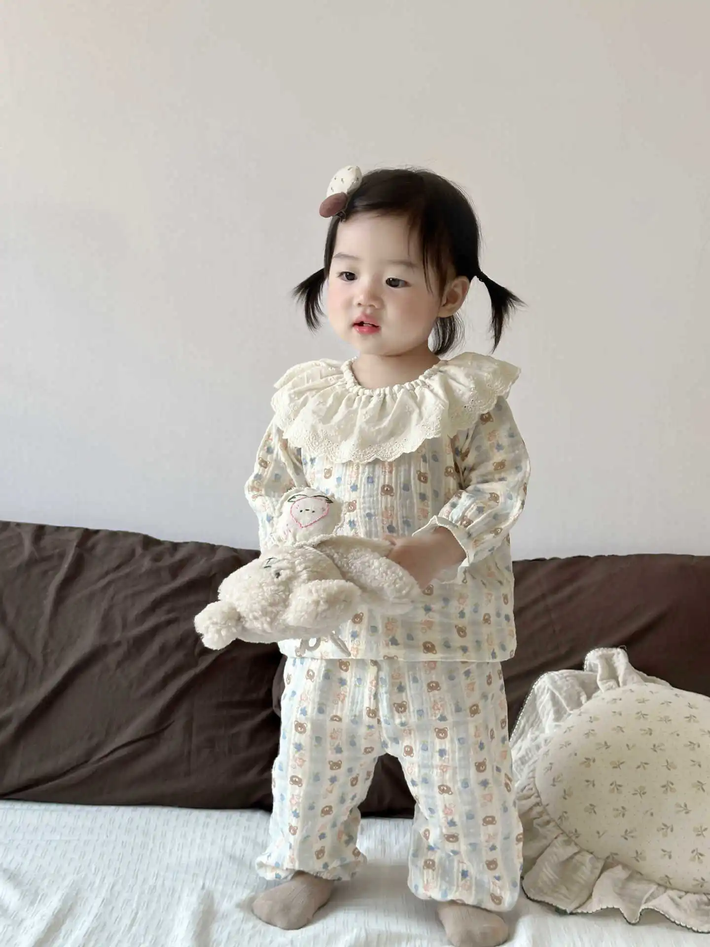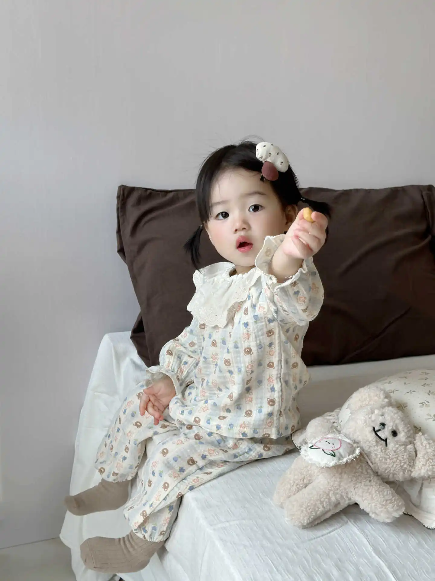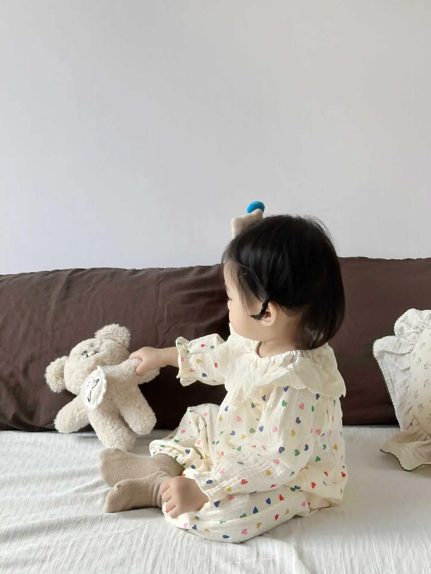 A baby set with an impressive cute heart and flower print. The set includes a long-sleeved shirt with an elegant ruffled collar and long pants for ease of movement. Made of soft material, it is comfortable for your child and is a versatile item that can be used for both daily casual wear and special occasions. The simple yet gorgeous design is available in three color variations. This two-piece set allows you to easily incorporate fashion into your outfit and create a stylish look.
