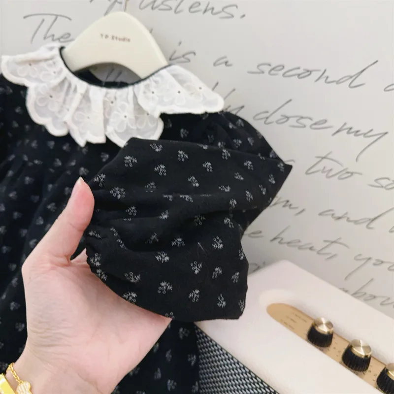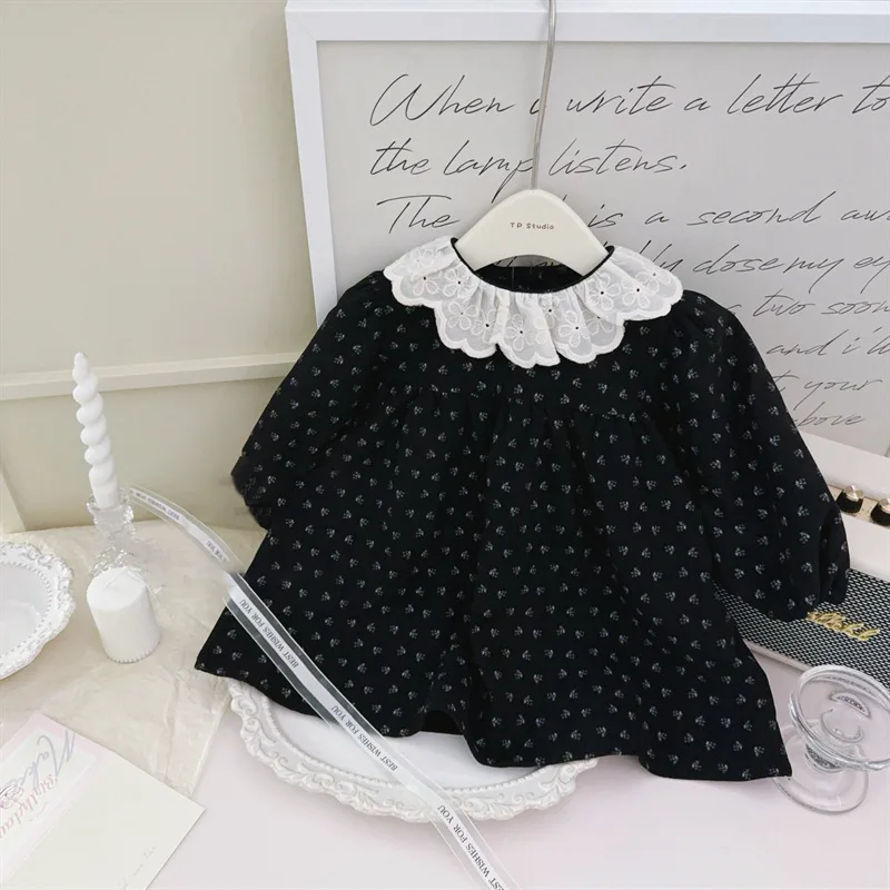 This kids' dress is a long-sleeved floral print dress with an attractive lace ruffle collar. The cute floral pattern stands out against the black color scheme, making it the perfect piece for the fall season. The retro design creates a princess-like glamor. The long sleeves make it safe to wear even on chilly days, and it's perfect for special events and outings. It's a fashionable and cute item that will bring out the individuality of your child.