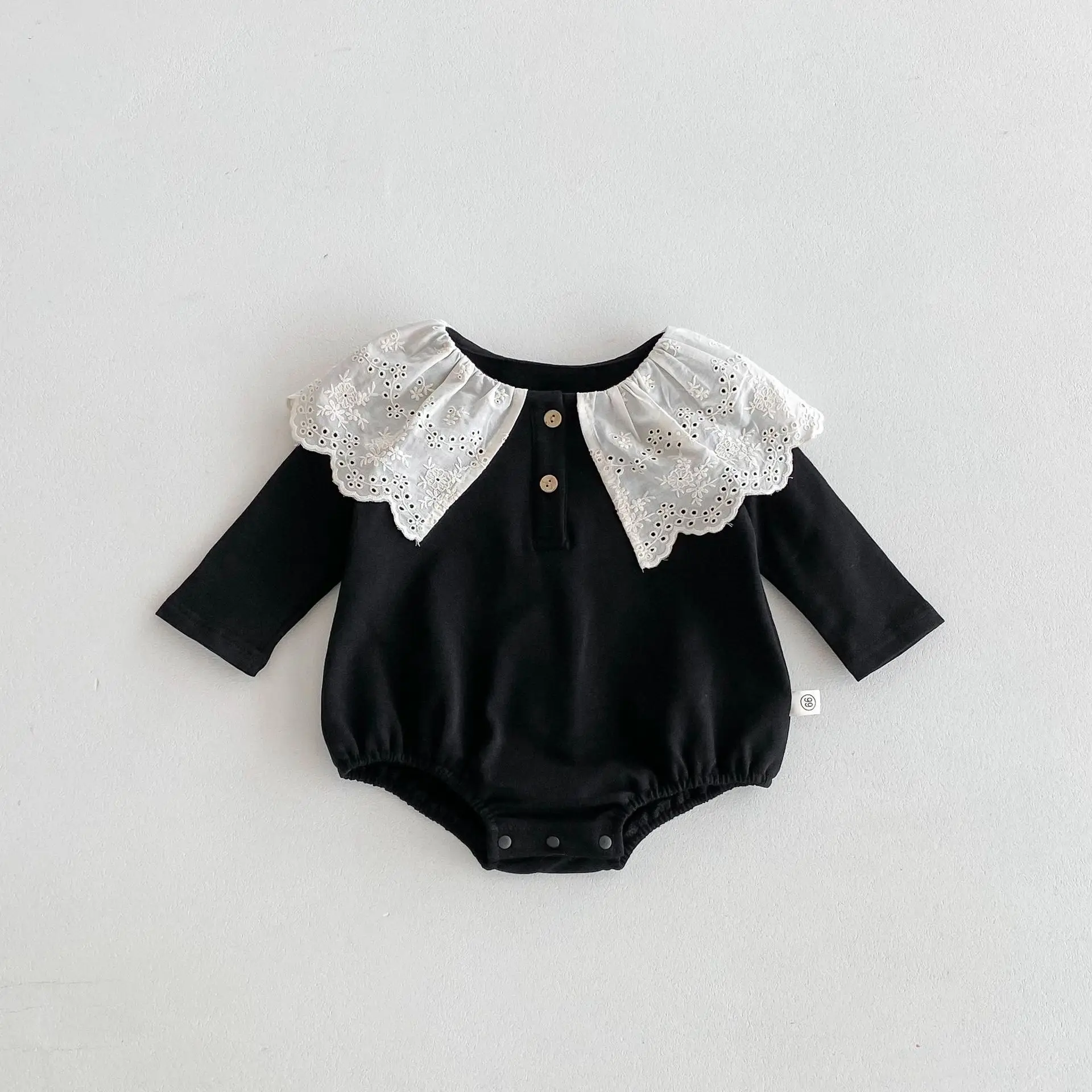 This baby romper is a long-sleeved bodysuit featuring an elegant lace big collar. The elegant design makes your baby look like a princess. Made of soft material, it is gentle on the skin. The long sleeve type keeps you warm even in cold weather while ensuring ease of movement. It is a perfect piece for going out or special occasions, and creates a simple yet memorable style. It is available in two colors, so you can enjoy coordinating it to your liking. Be sure to add this romper to your collection to enhance your baby's fashion sense.