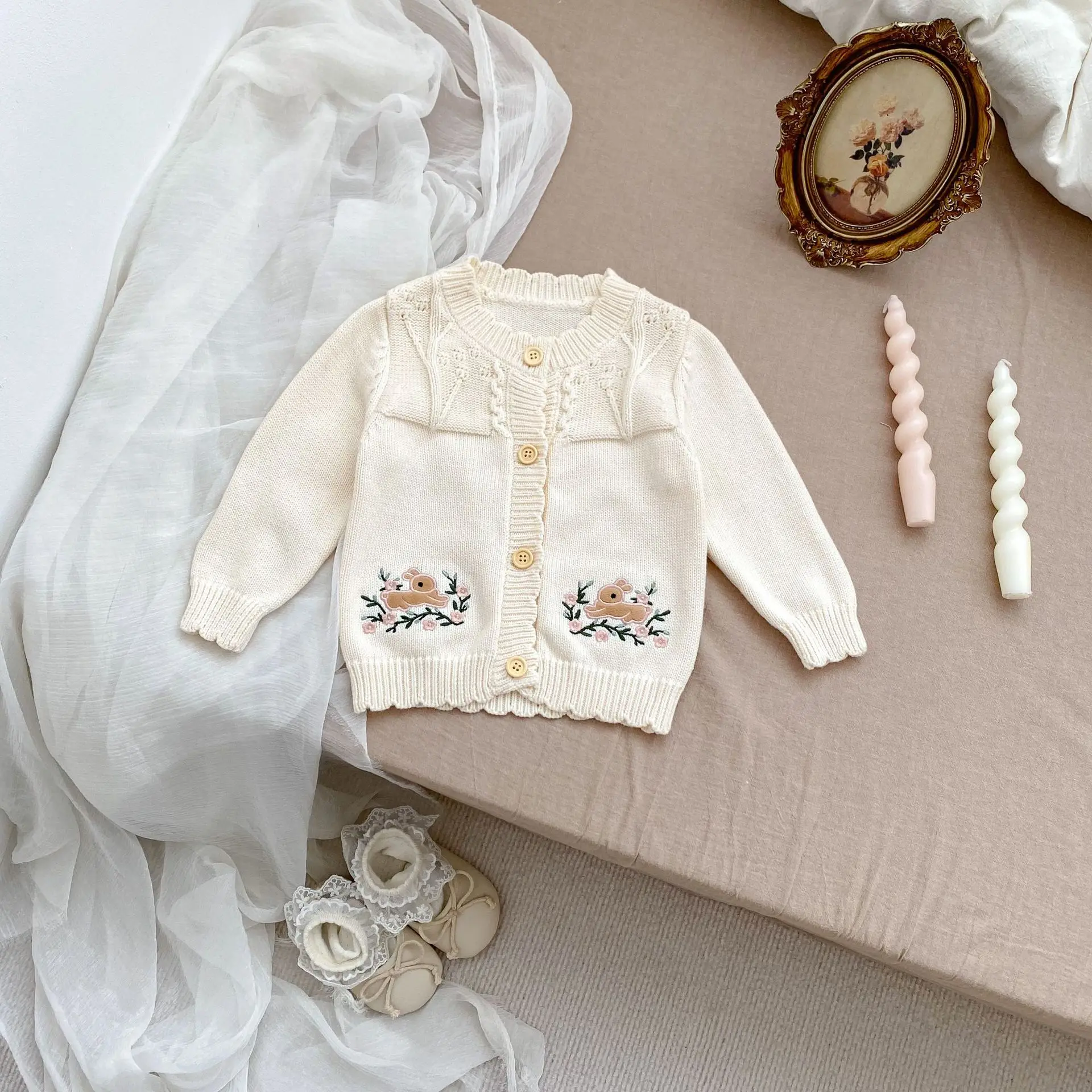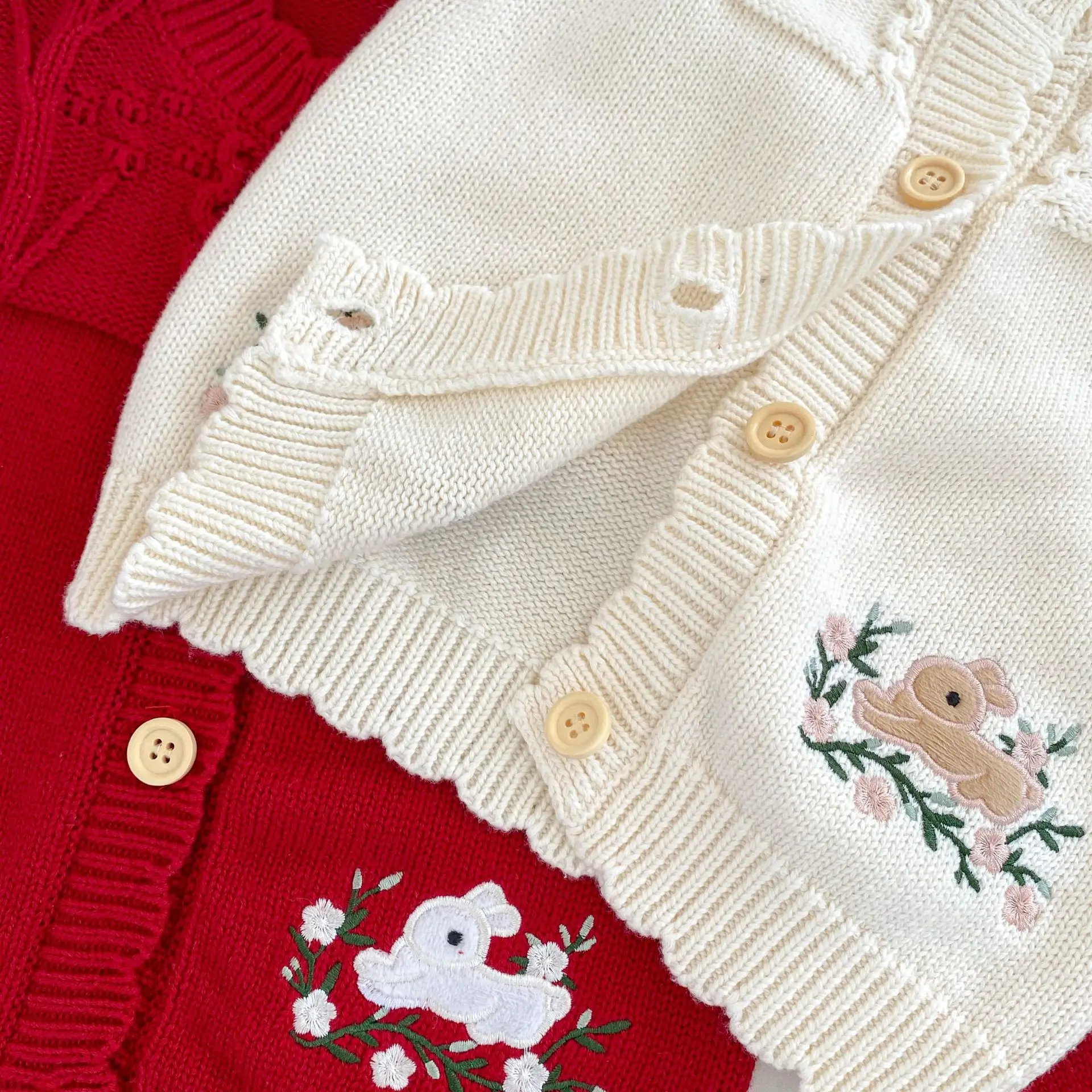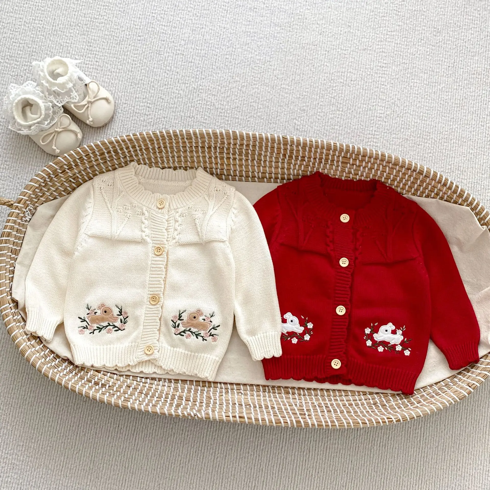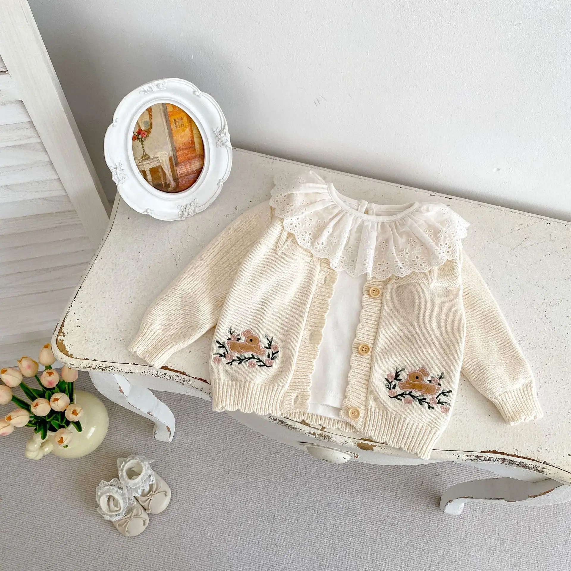 #Baby cardigan #Rabbit embroidery #Ruffle collar T-shirt #Knit jacket #Winter baby clothes #Stylish baby outfit