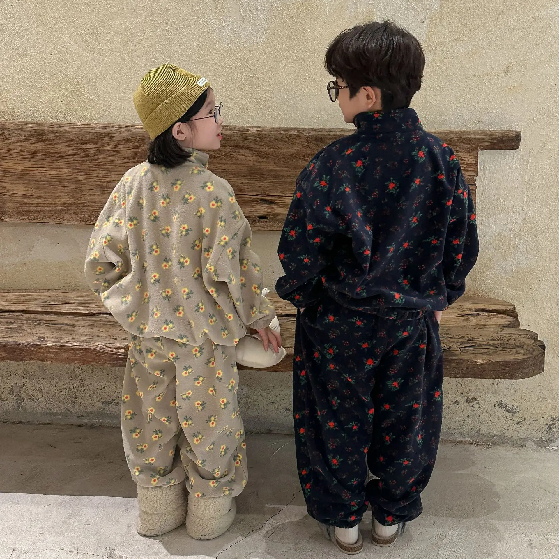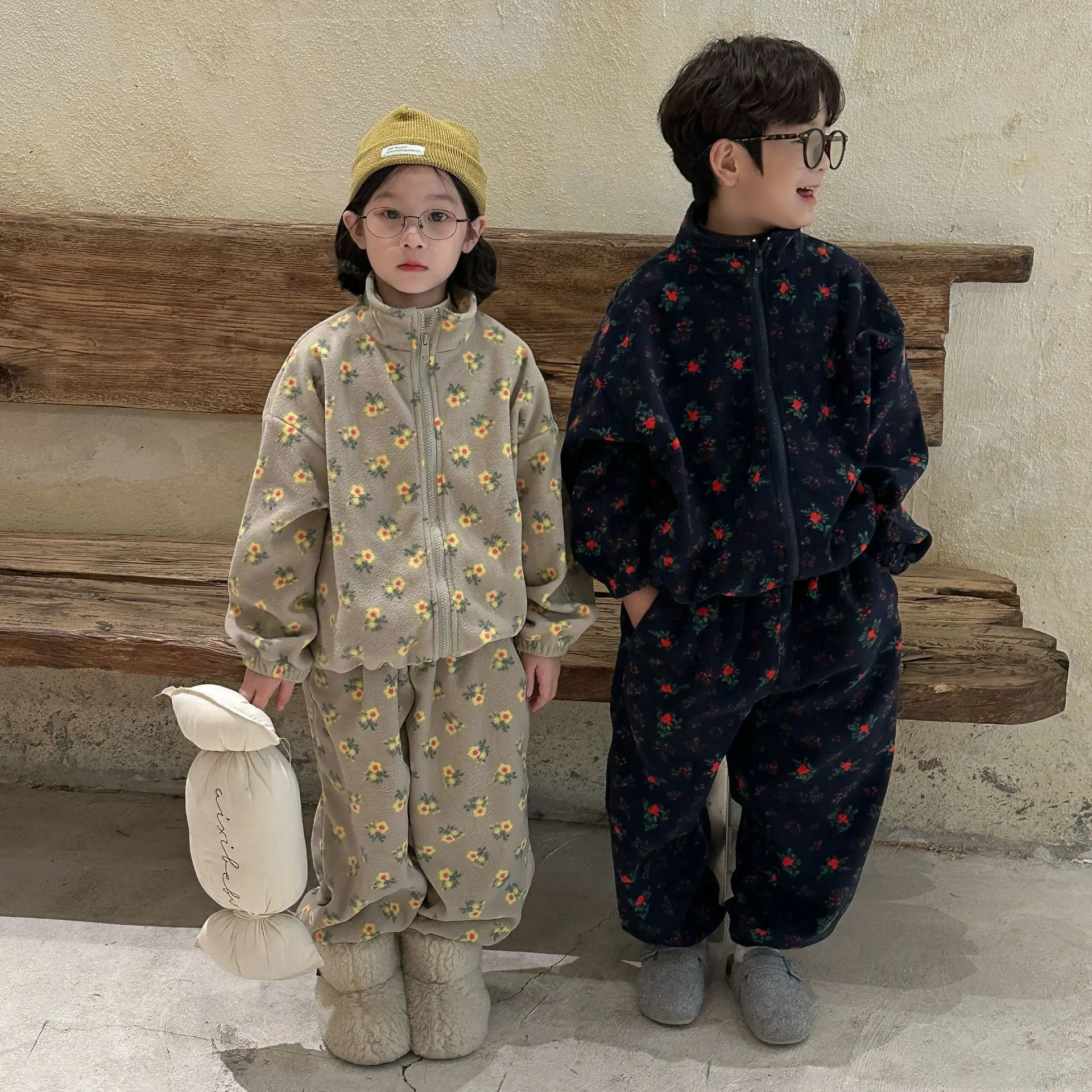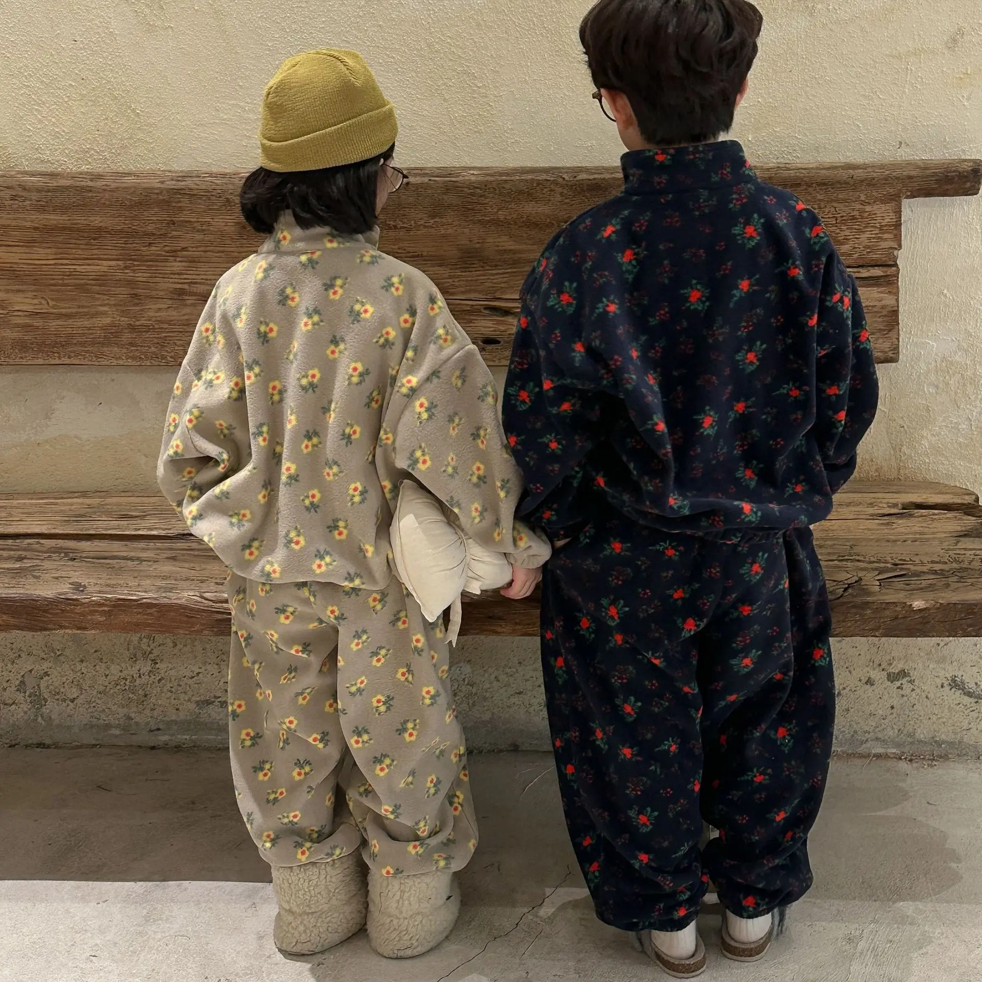 Kids' 2-Piece Set: Floral Print Fleece Zip-Up Long Sleeve Sweatshirt Jacket and Long Loose Pants, Available in 2 Colors [mh0007574]
