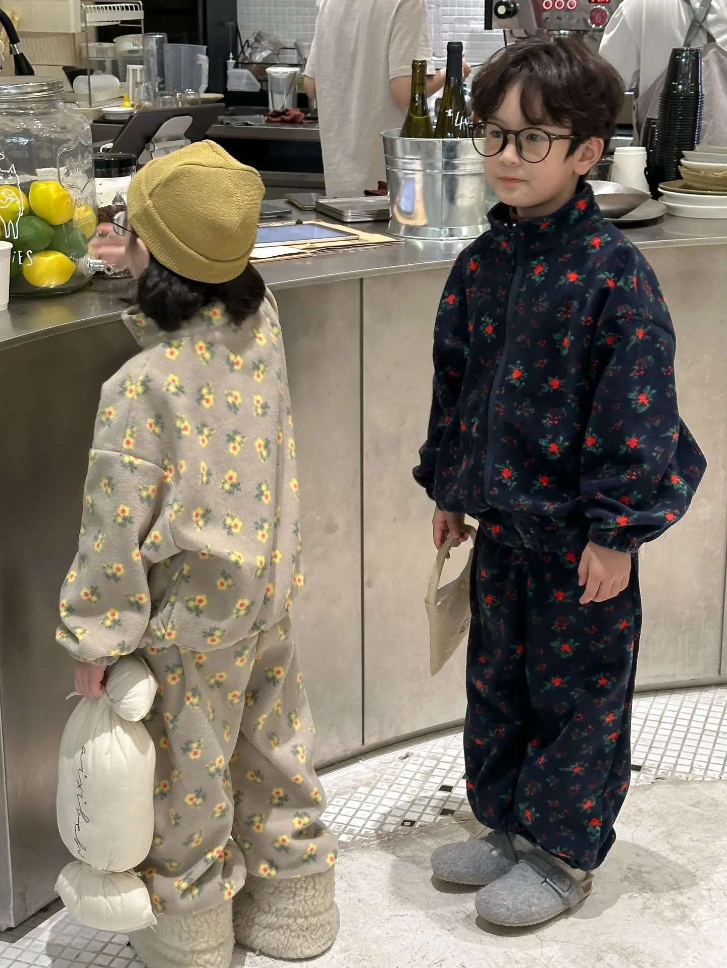 This two-piece set of a floral print fleece zip-up long-sleeve sweat jacket and long loose pants is both cute and comfortable. Made of soft fleece material, it has high heat retention and is comfortable to wear even in cold weather. The zip-up jacket is easy to put on and take off, and is designed with ease of movement in mind. The pants have a loose silhouette, making them perfect for active children. Available in two colors, you can enjoy coordinating them to suit your child's preferences. This set is sure to be useful for everyday use and outings.