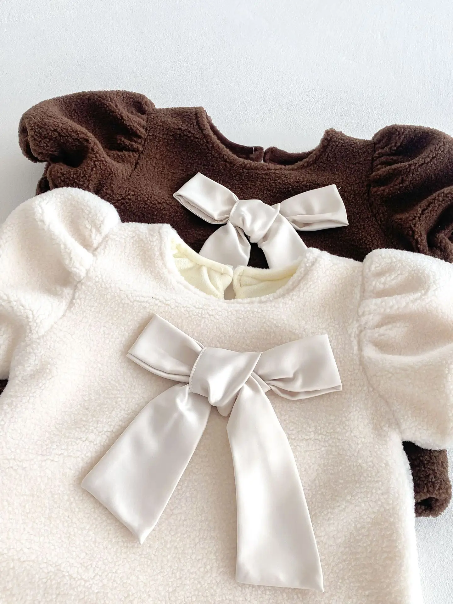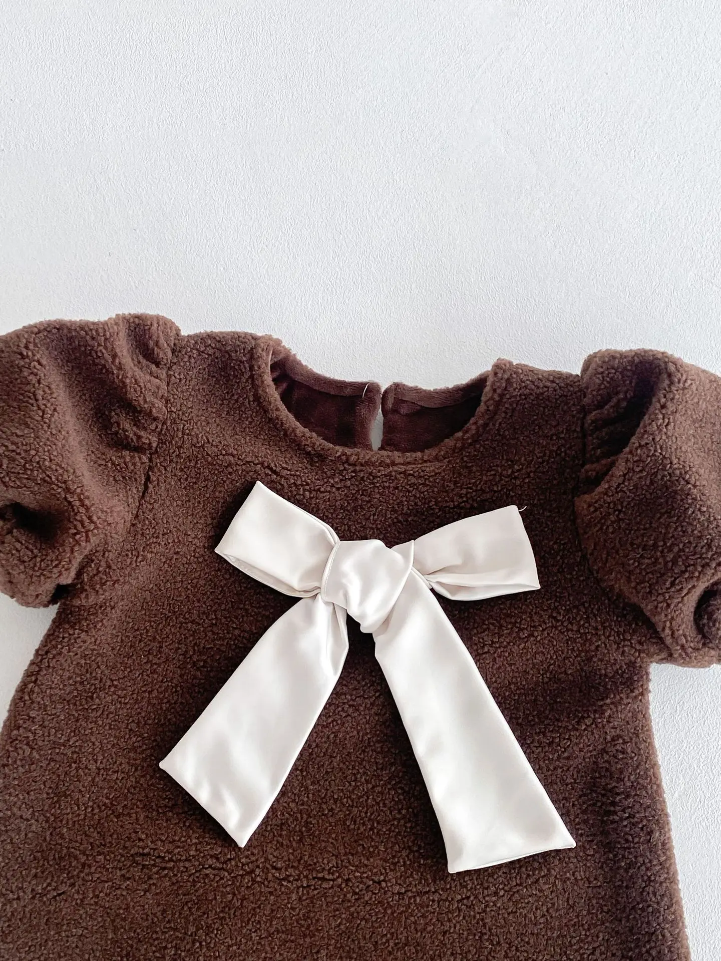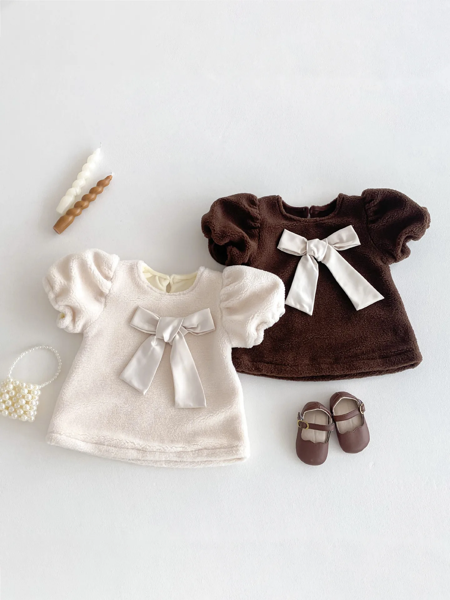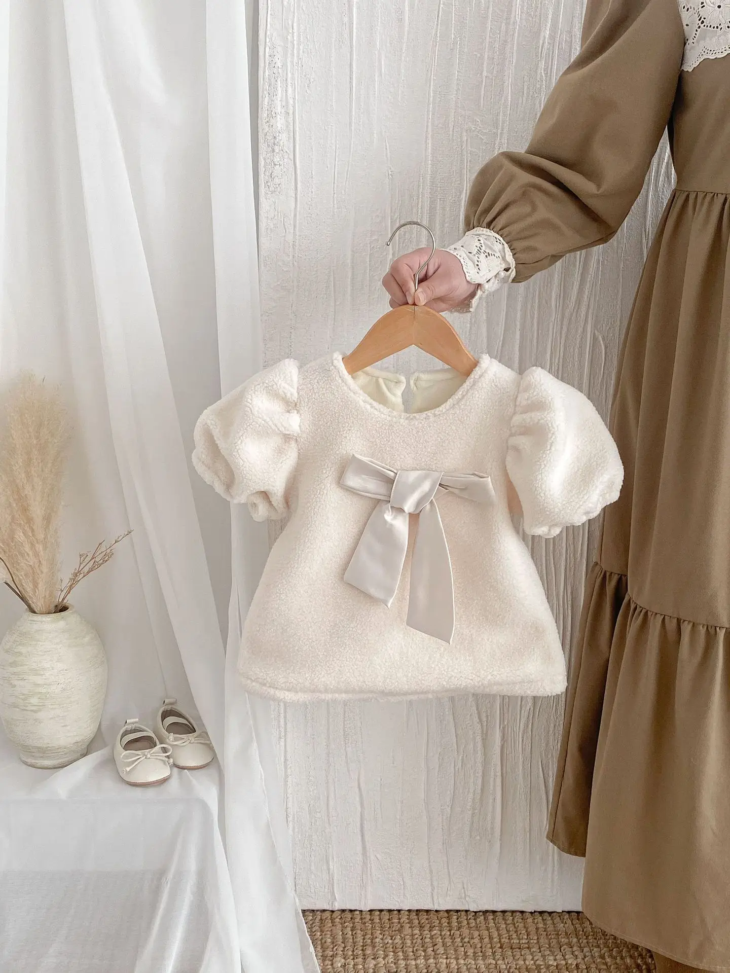 Baby/Kids Dress: Big Ribbon Fleece Thick Short Puff Sleeve Dress [mh0007666]