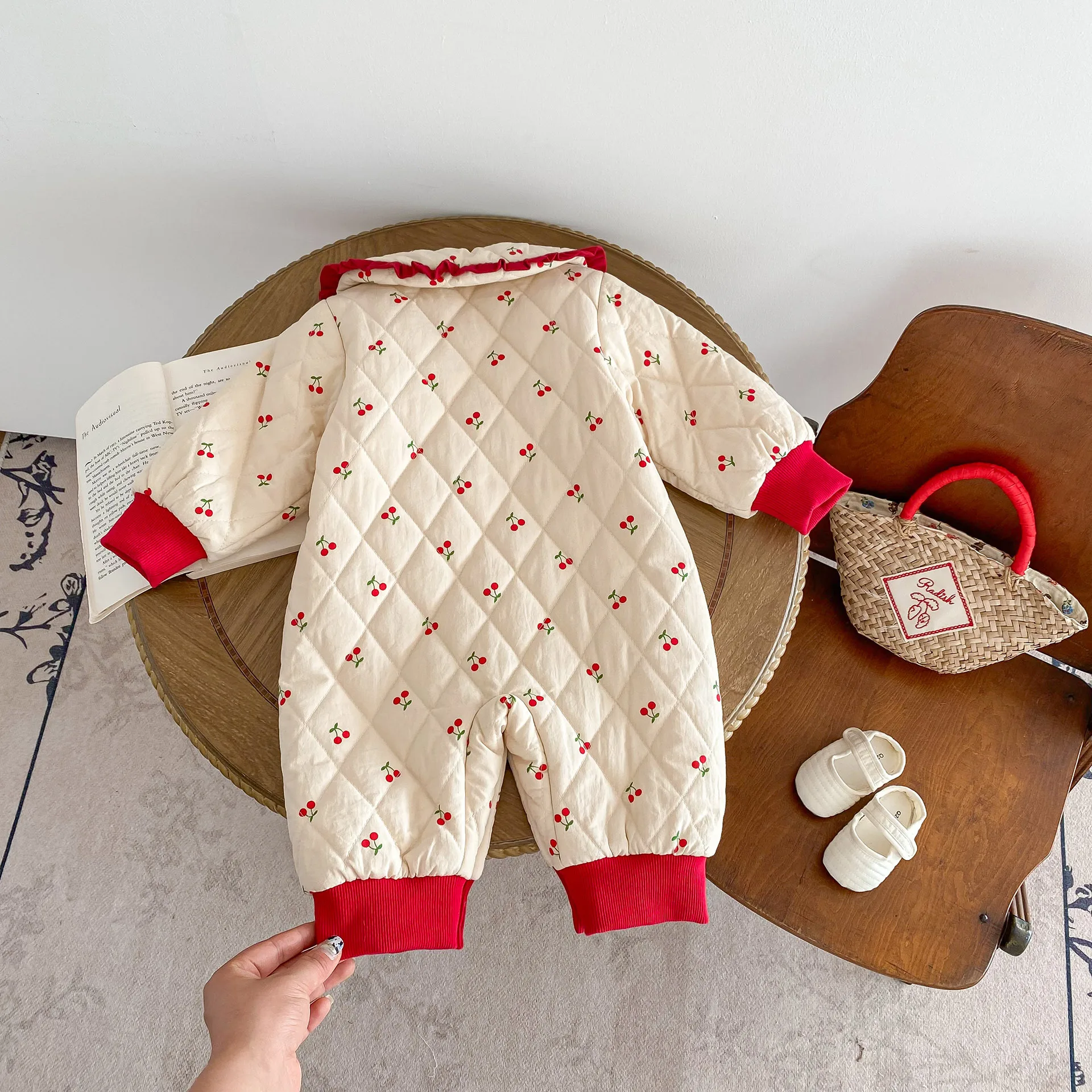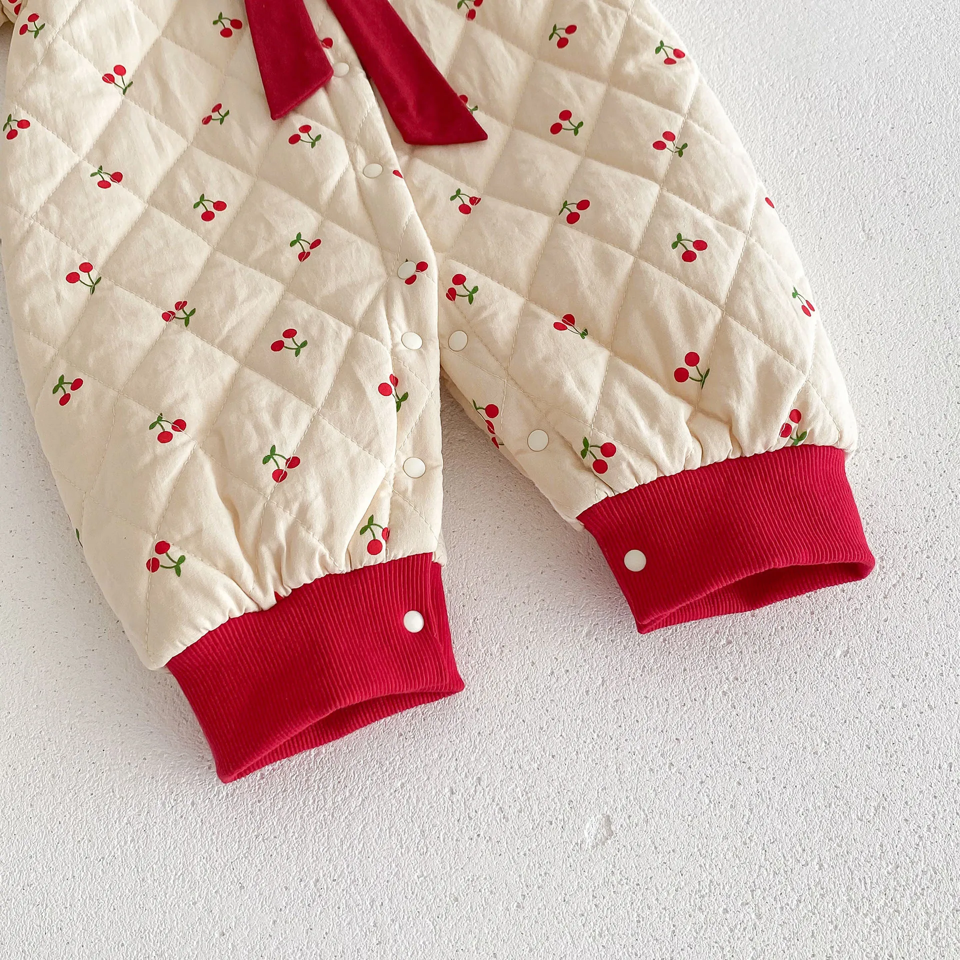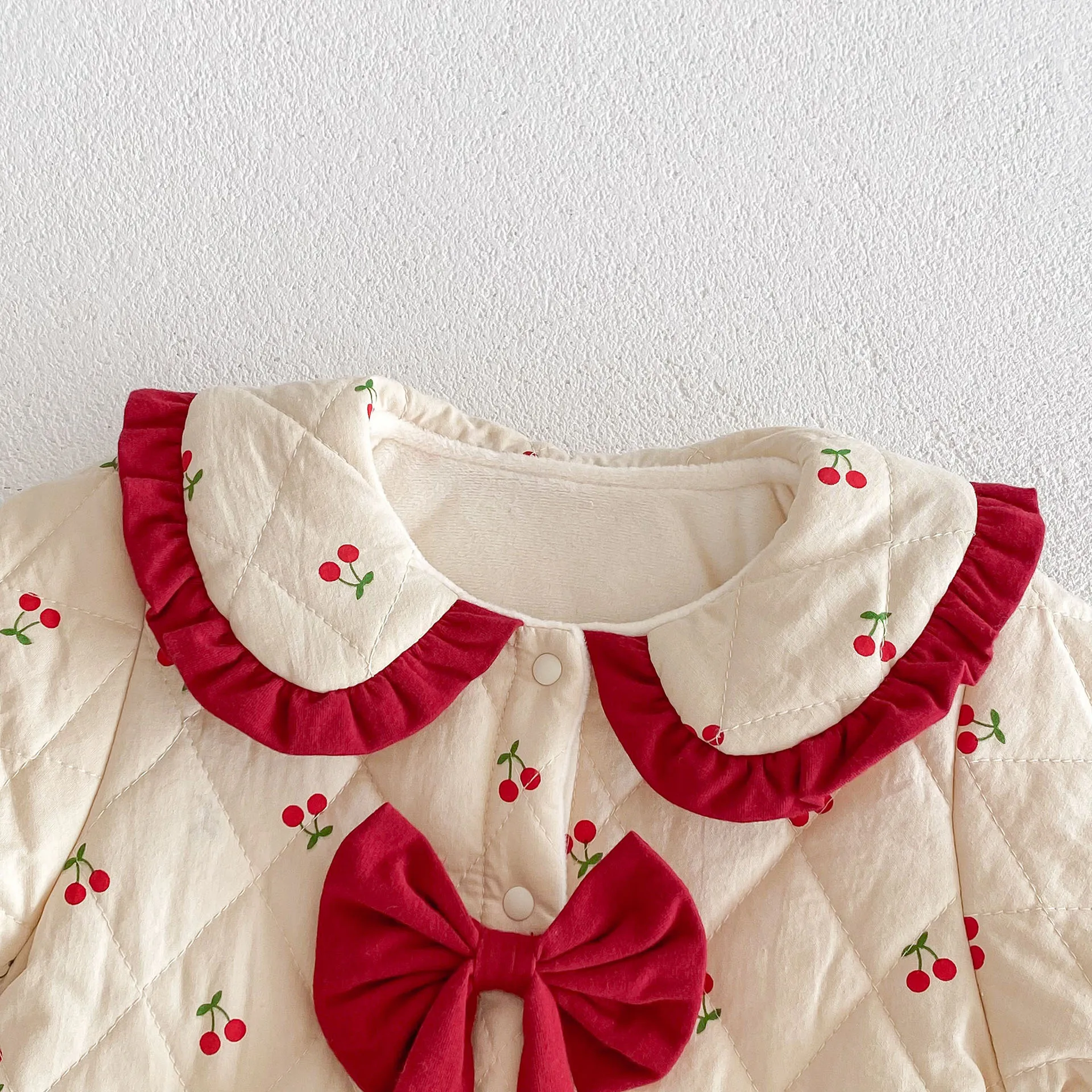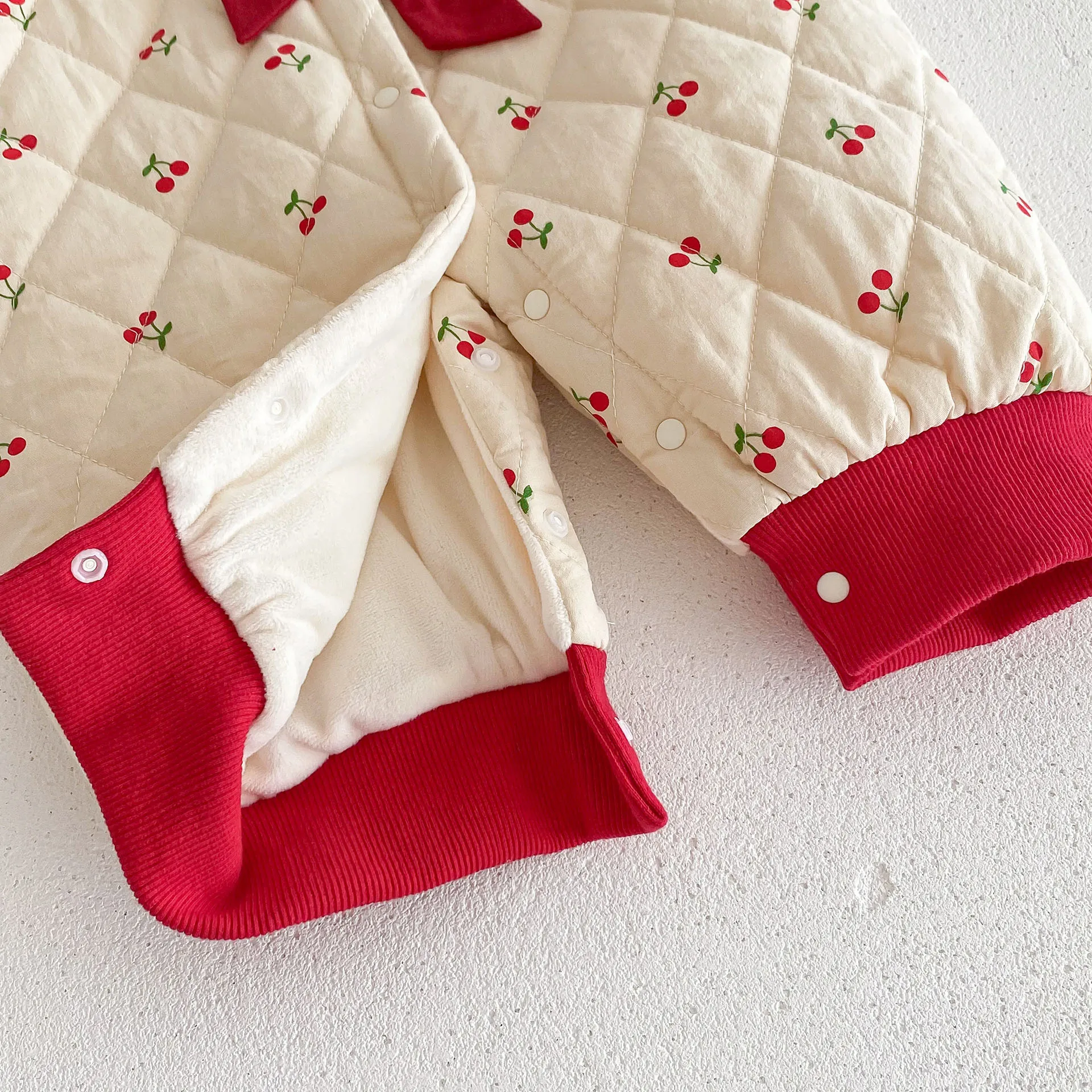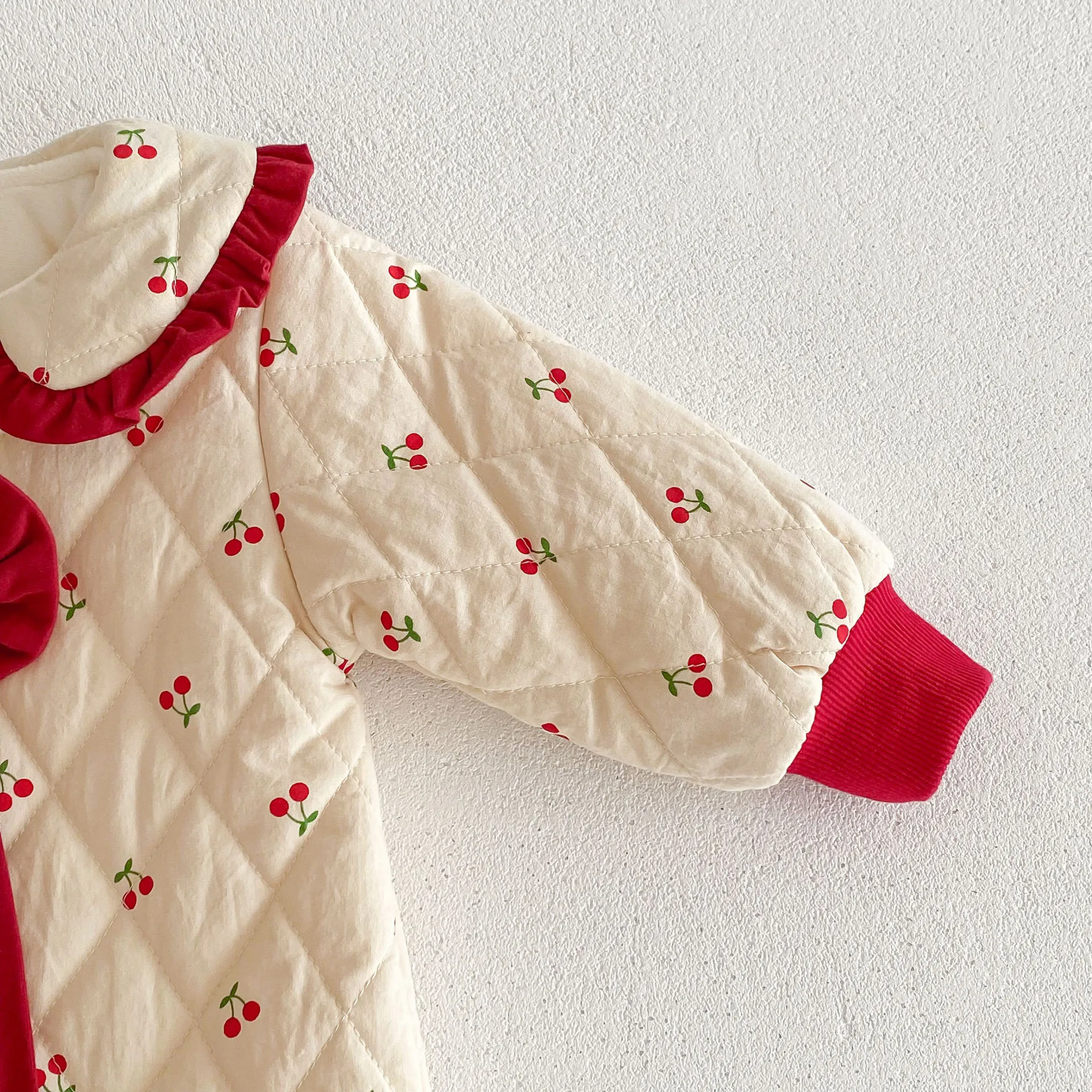 Baby Outerwear Jumpsuit, Cherry Print, Ruffled Round Collar, Ribbon Lining, Quilted Fleece, Long Sleeve Romper [mh0007704]