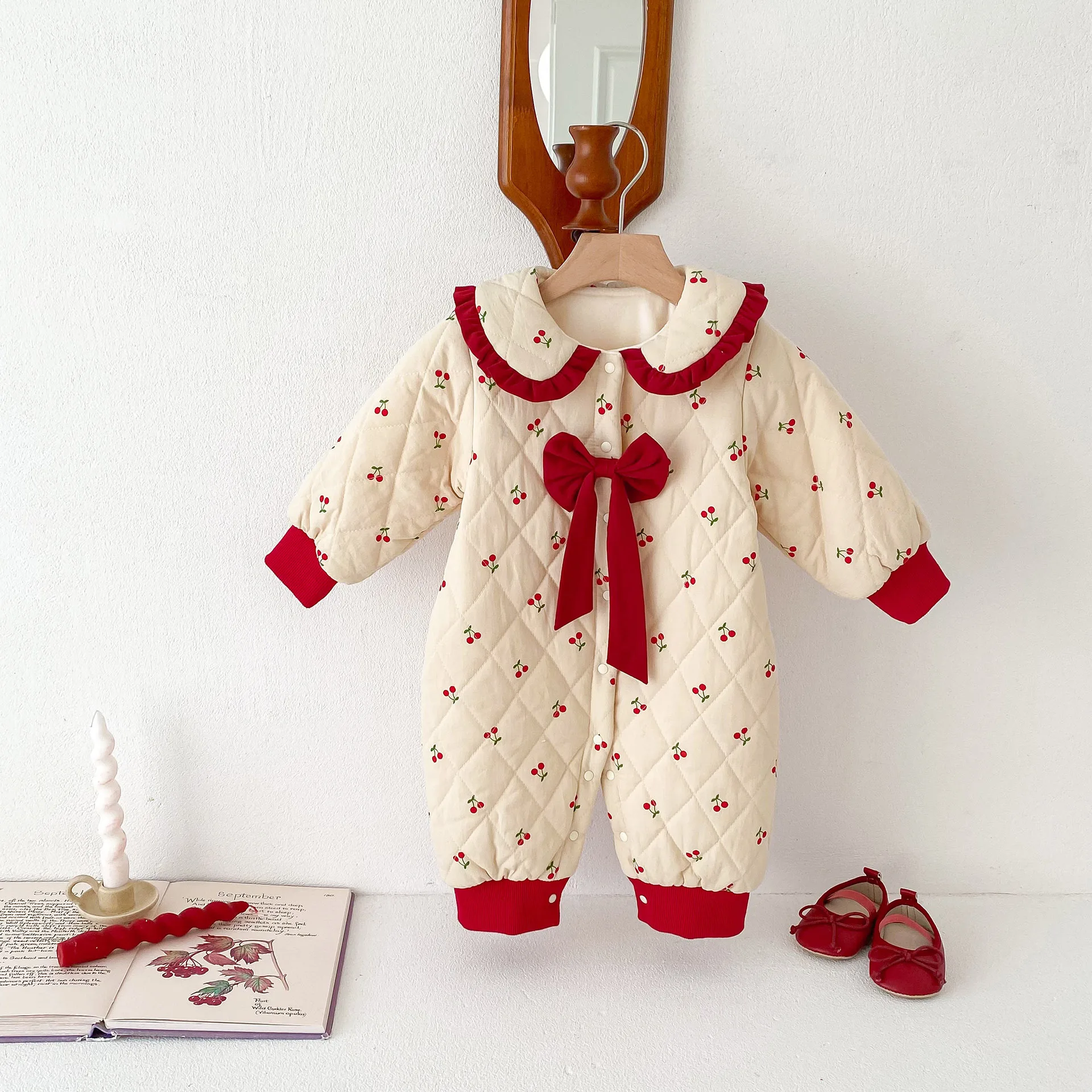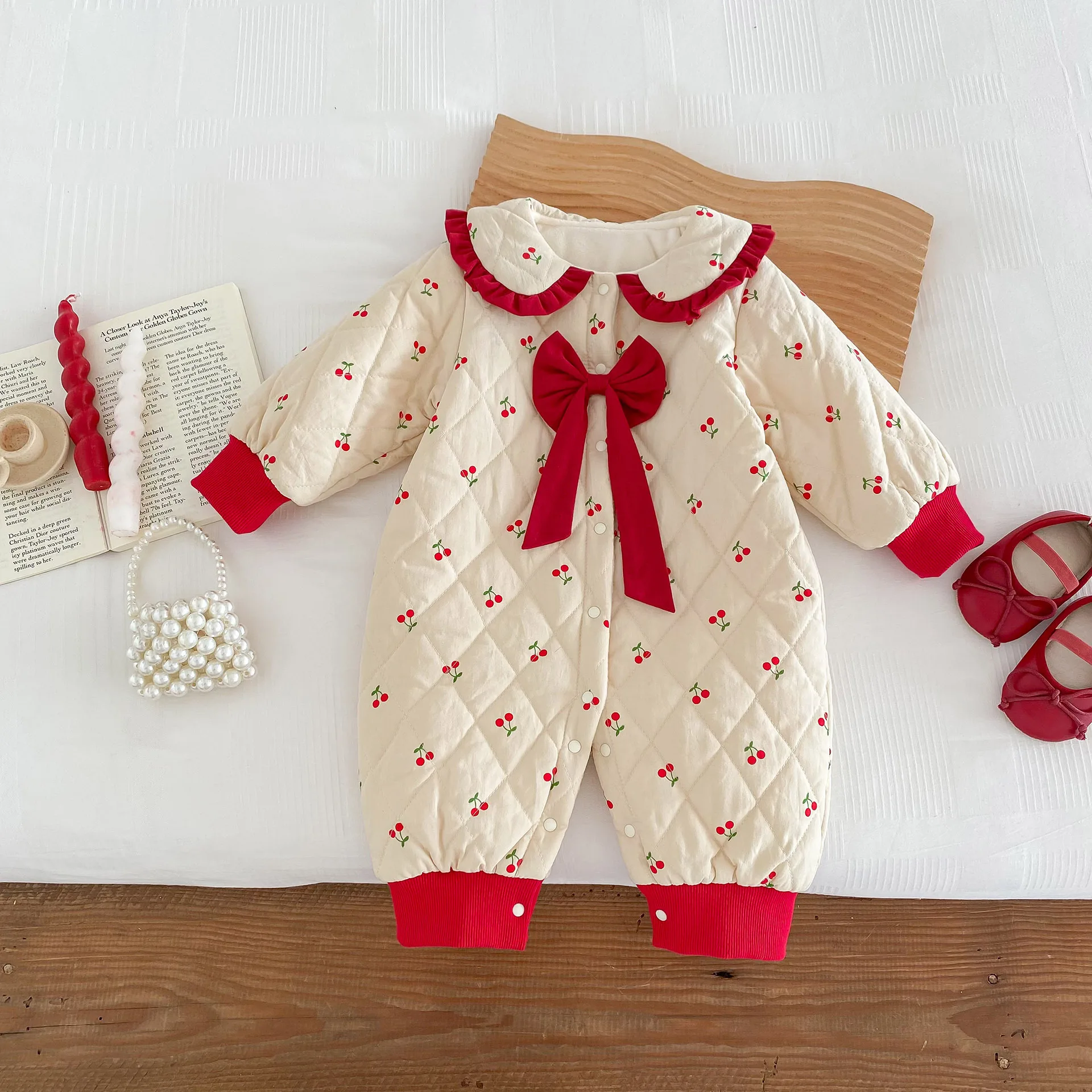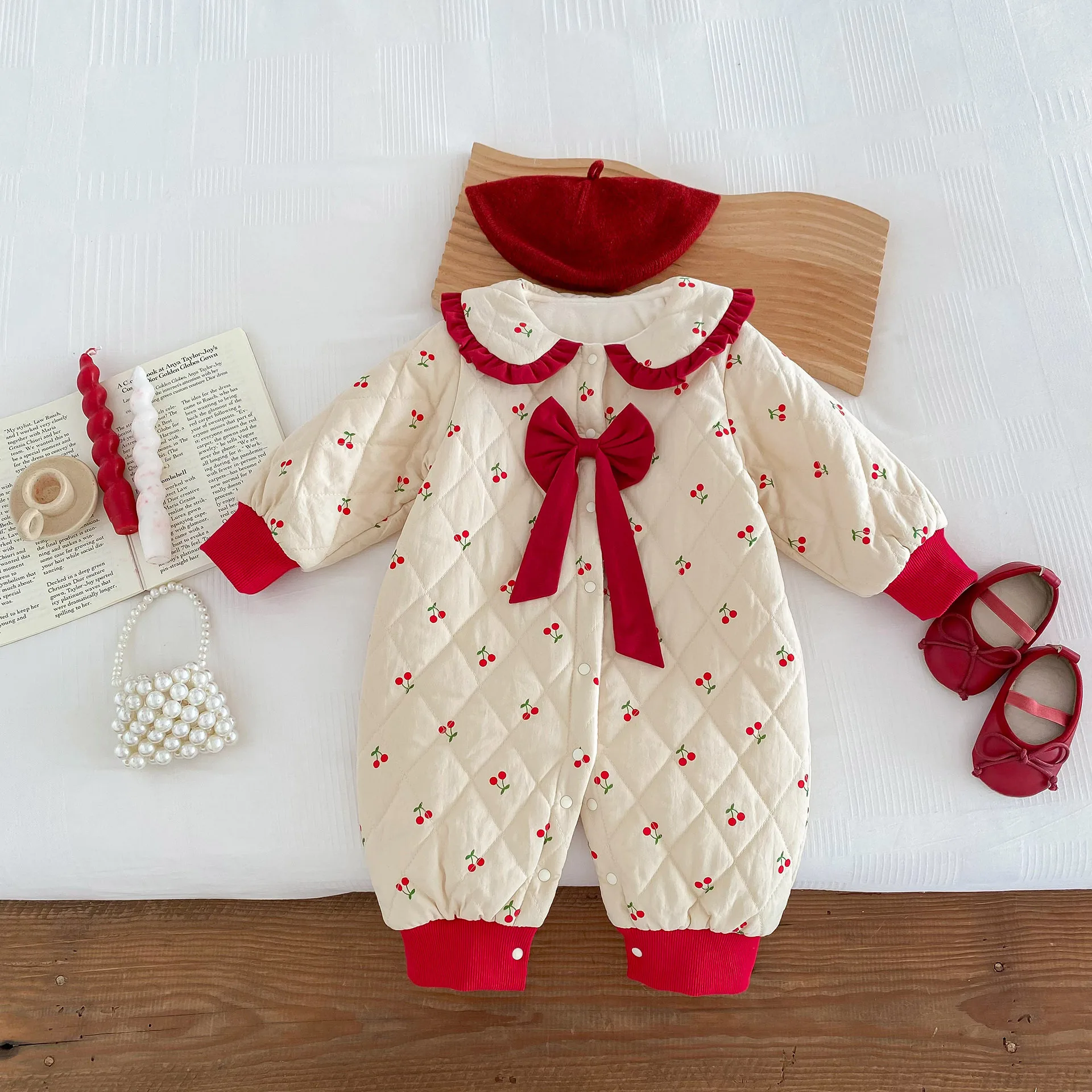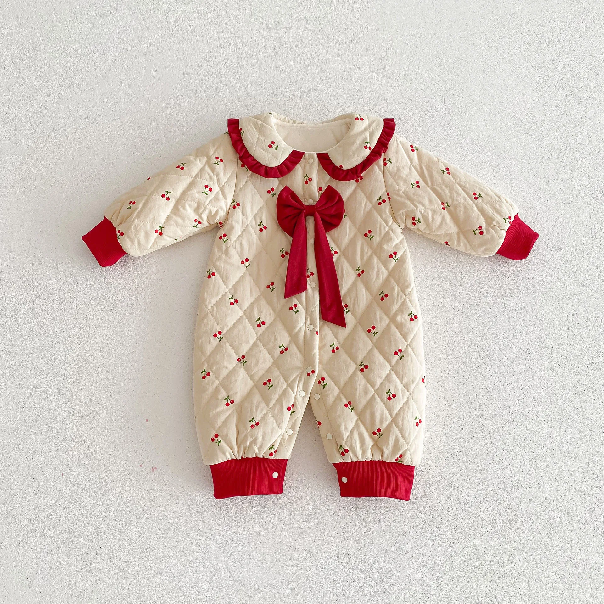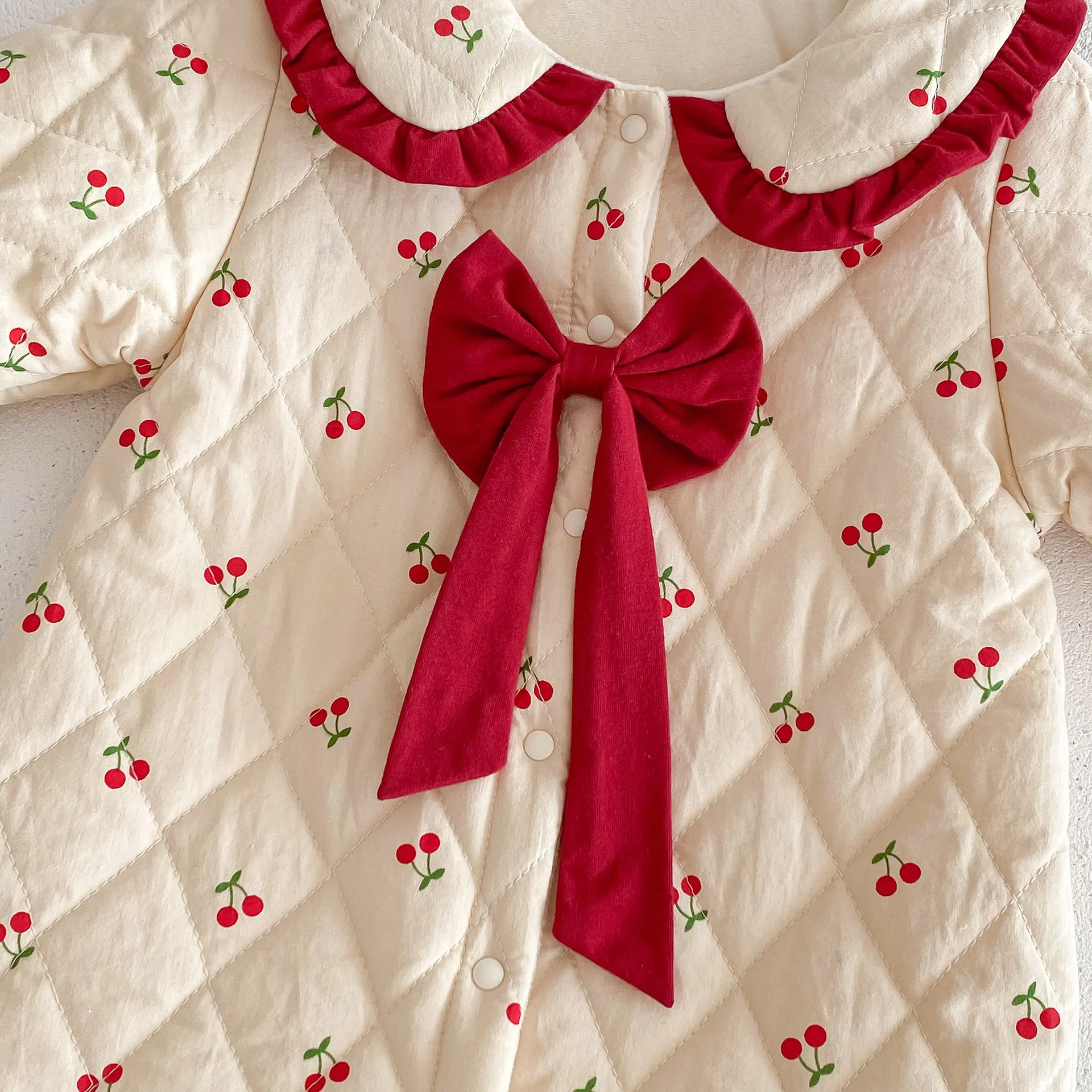 Baby Outerwear Jumpsuit, Cherry Print, Ruffled Round Collar, Ribbon Lining, Quilted Fleece, Long Sleeve Romper [mh0007704]
