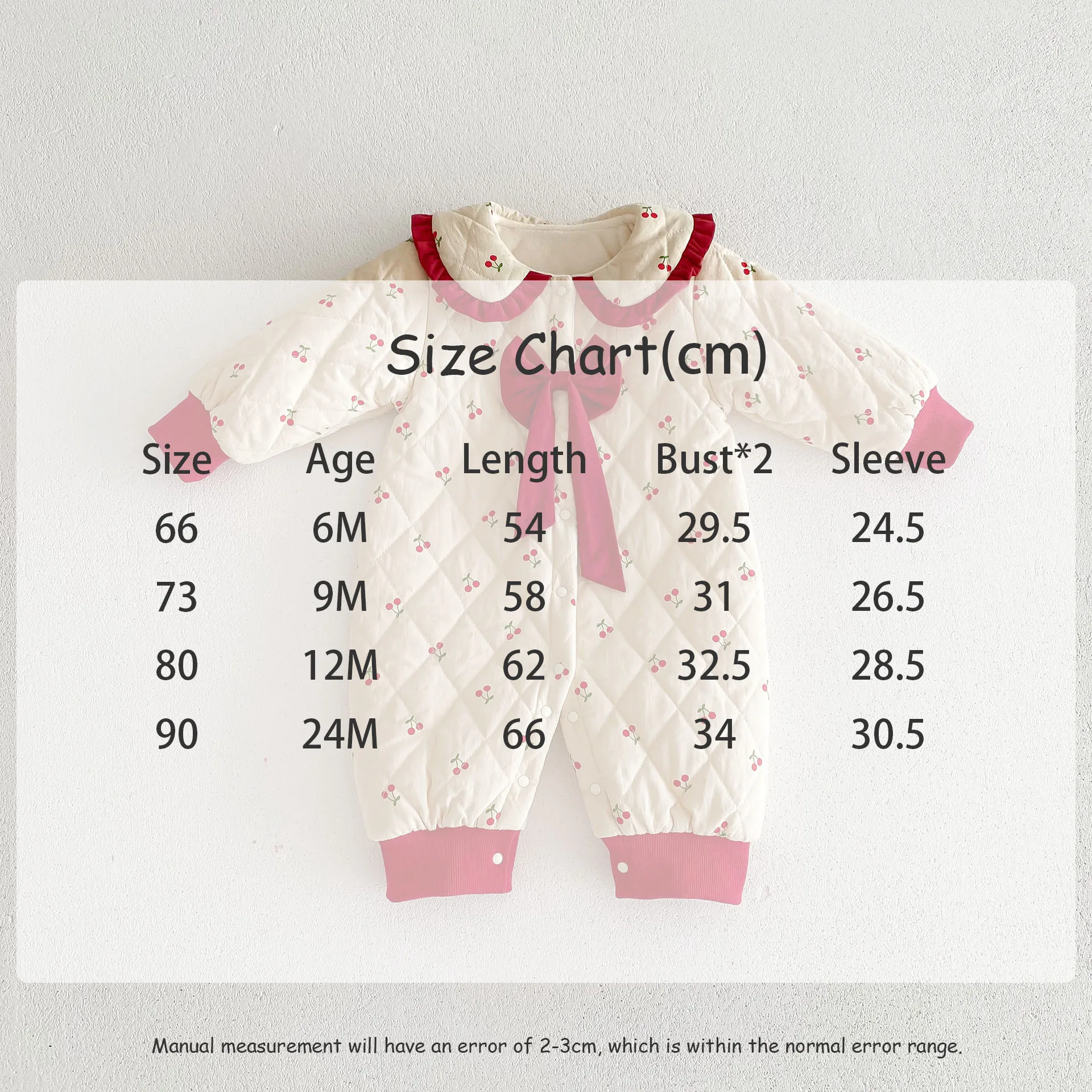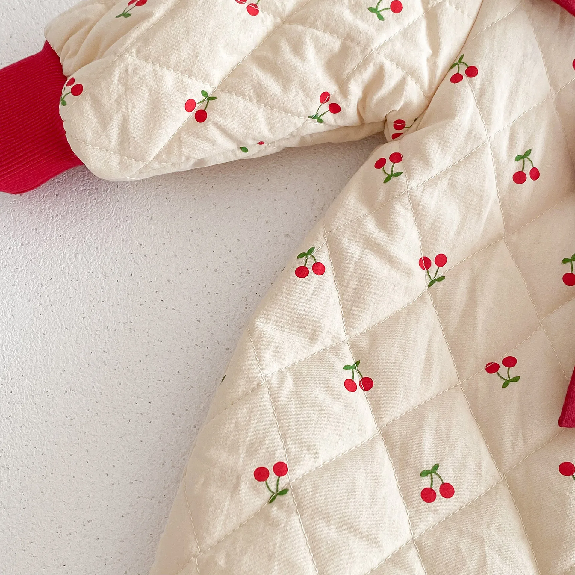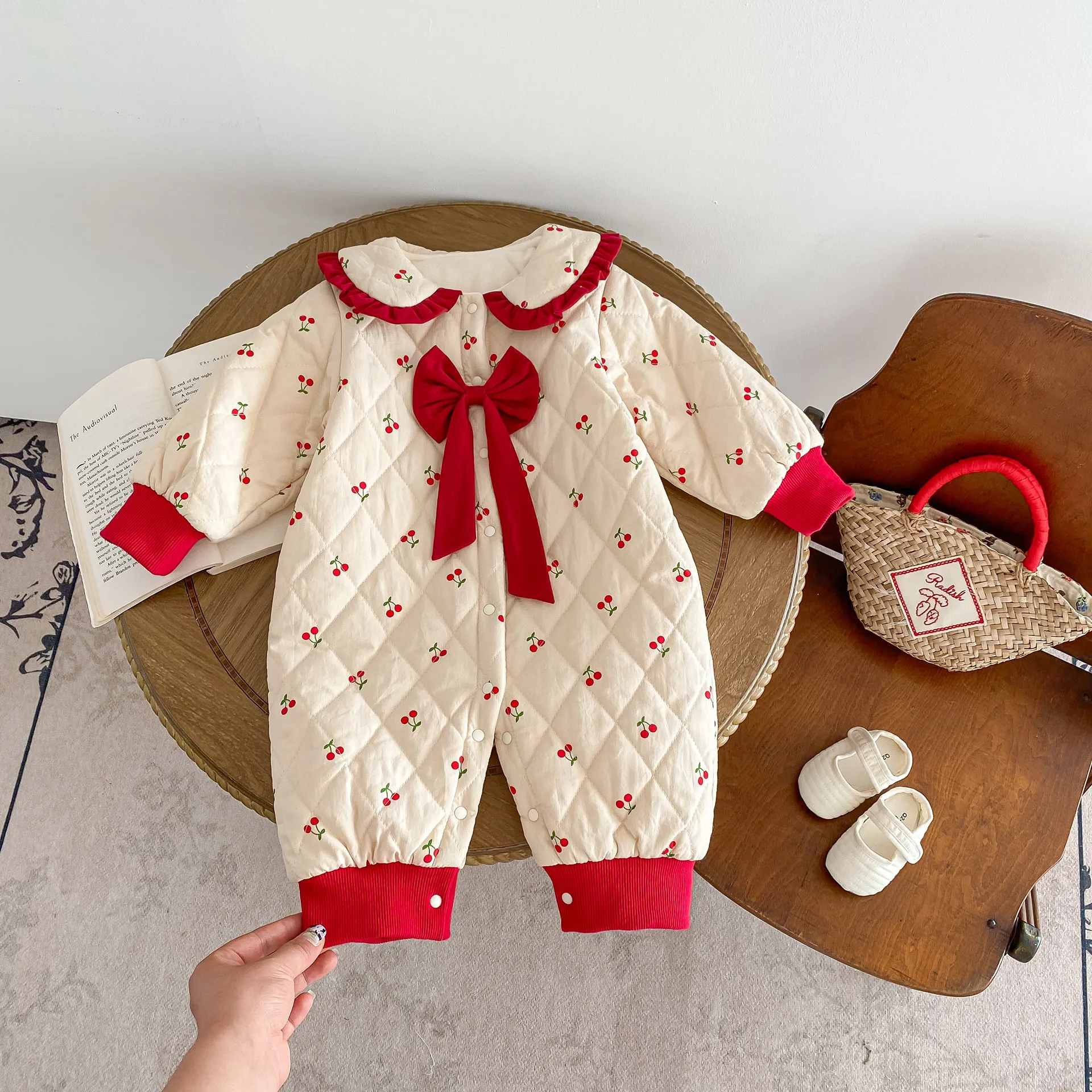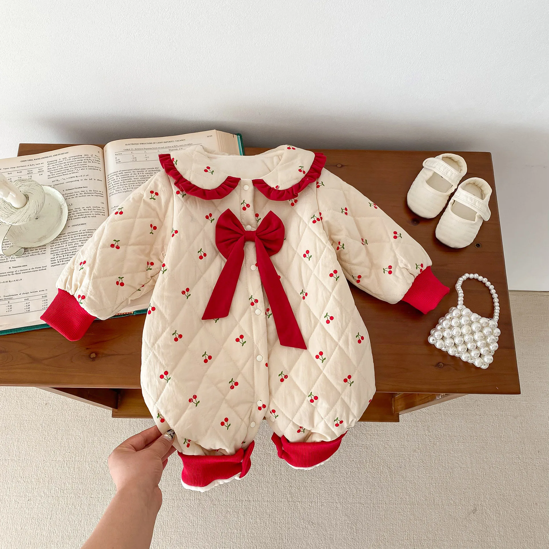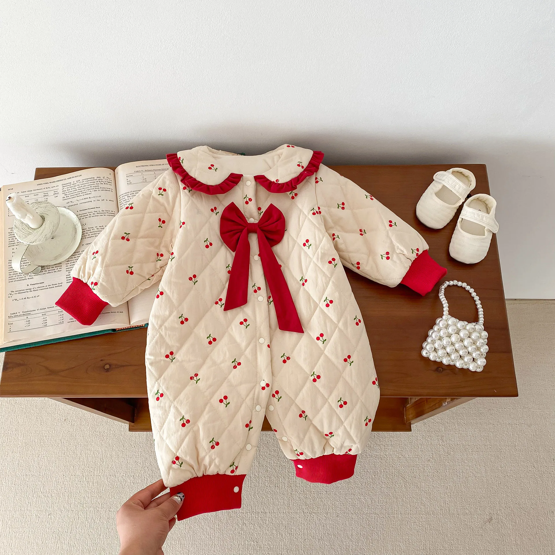 Baby Outerwear Jumpsuit, Cherry Print, Ruffled Round Collar, Ribbon Lining, Quilted Fleece, Long Sleeve Romper [mh0007704]
