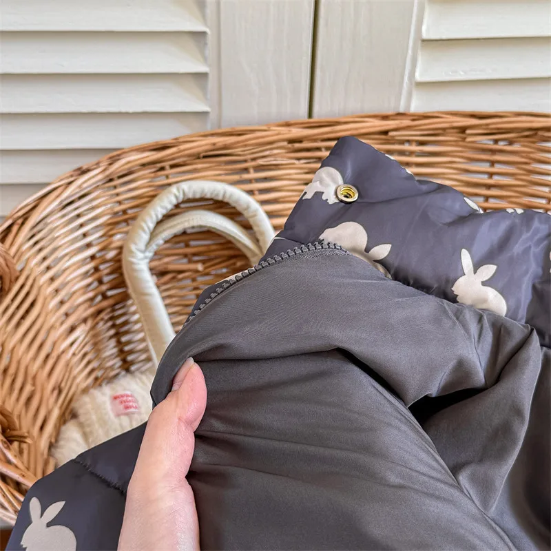 This adorable padded down jacket with a rabbit bunny print is the perfect warmth for the cold season. The padding keeps you warm, and the soft fabric gently wraps around your skin. The rabbit print accents the jacket, making it super cute. The long sleeve design and thick fabric will keep your child warm even on cold days. It's lightweight yet warm enough to be worn in the winter.