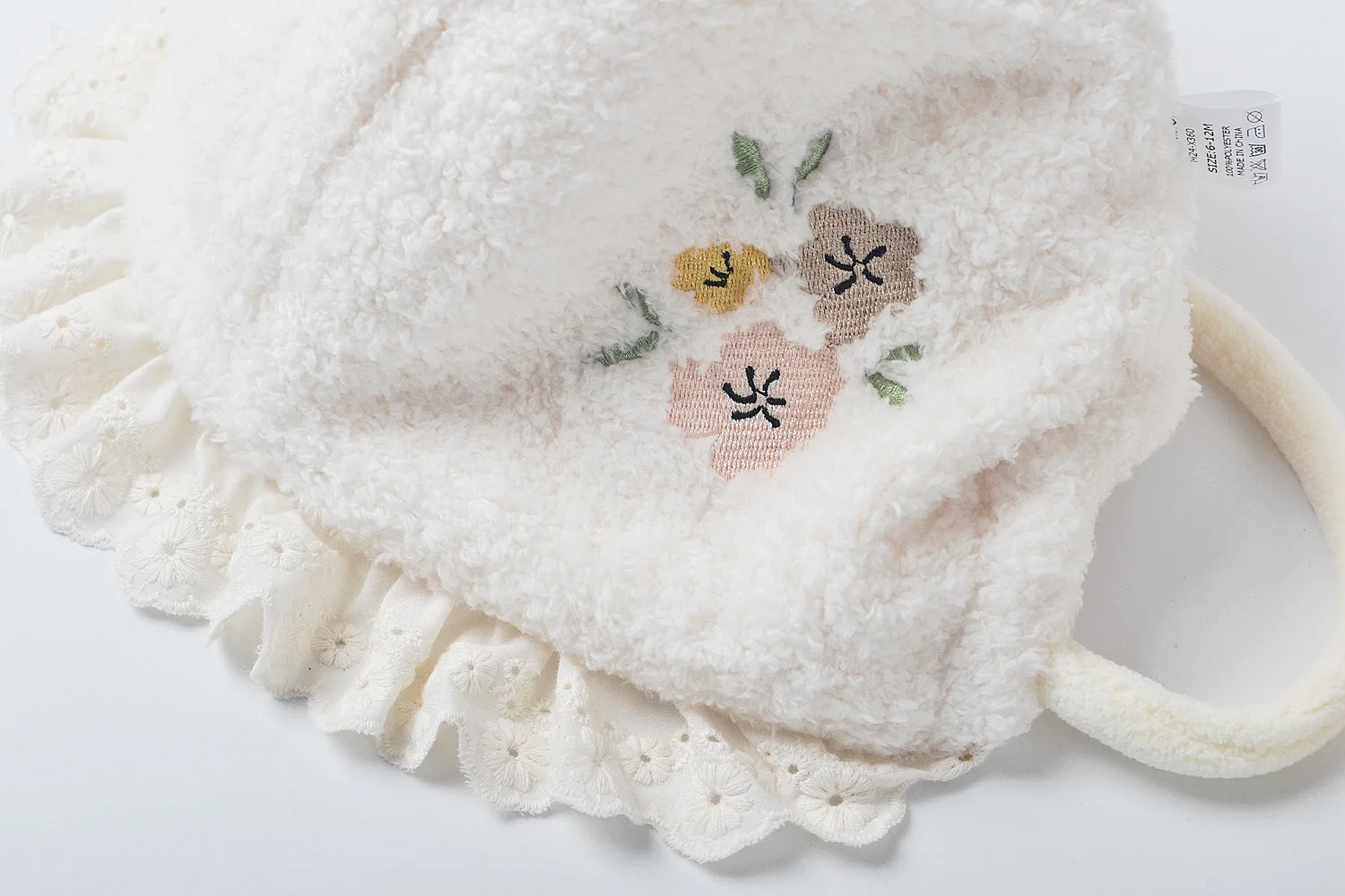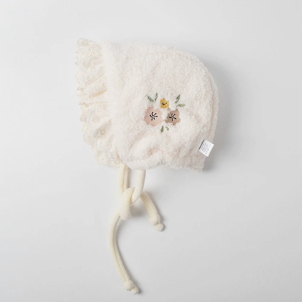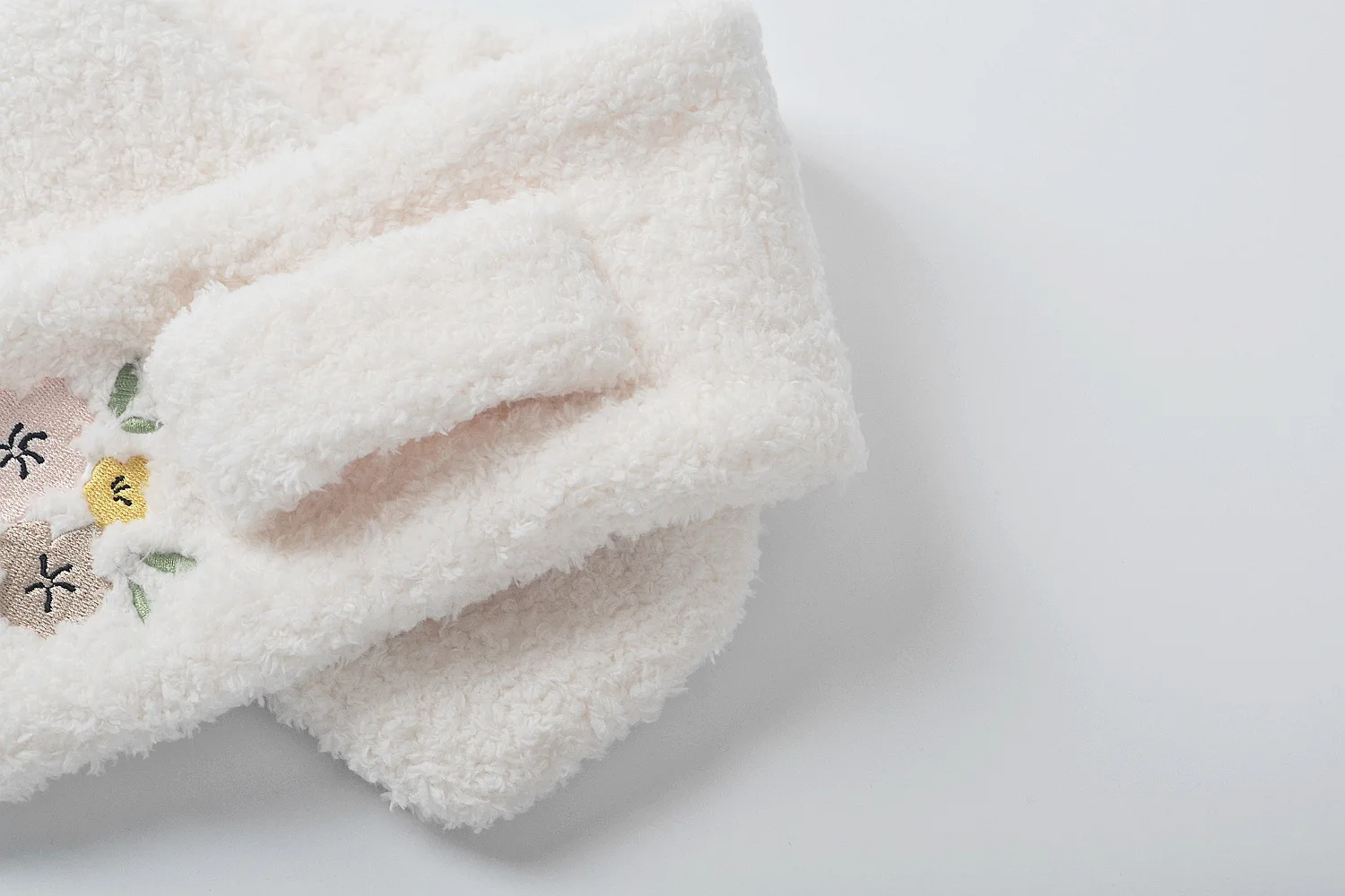 This set includes a bonnet and neck warmer made of fleece material with floral embroidery. The soft fleece gently wraps around your baby's skin, providing comfortable warmth even in cold weather. The bonnet is designed to cover the head securely and protect the ears. The neck warmer can be easily put on and taken off with snap buttons. The simple yet cute embroidery adds an accent, making this item perfect for everyday use or going out.