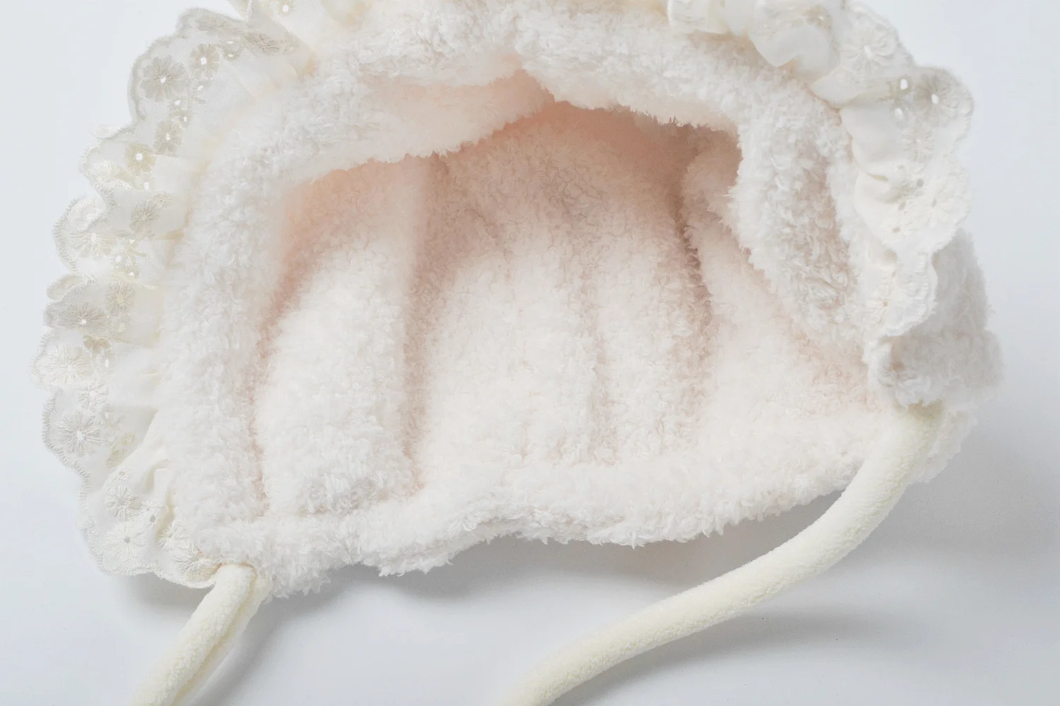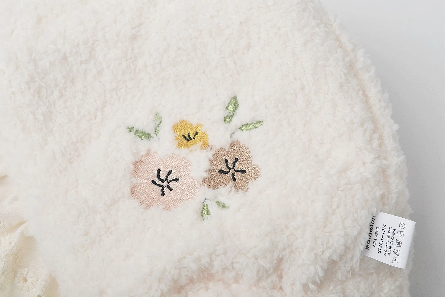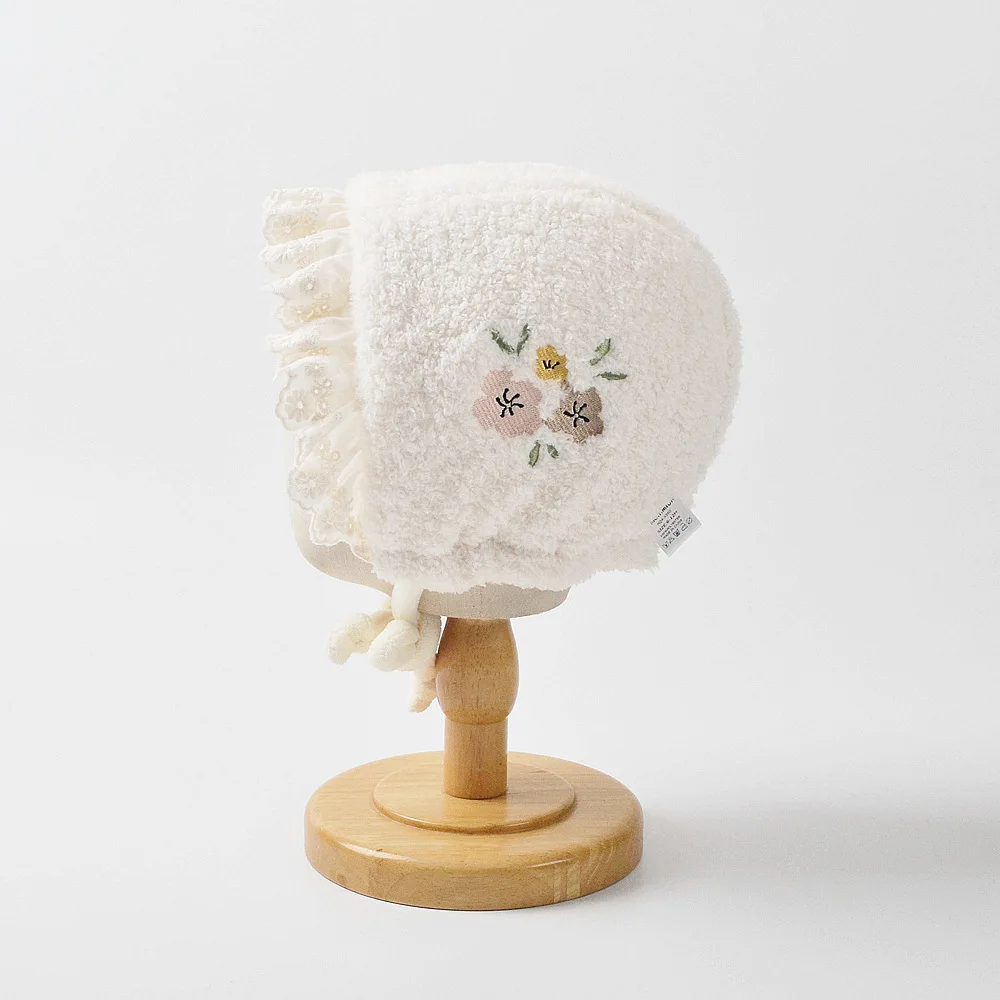 This set includes a bonnet and neck warmer made of fleece material with floral embroidery. The soft fleece gently wraps around your baby's skin, providing comfortable warmth even in cold weather. The bonnet is designed to cover the head securely and protect the ears. The neck warmer can be easily put on and taken off with snap buttons. The simple yet cute embroidery adds an accent, making this item perfect for everyday use or going out.