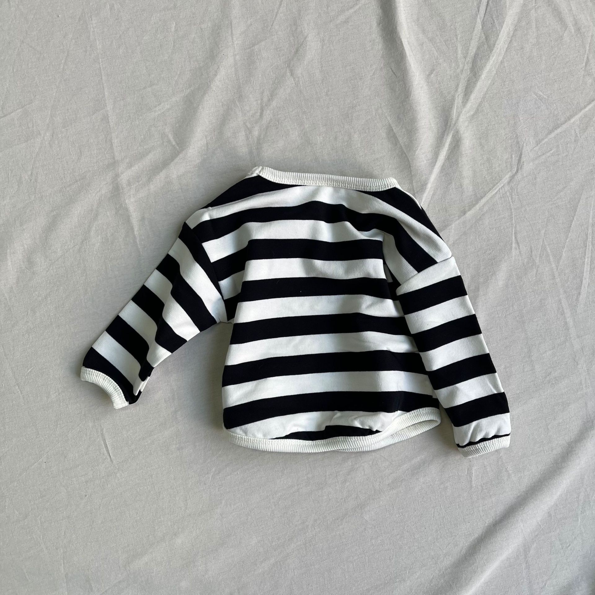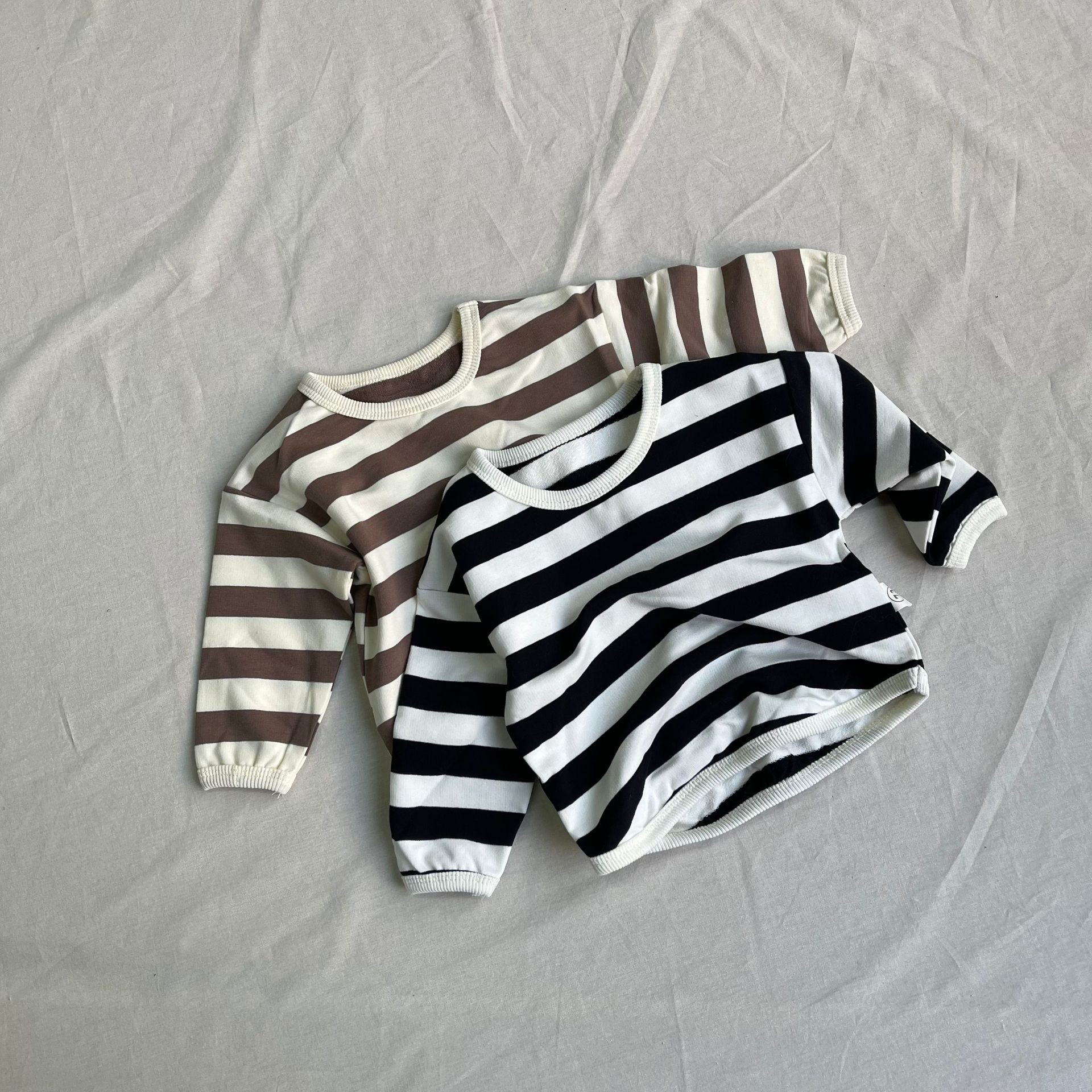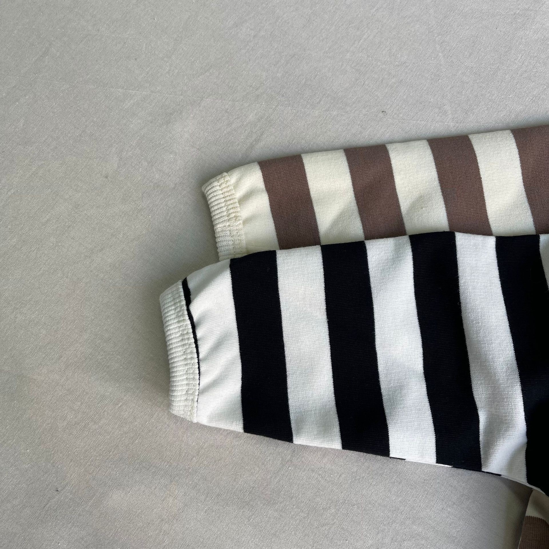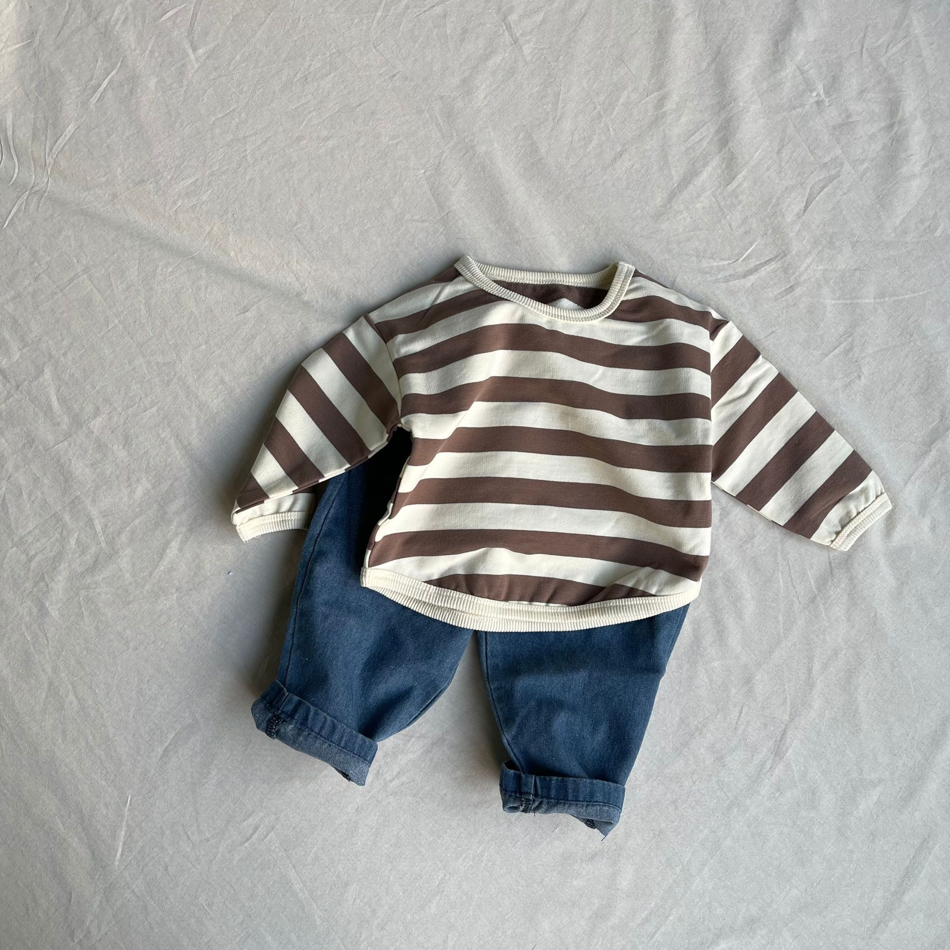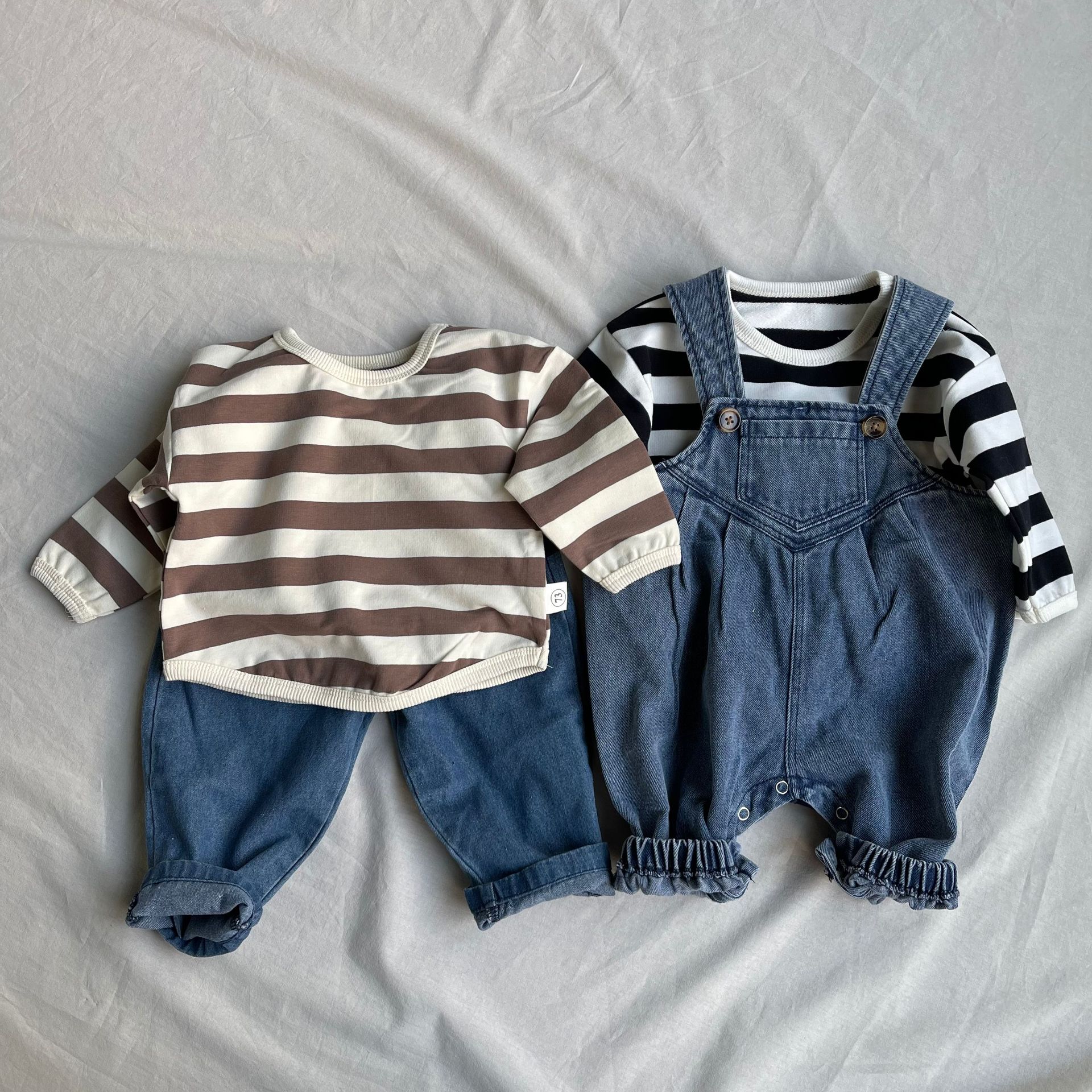 A set of a striped long-sleeved T-shirt and denim suspender pants. The casual design is perfect for everyday use. The T-shirt is made of soft and comfortable material, and the denim pants have a loose silhouette that allows for easy movement. The suspenders are adjustable, so you can adjust the fit as your child grows. These items are easy to coordinate with each other, as well as wearing them as a set.