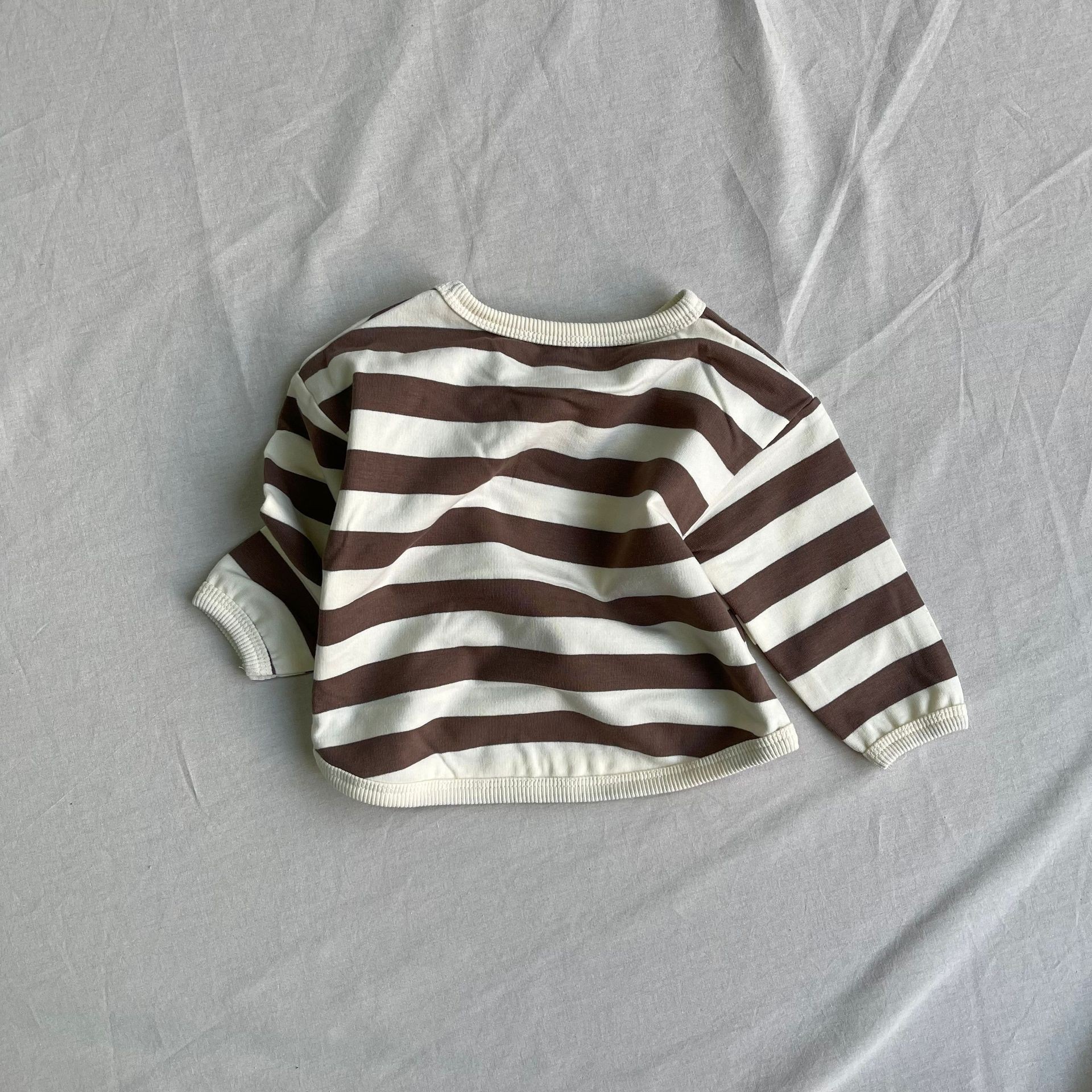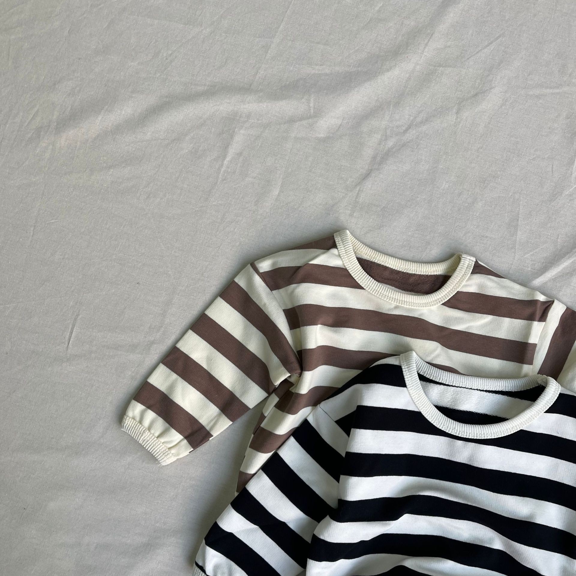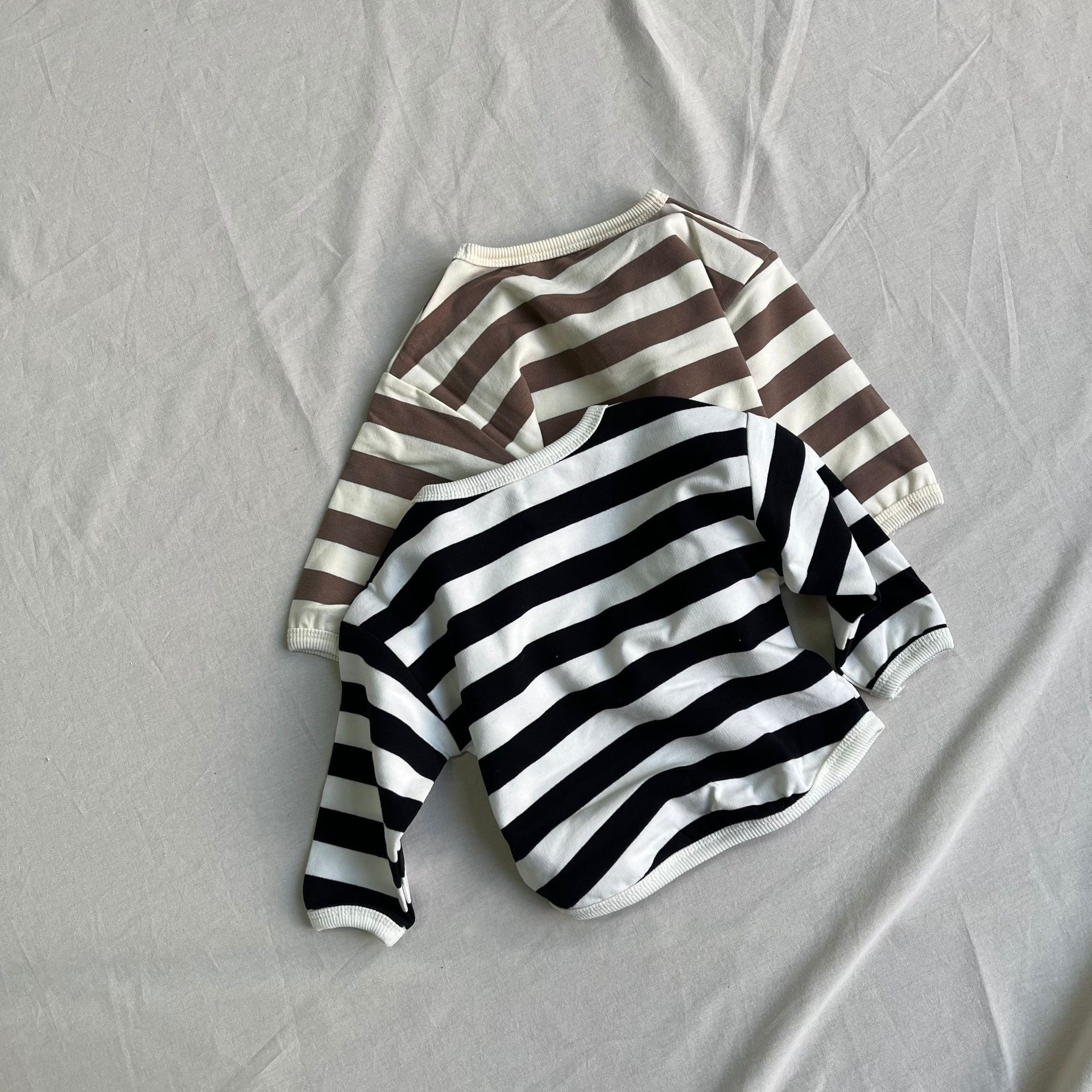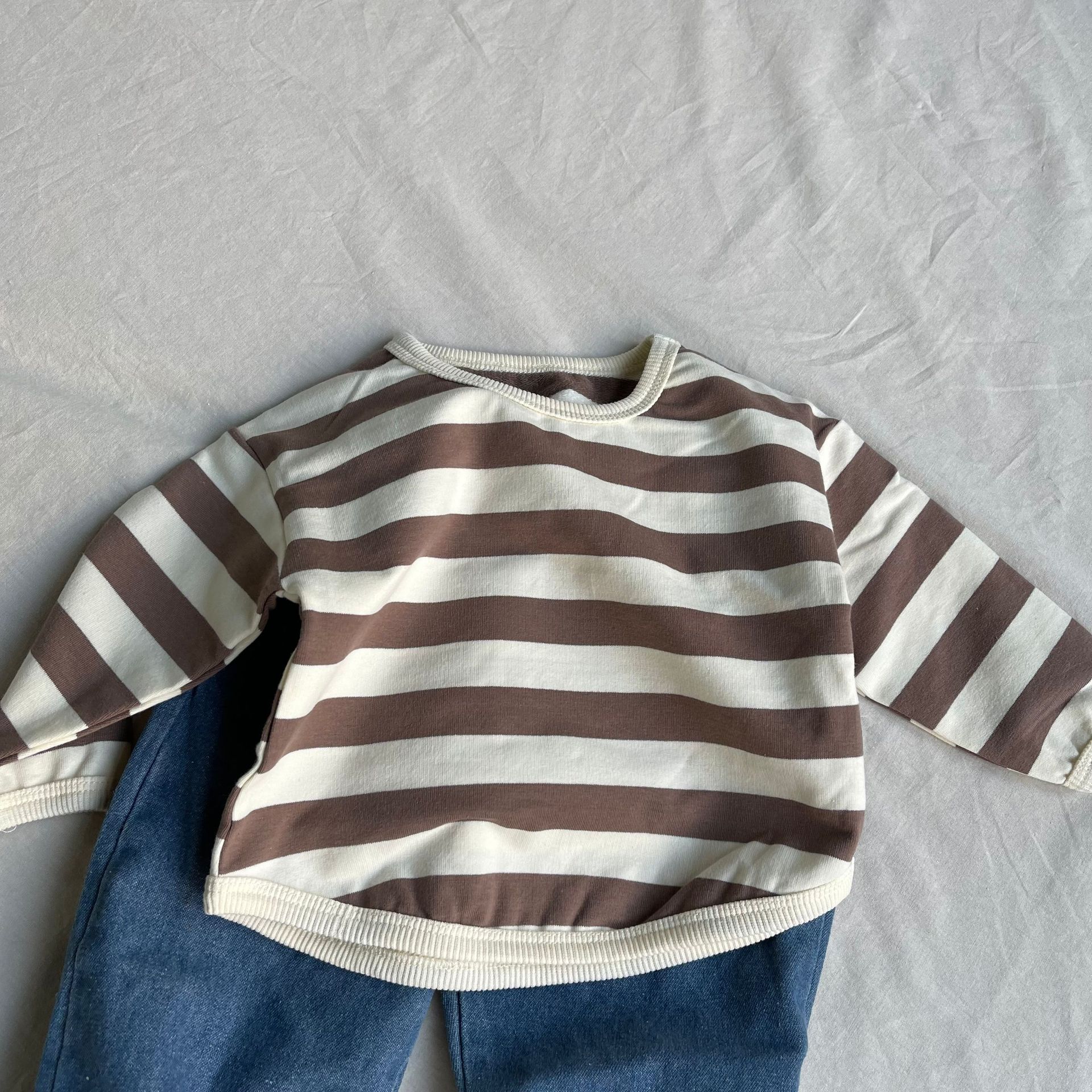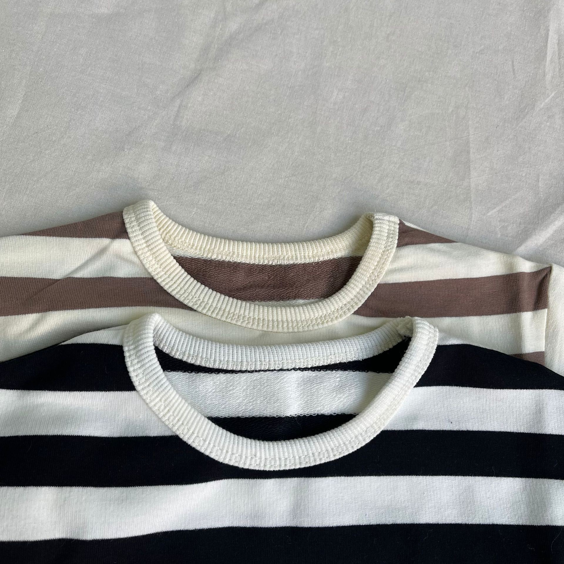 A set of a striped long-sleeved T-shirt and denim suspender pants. The casual design is perfect for everyday use. The T-shirt is made of soft and comfortable material, and the denim pants have a loose silhouette that allows for easy movement. The suspenders are adjustable, so you can adjust the fit as your child grows. These items are easy to coordinate with each other, as well as wearing them as a set.