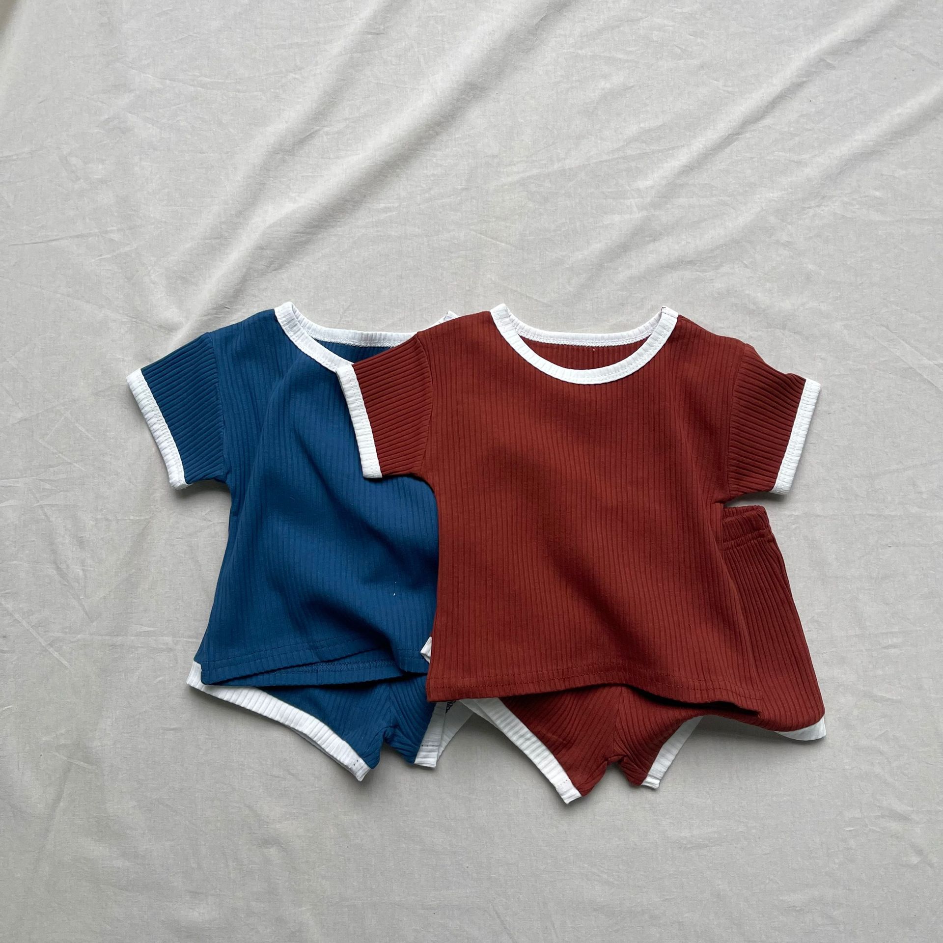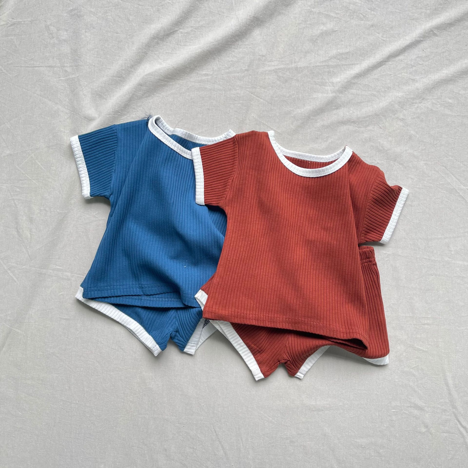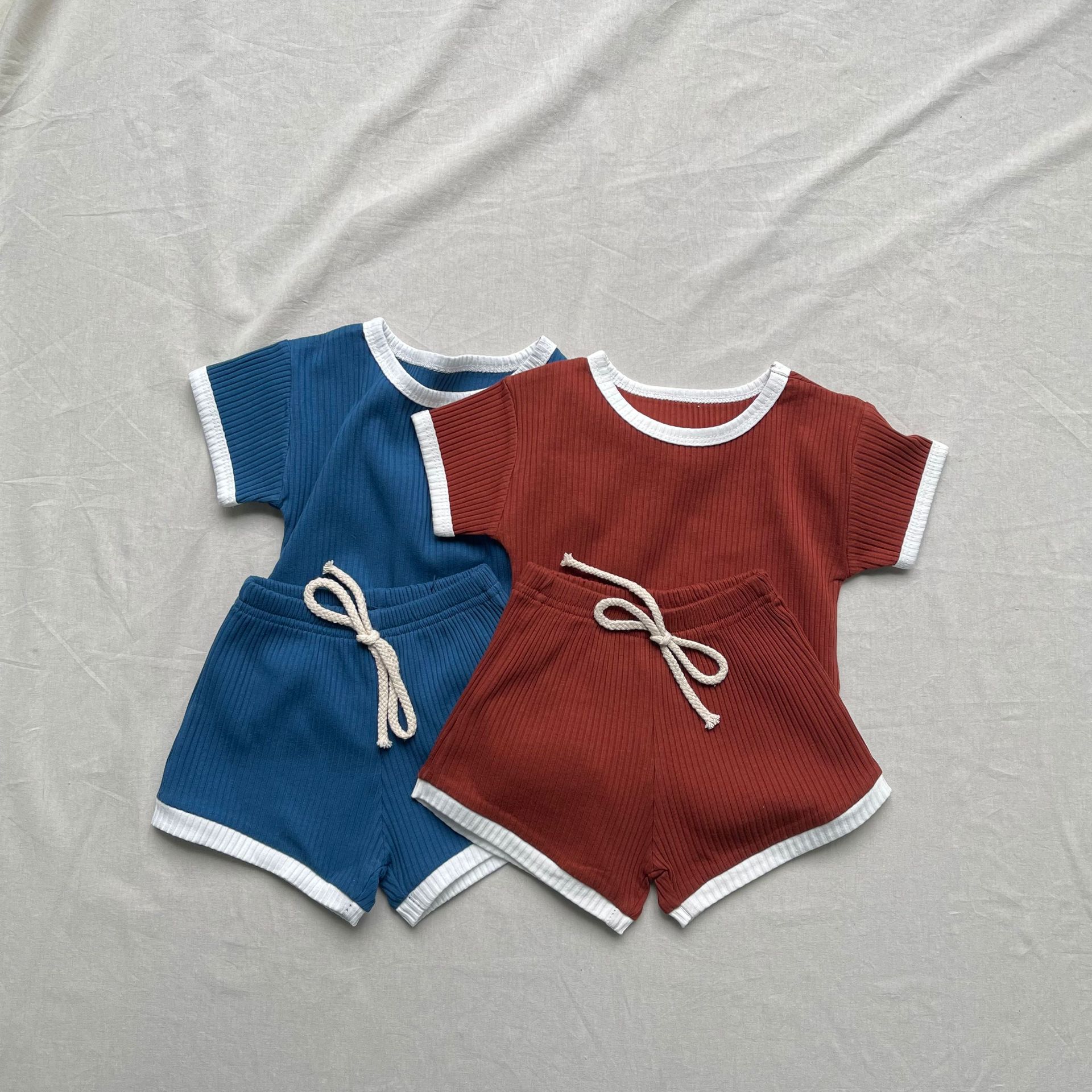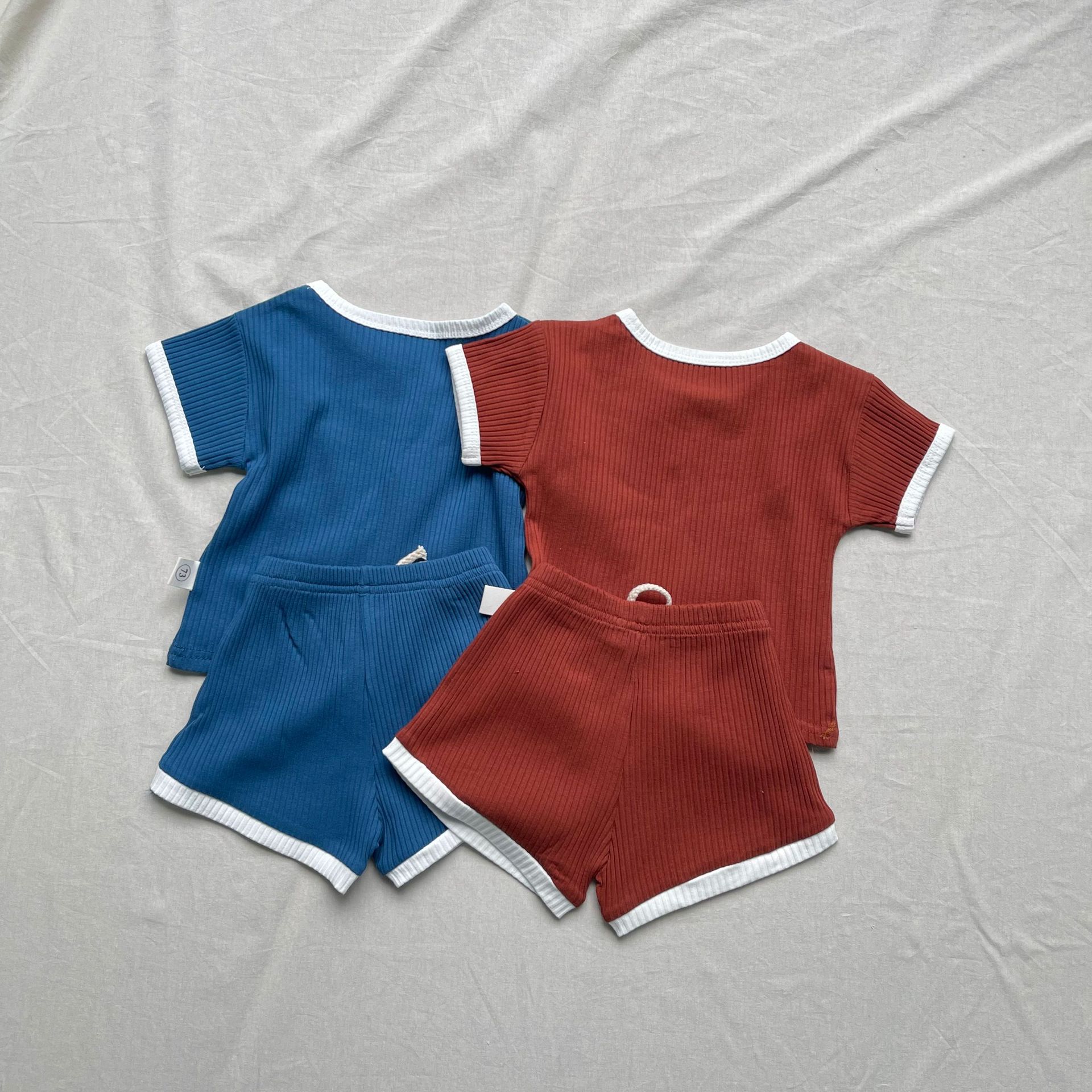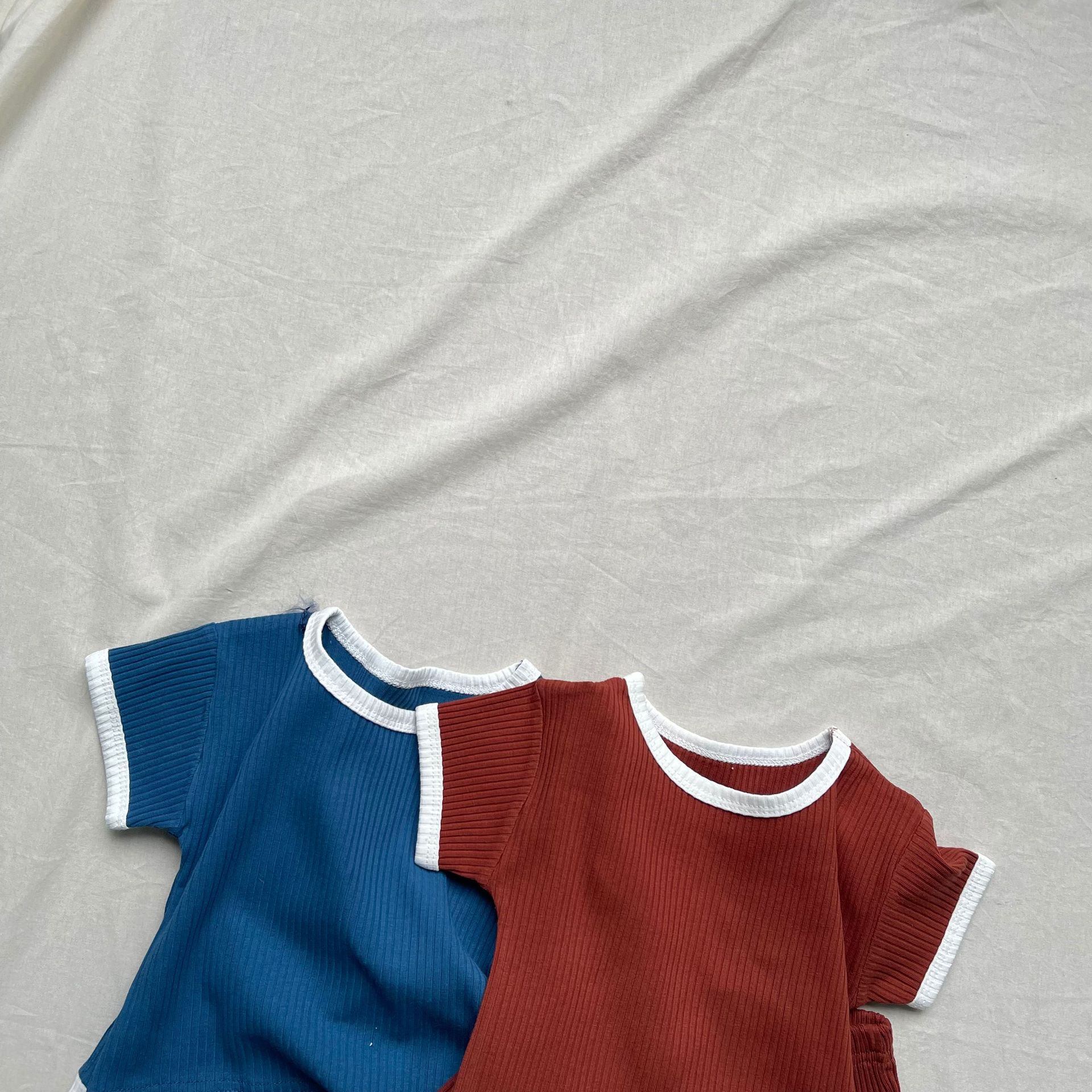 A short-sleeved T-shirt and short pants set with piping as an accent. The design is accented with a simple solid color and contrasting edging, creating a casual and stylish look. Made of soft cotton material, it is gentle on the delicate skin of babies and toddlers and provides a comfortable fit. The silhouette is designed for ease of movement, making it a perfect piece for spending time at home or playing outside. It is easy to put on without needing to coordinate with other items, making it useful for daily use.