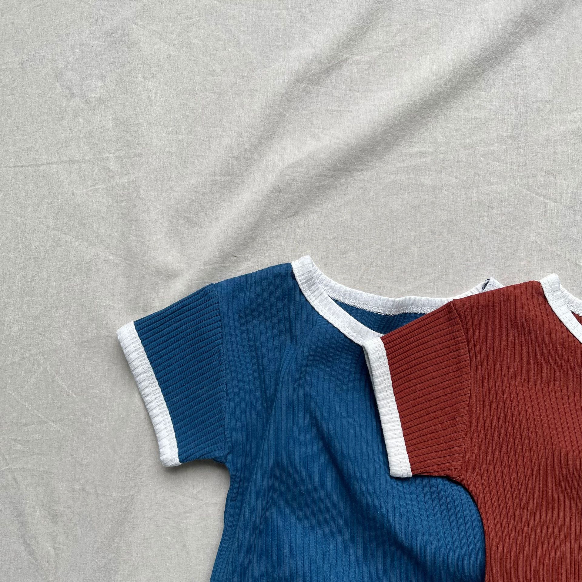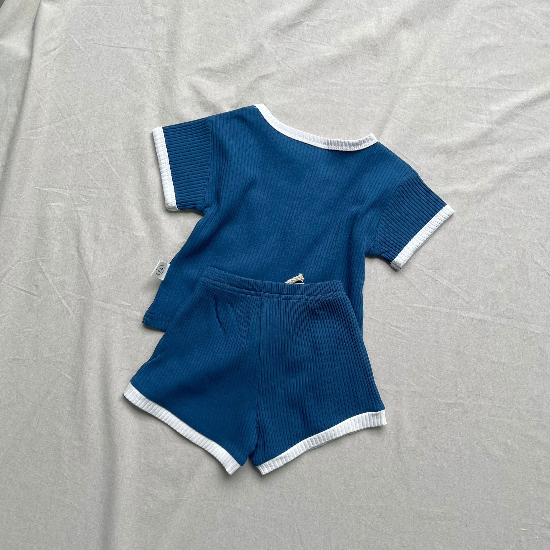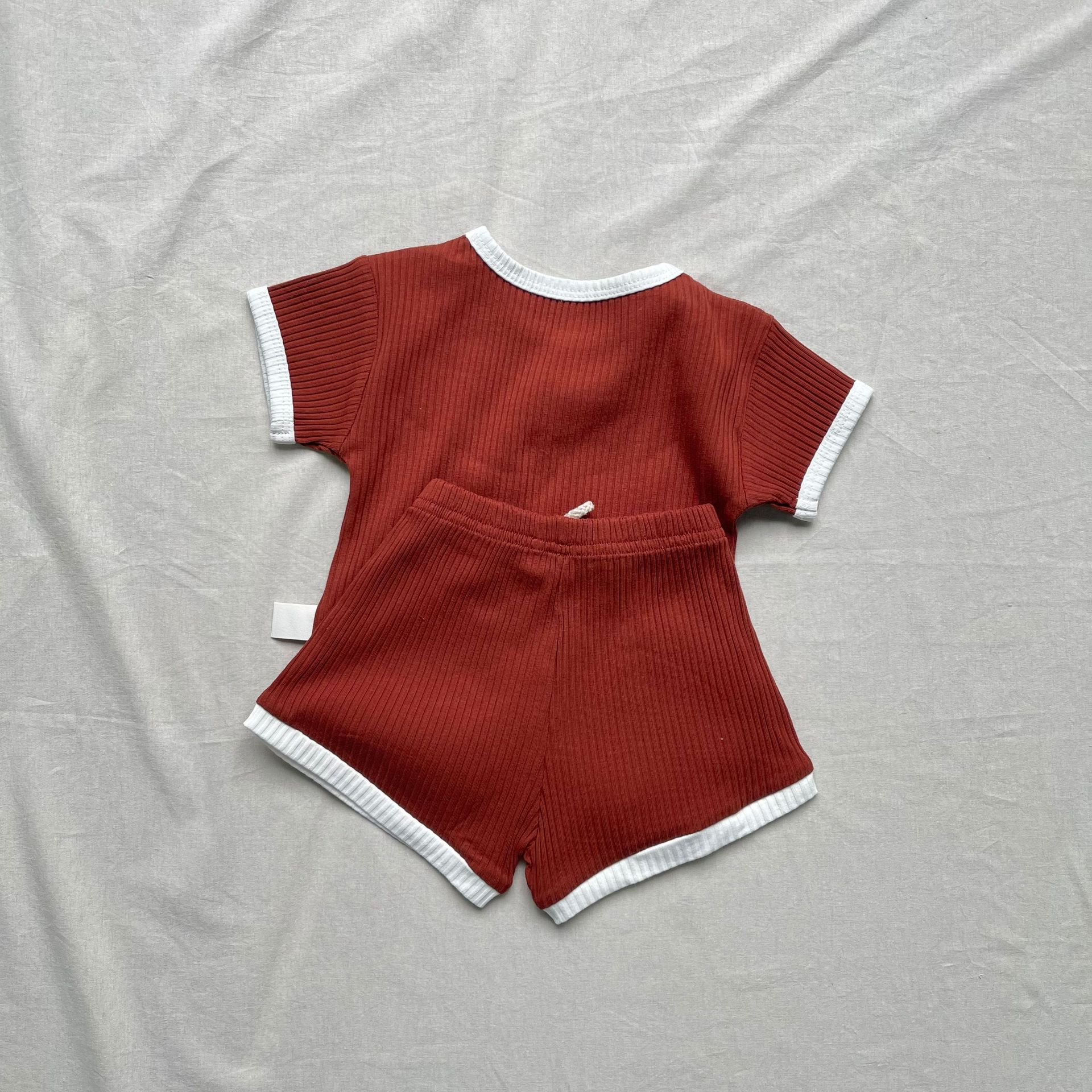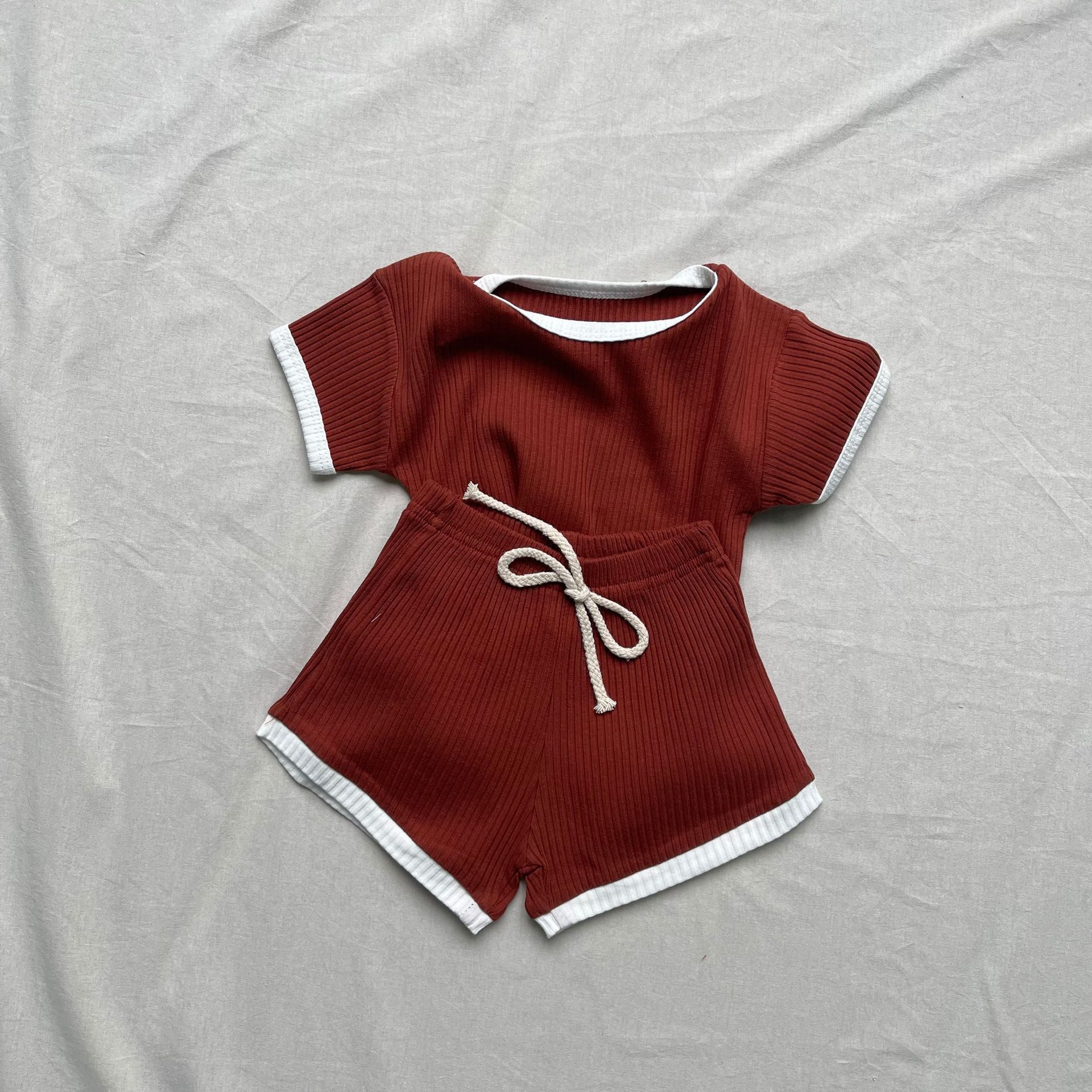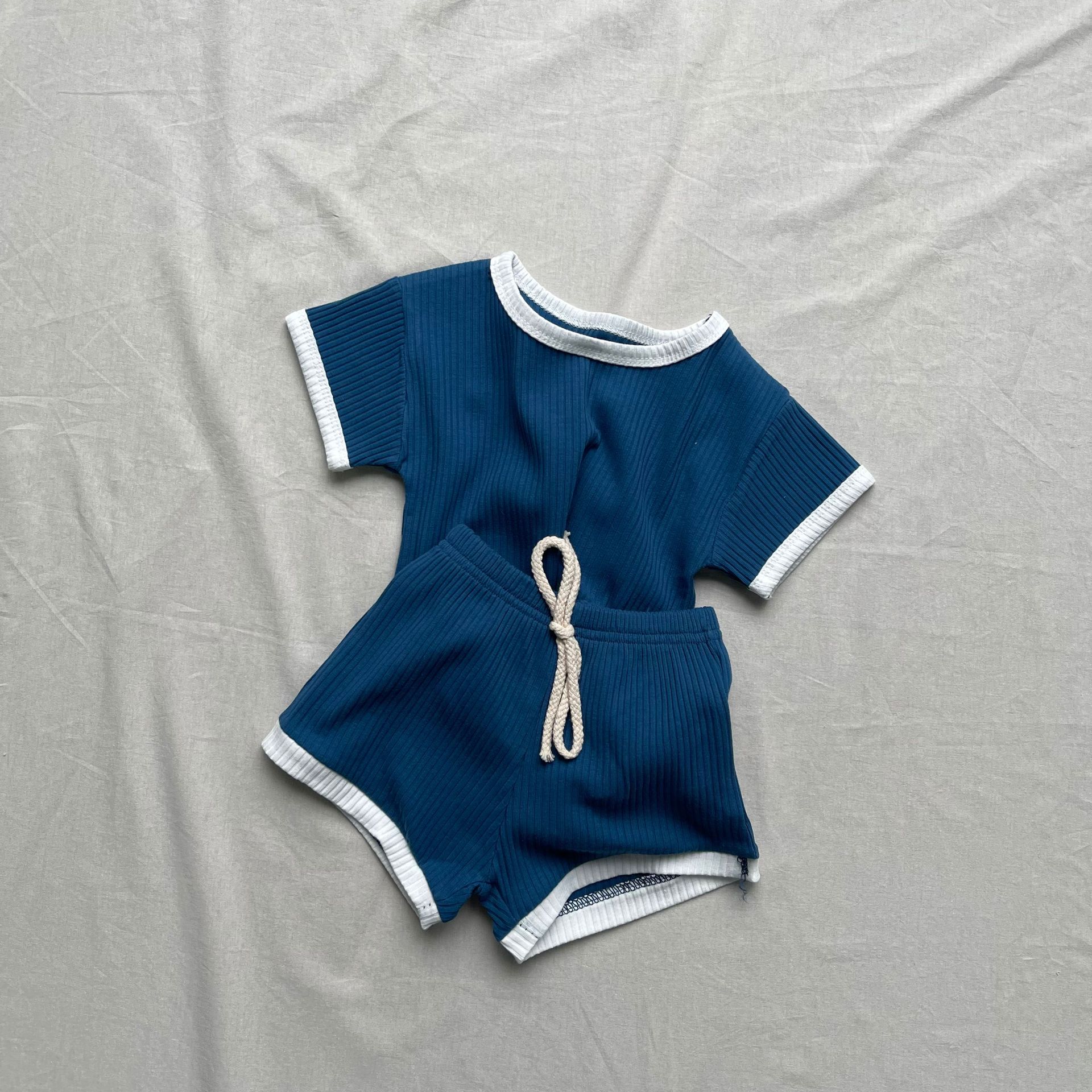 A short-sleeved T-shirt and short pants set with piping as an accent. The design is accented with a simple solid color and contrasting edging, creating a casual and stylish look. Made of soft cotton material, it is gentle on the delicate skin of babies and toddlers and provides a comfortable fit. The silhouette is designed for ease of movement, making it a perfect piece for spending time at home or playing outside. It is easy to put on without needing to coordinate with other items, making it useful for daily use.
