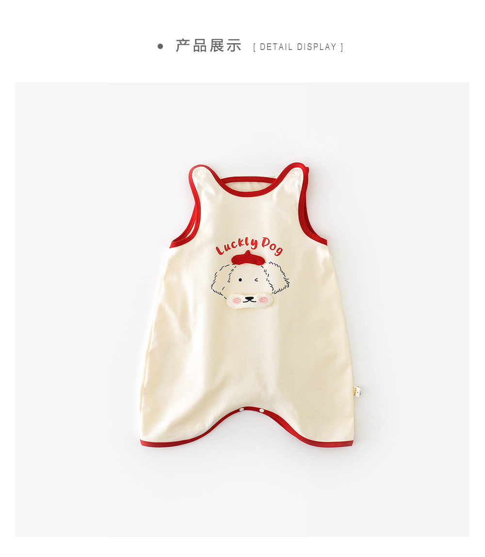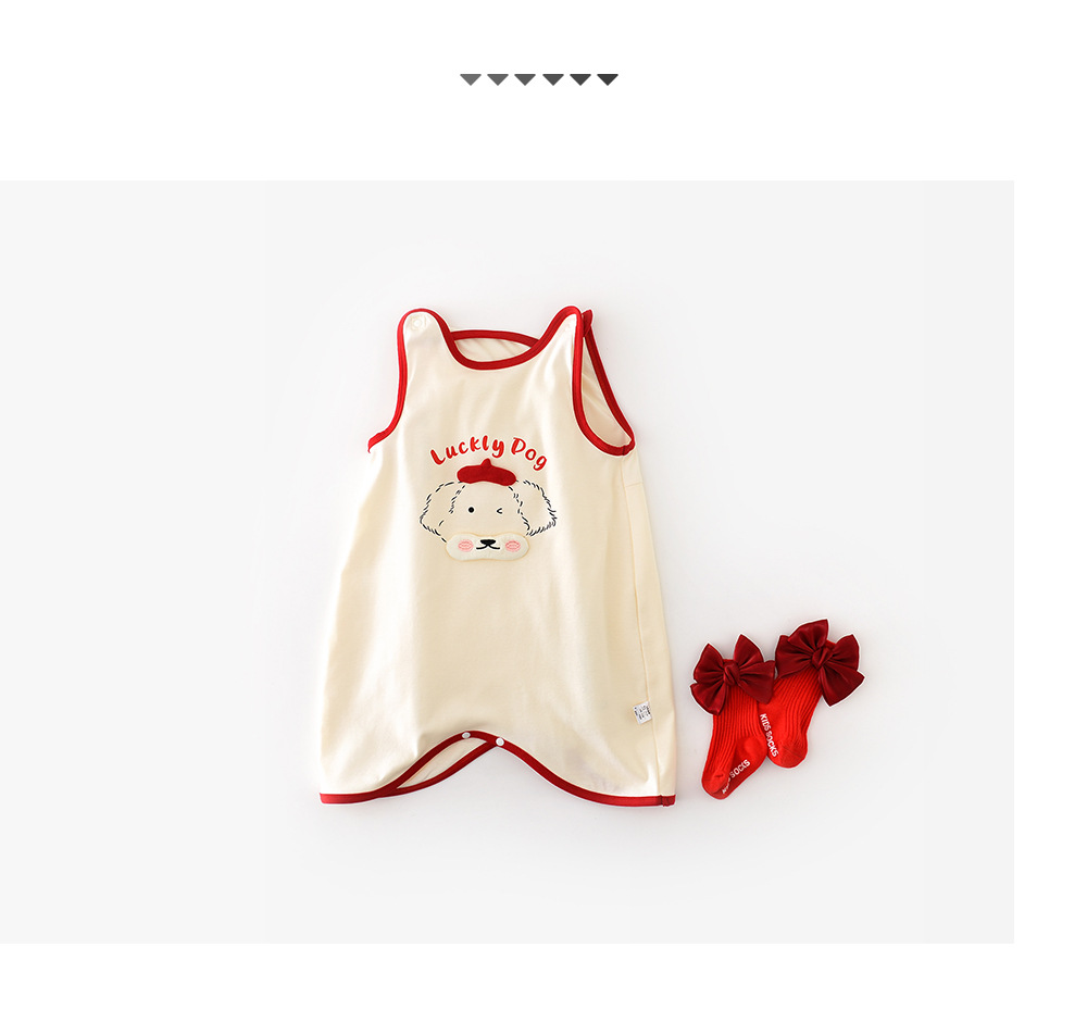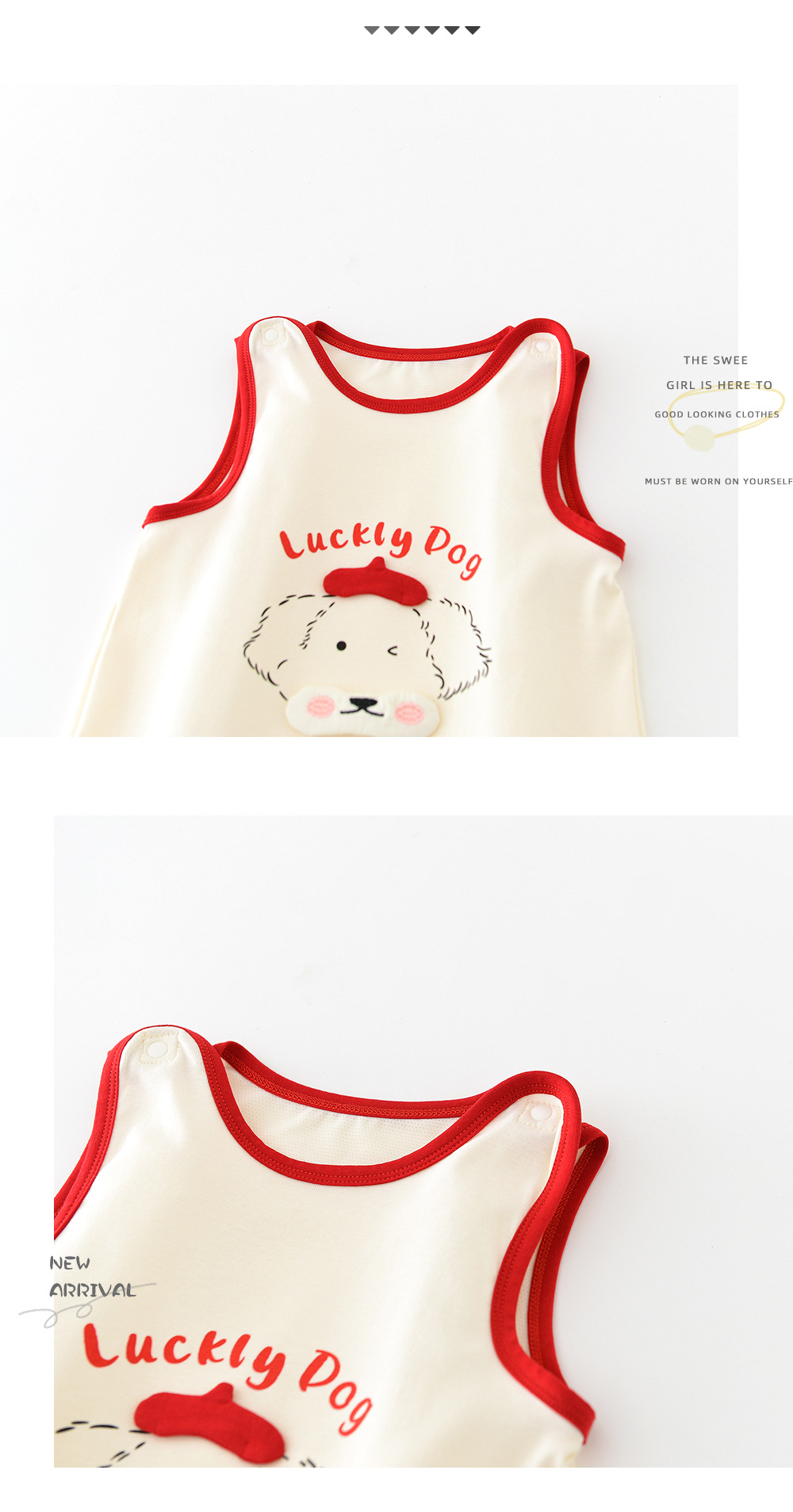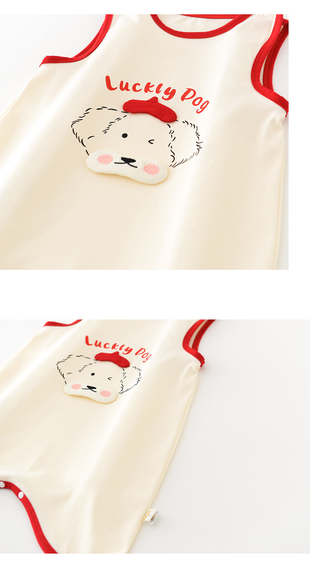 This sleeveless baby romper features a cute dog print that brings good luck. The cool design is perfect for summer and will make your baby look even more adorable. The sleeveless design makes dressing easy, so even active babies will feel comfortable. Snap buttons at the crotch make diaper changes a breeze. The soft, comfortable material is safe for your baby's delicate skin. This item is perfect for a variety of occasions, from relaxing at home to going out. The adorable dog print is sure to bring a smile to everyone's faces.