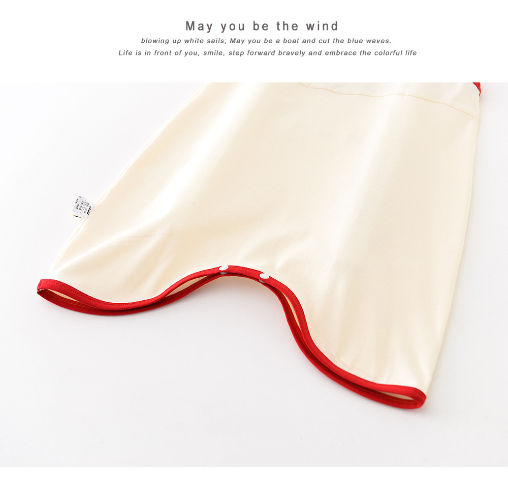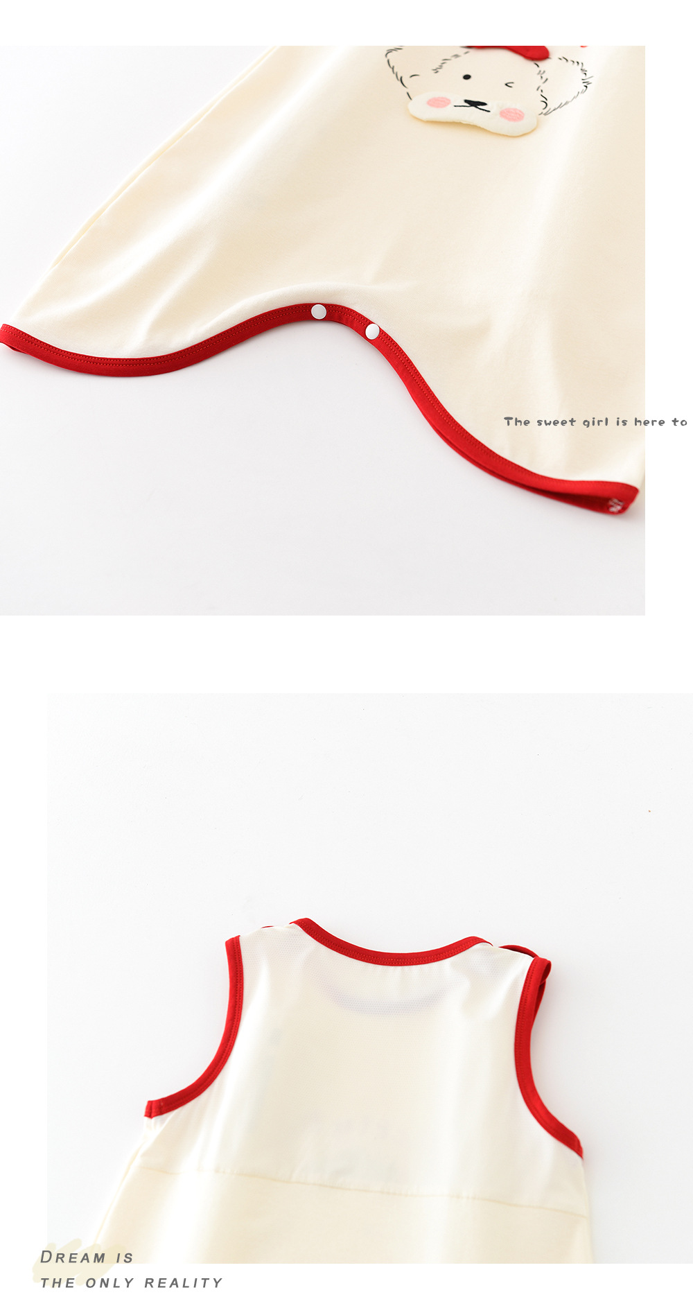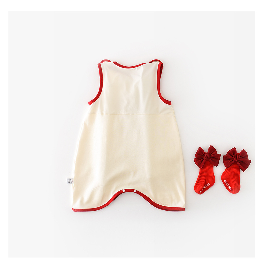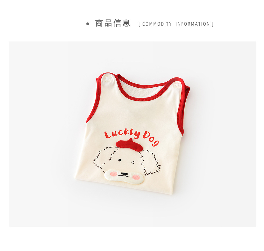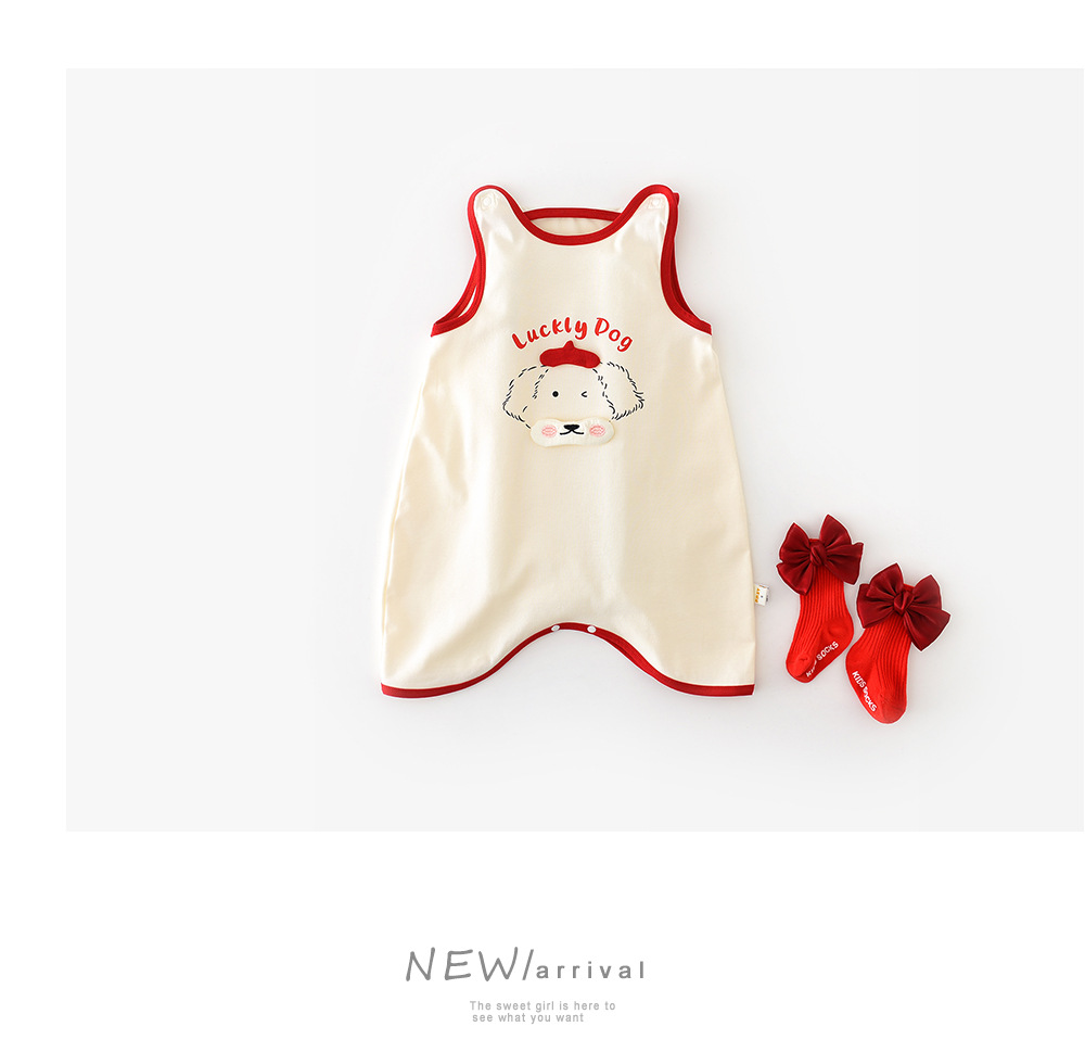 This sleeveless baby romper features a cute dog print that brings good luck. The cool design is perfect for summer and will make your baby look even more adorable. The sleeveless design makes dressing easy, so even active babies will feel comfortable. Snap buttons at the crotch make diaper changes a breeze. The soft, comfortable material is safe for your baby's delicate skin. This item is perfect for a variety of occasions, from relaxing at home to going out. The adorable dog print is sure to bring a smile to everyone's faces.