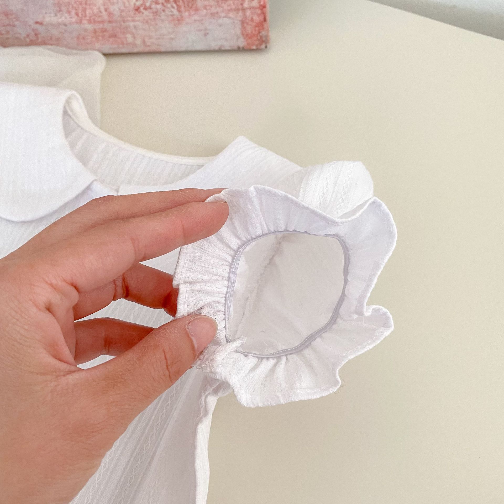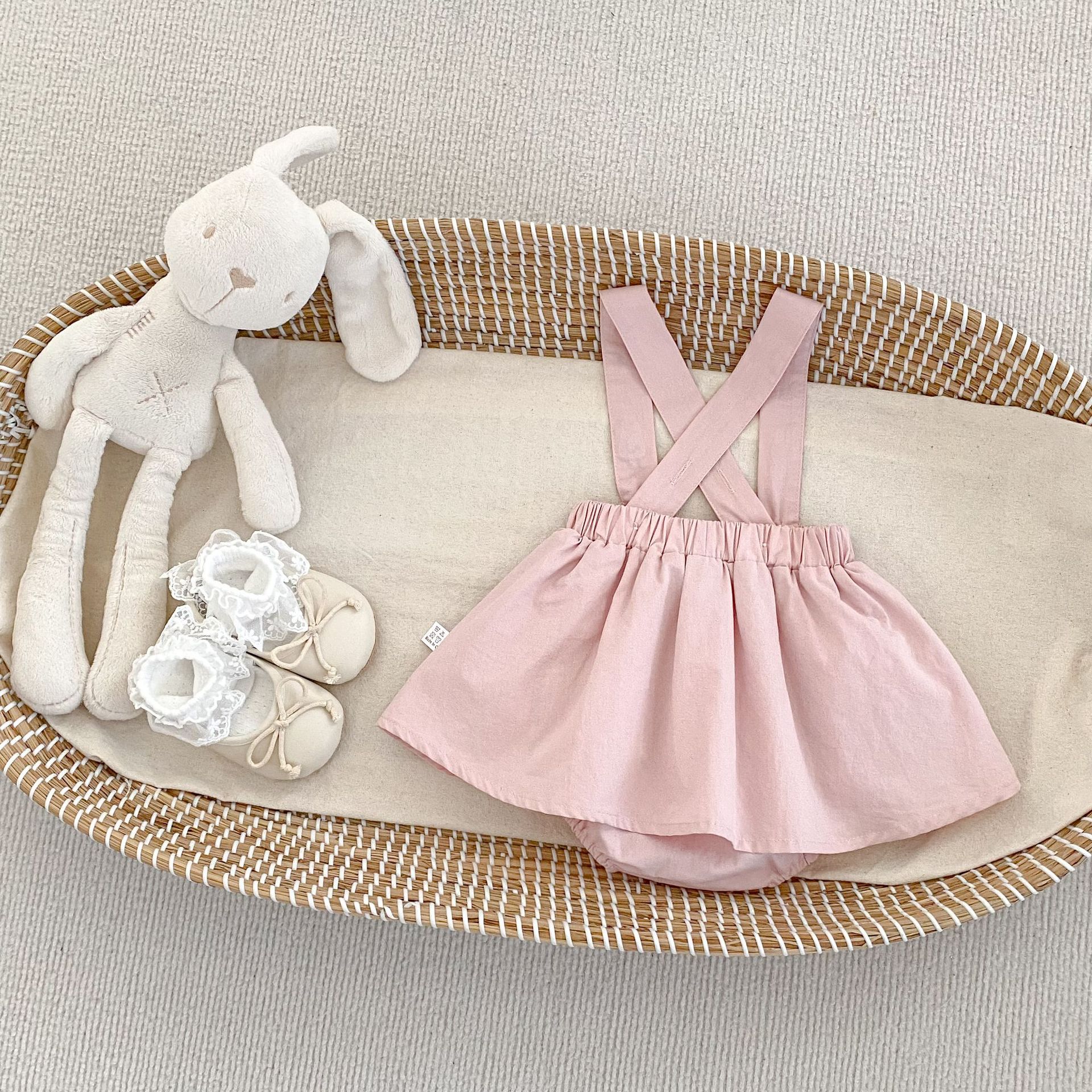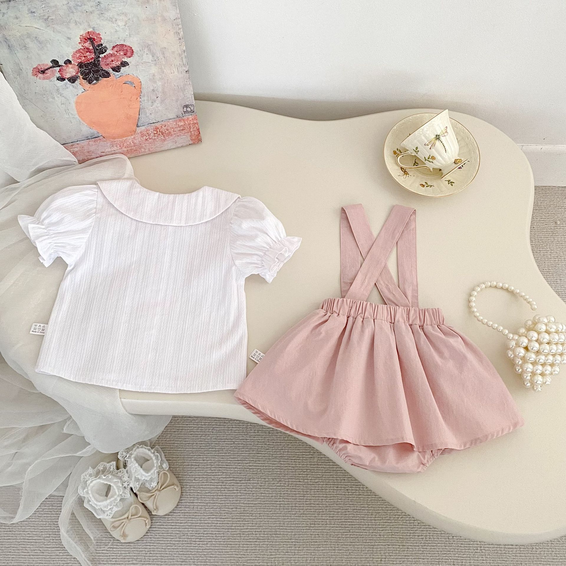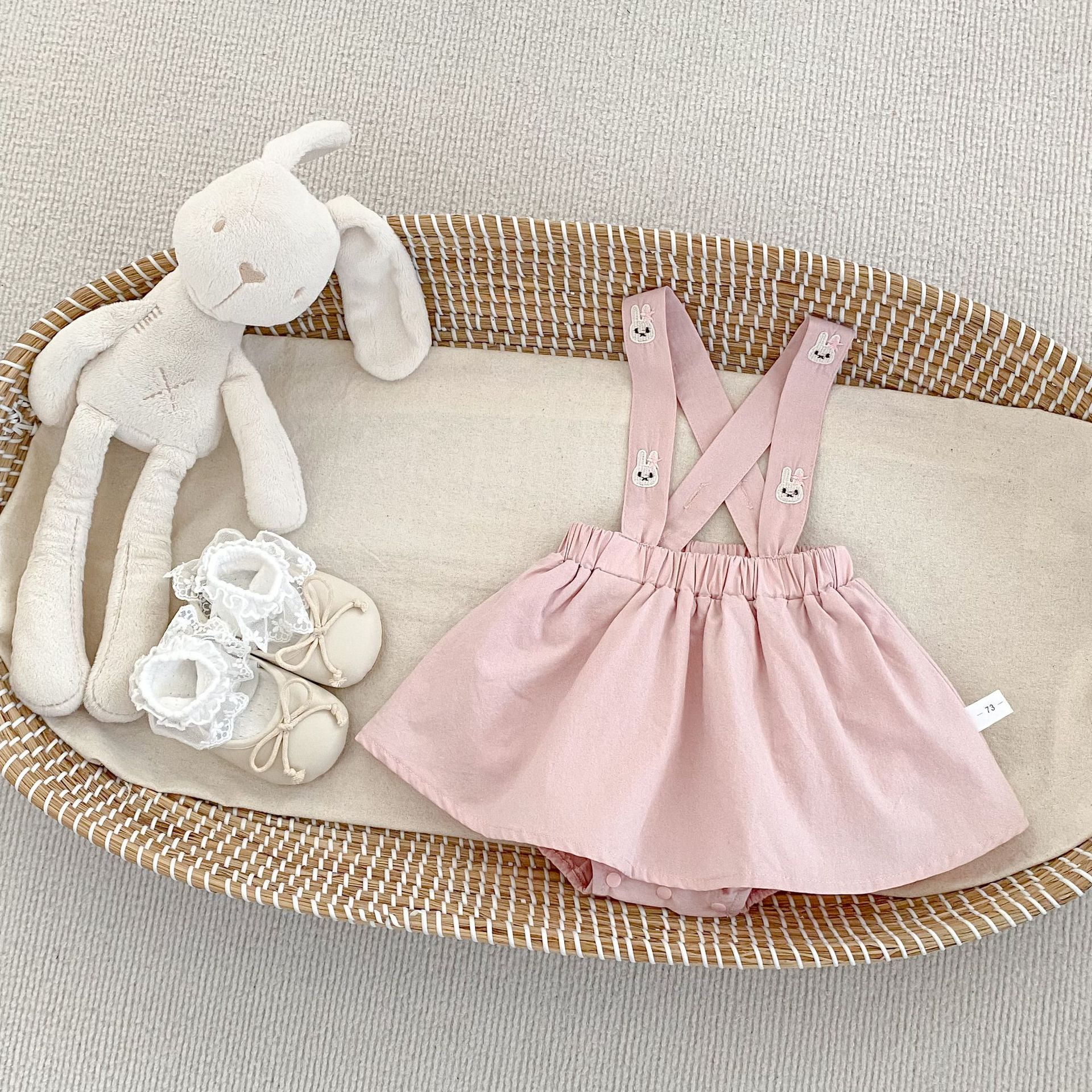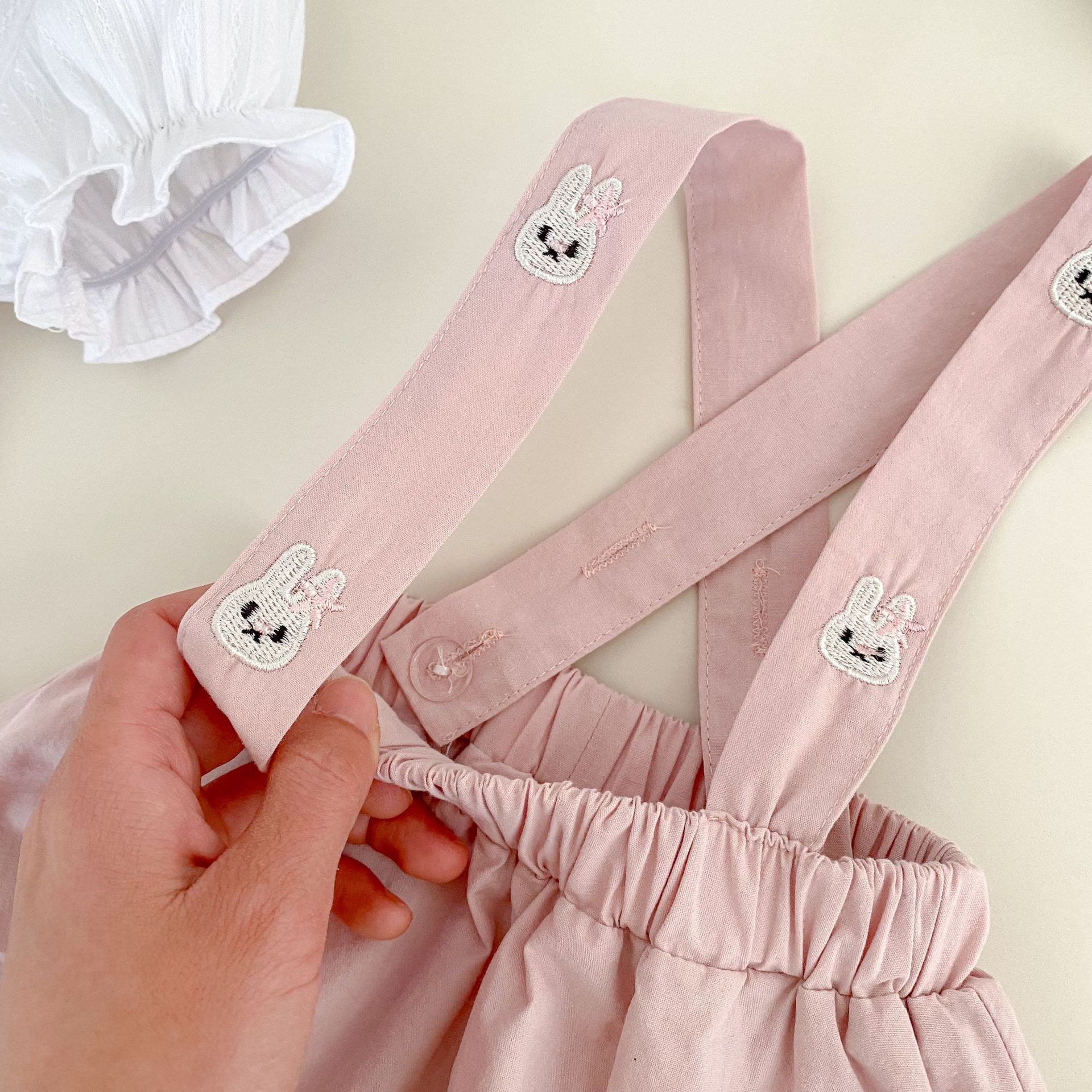 This baby girl's outfit features a short-sleeved blouse with adorable rabbit embroidery and culottes with suspenders. Crafted from lightweight material, it's perfect for summer babies. The subtle embroidery on the blouse adds a touch of elegant cuteness. The culottes are easy to move in and easy to put on and take off. The suspenders have adjustable buttons for a comfortable fit. Perfect for everyday wear or casual outings. The top and bottom can be worn separately, allowing for a wide range of coordination options.