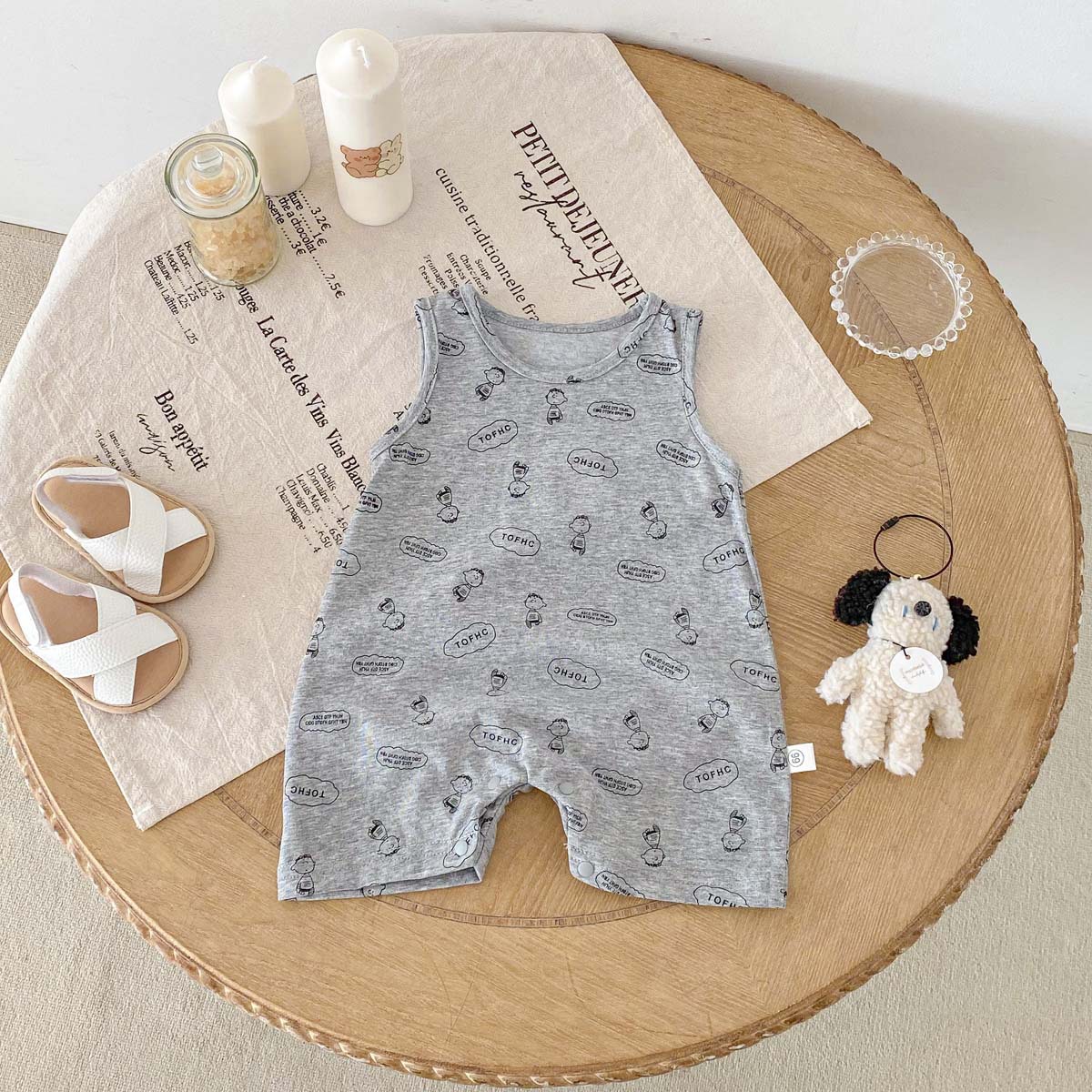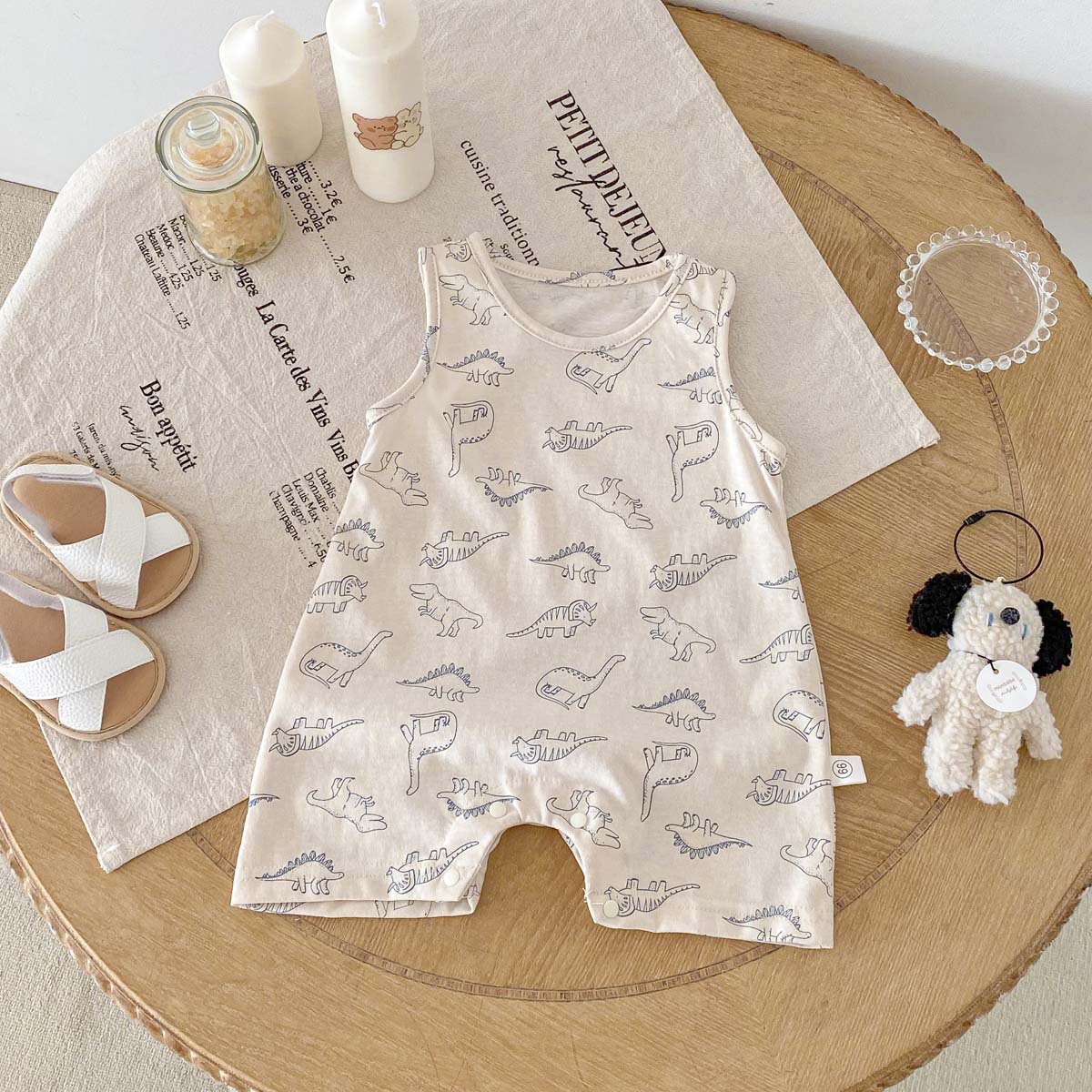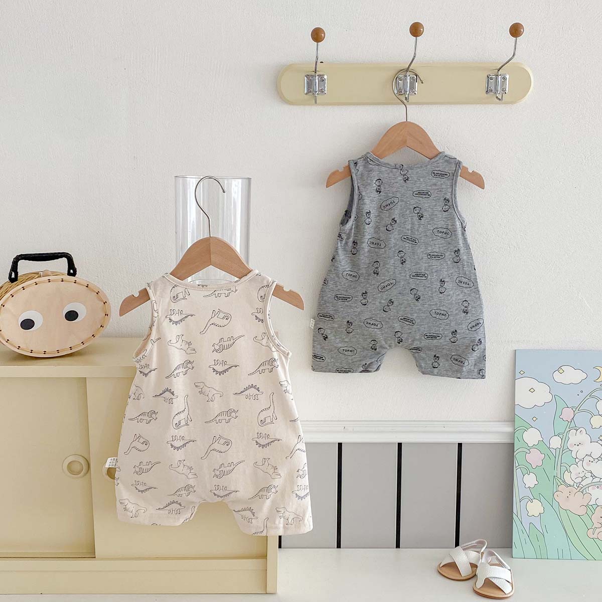 This sleeveless romper for baby boys features a lively dinosaur print that will inspire your baby's adventurous spirit. Made from cool, refreshing material, it's perfect for summer babies. The easy-to-move design makes changing clothes and diapers a breeze. It's perfect for everyday wear as well as playing outside. It's a playful item that will bring out your baby's cuteness.