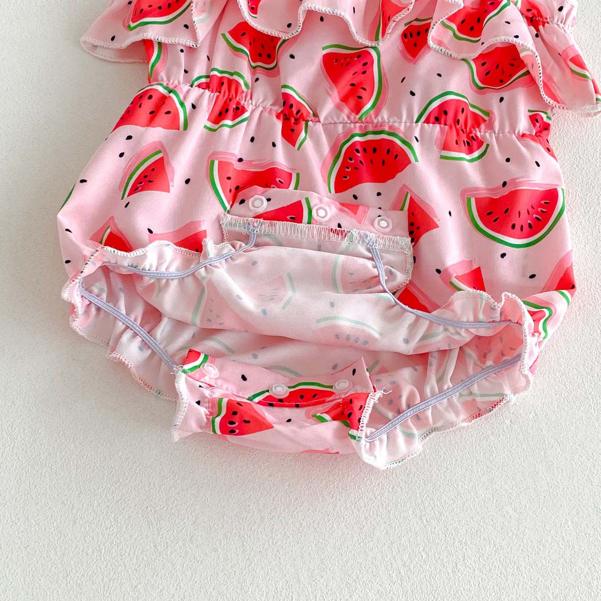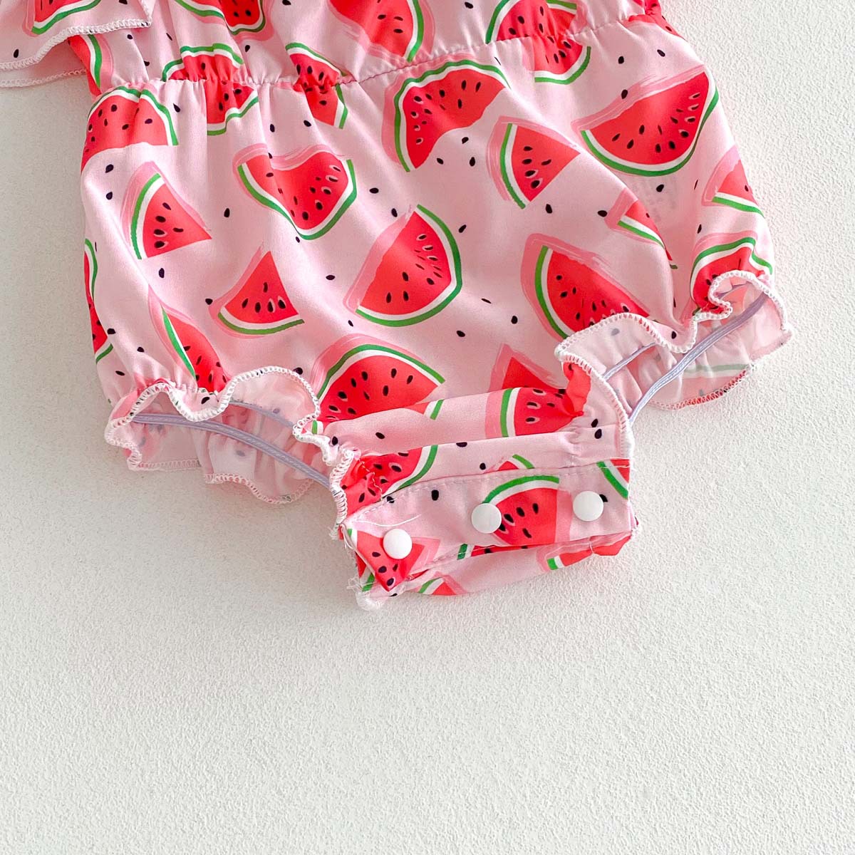 This baby girl's camisole romper features a juicy watermelon print and a ruffled chest for a summery look. Crafted from a lightweight, cool material, it's perfect for summer babies. The ruffled shoulders and lace hem add a touch of casual cuteness. Snap buttons at the crotch make dressing and diaper changes easy. Perfect for everyday wear, this romper is also perfect for summer events and water play. It's the perfect piece to add a touch of cuteness to your baby's summer.