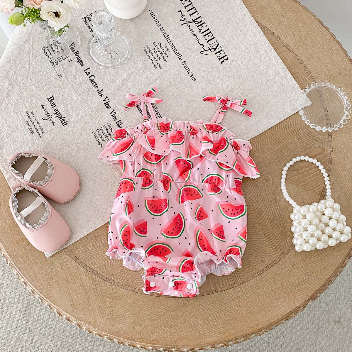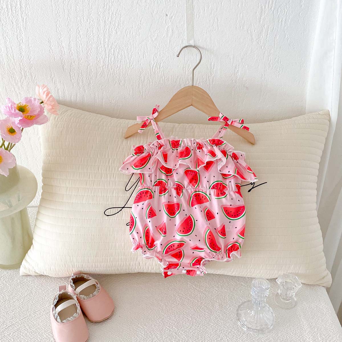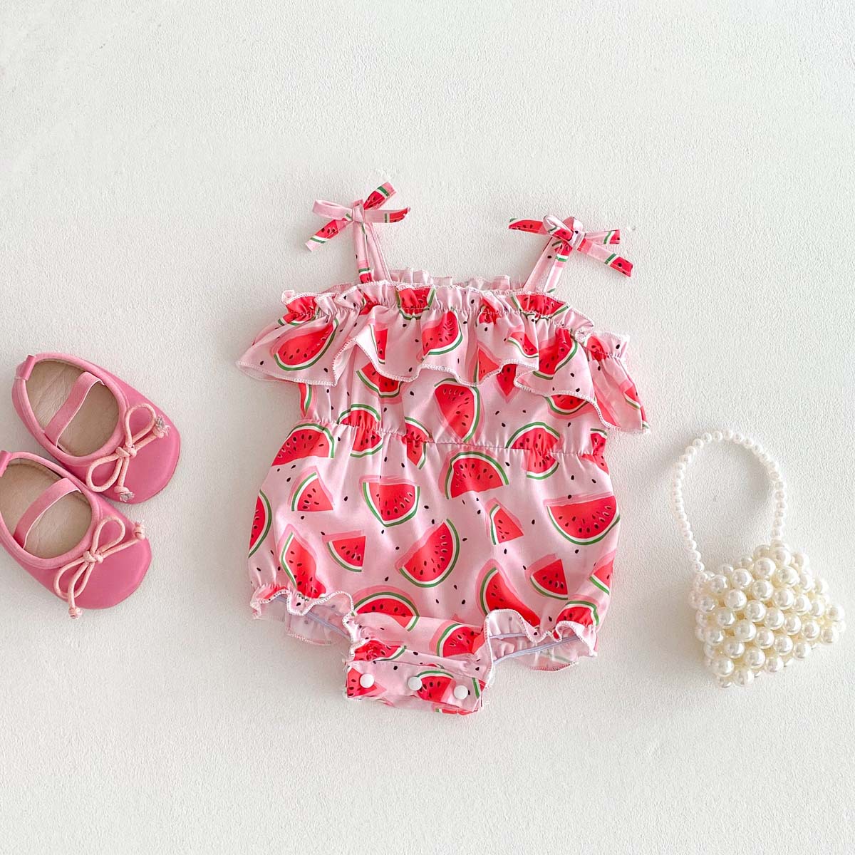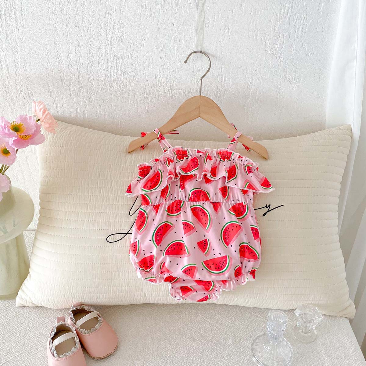 #baby clothes #baby girl #camisole romper #watermelon print #ruffle #lace #summer baby #baby outfit #water play