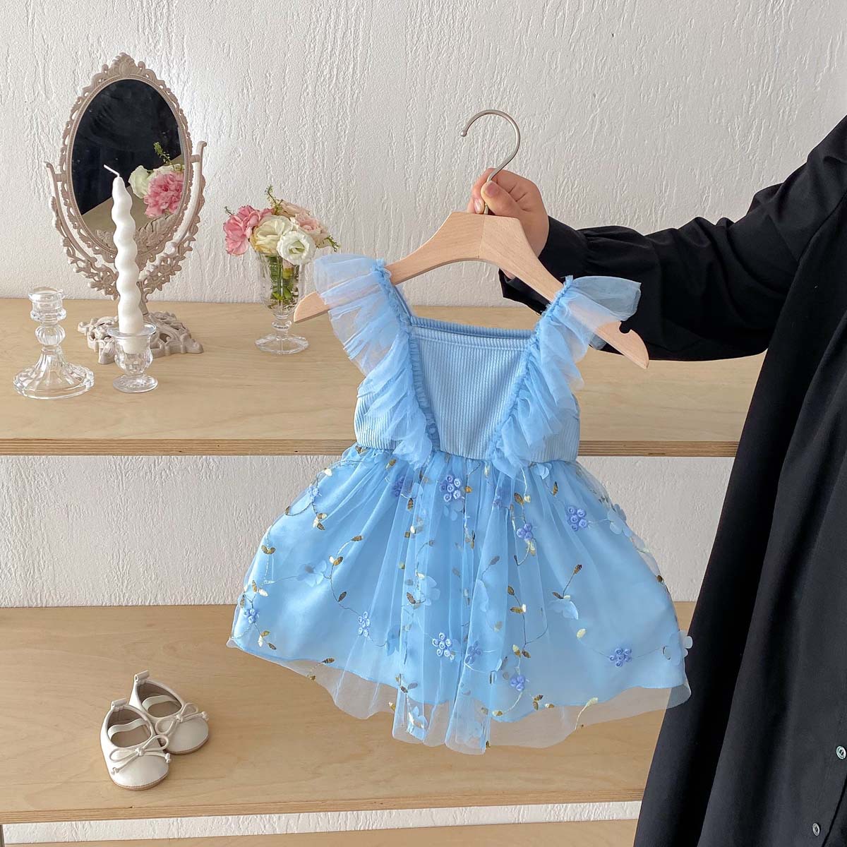 This little girl's dress features a tulle skirt with delicate floral embroidery and fluttering butterfly sleeves, creating a dreamy, adorable look. Crafted from lightweight mesh material, it's perfect for summer wear. The elegant lace accents make it perfect for dressing up for special occasions. Perfect for birthday parties, recitals, commemorative photo shoots, and other special occasions where you want your little one to shine. Of course, it's also a great piece for everyday wear, letting your little one feel like a princess.