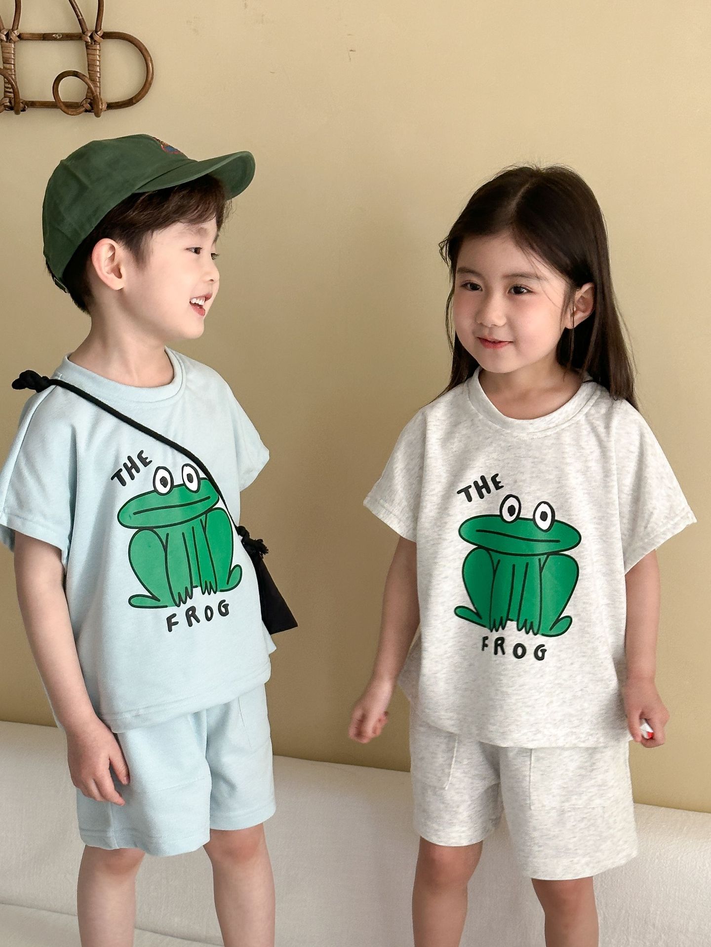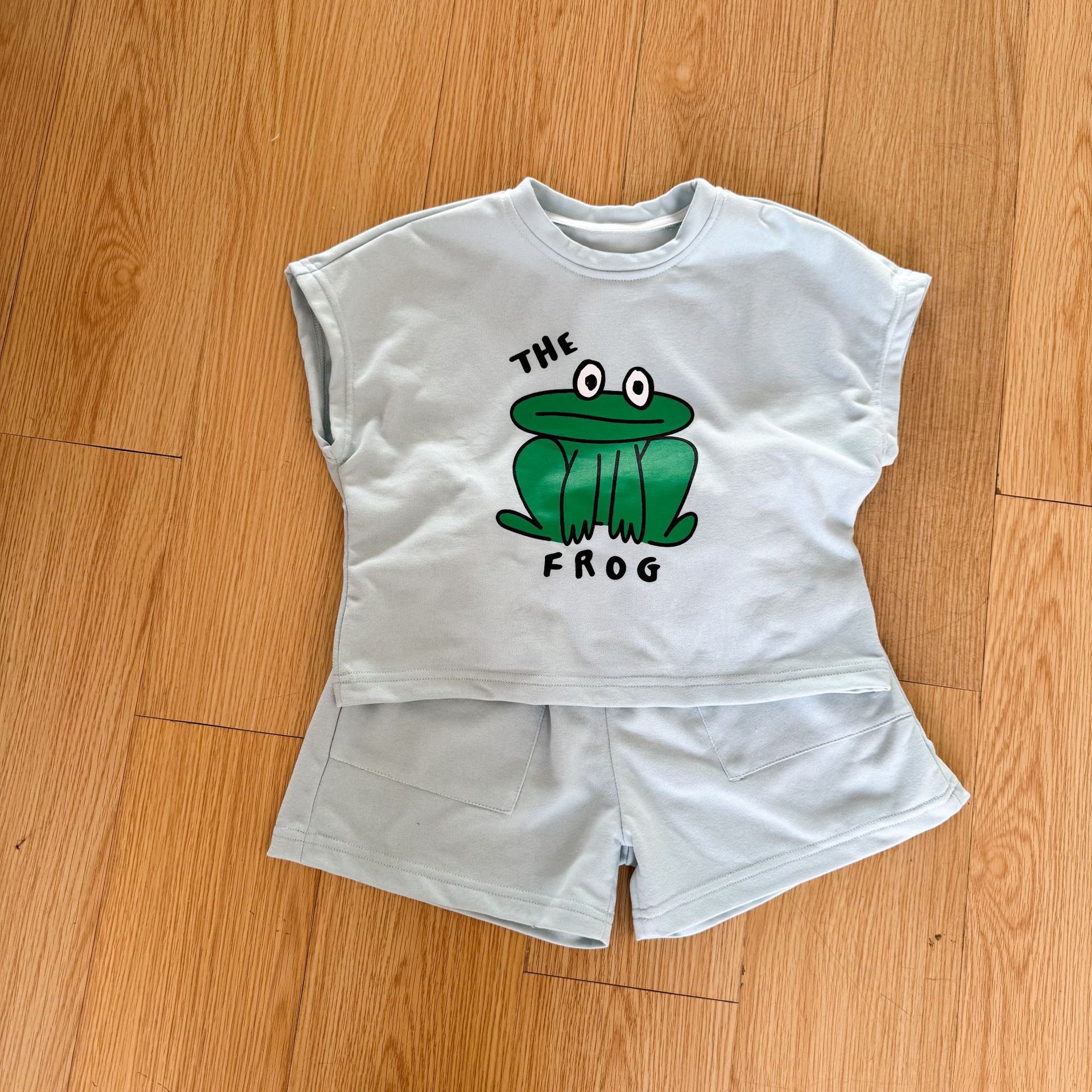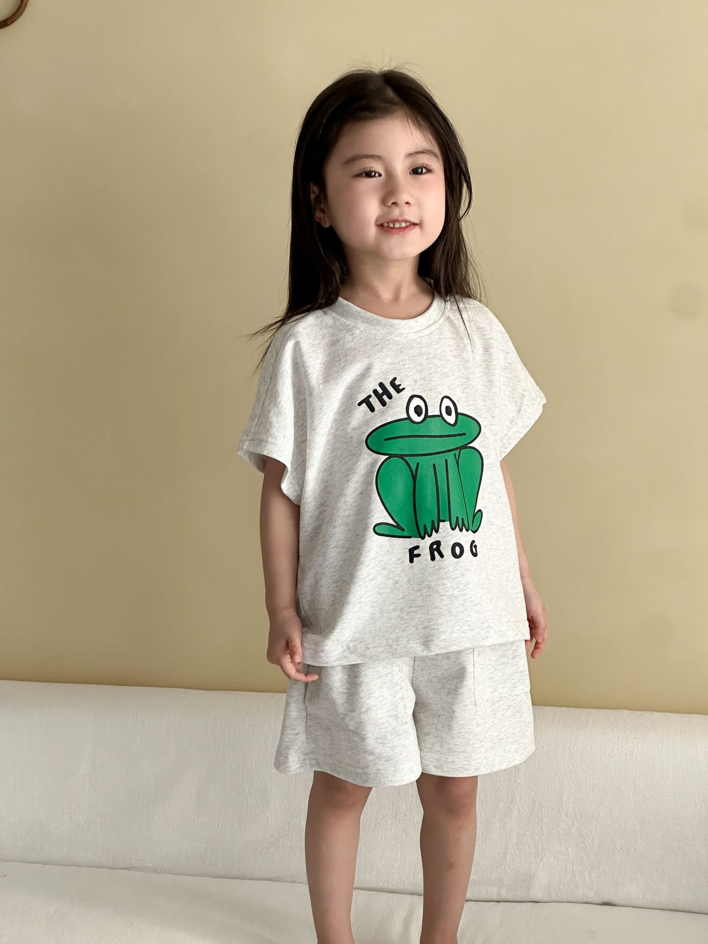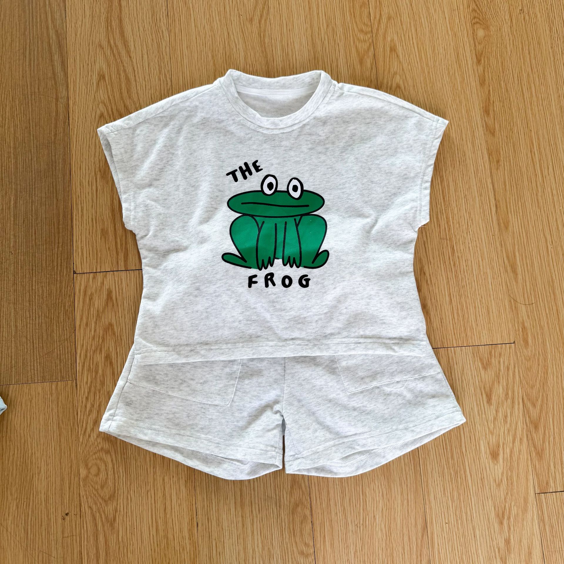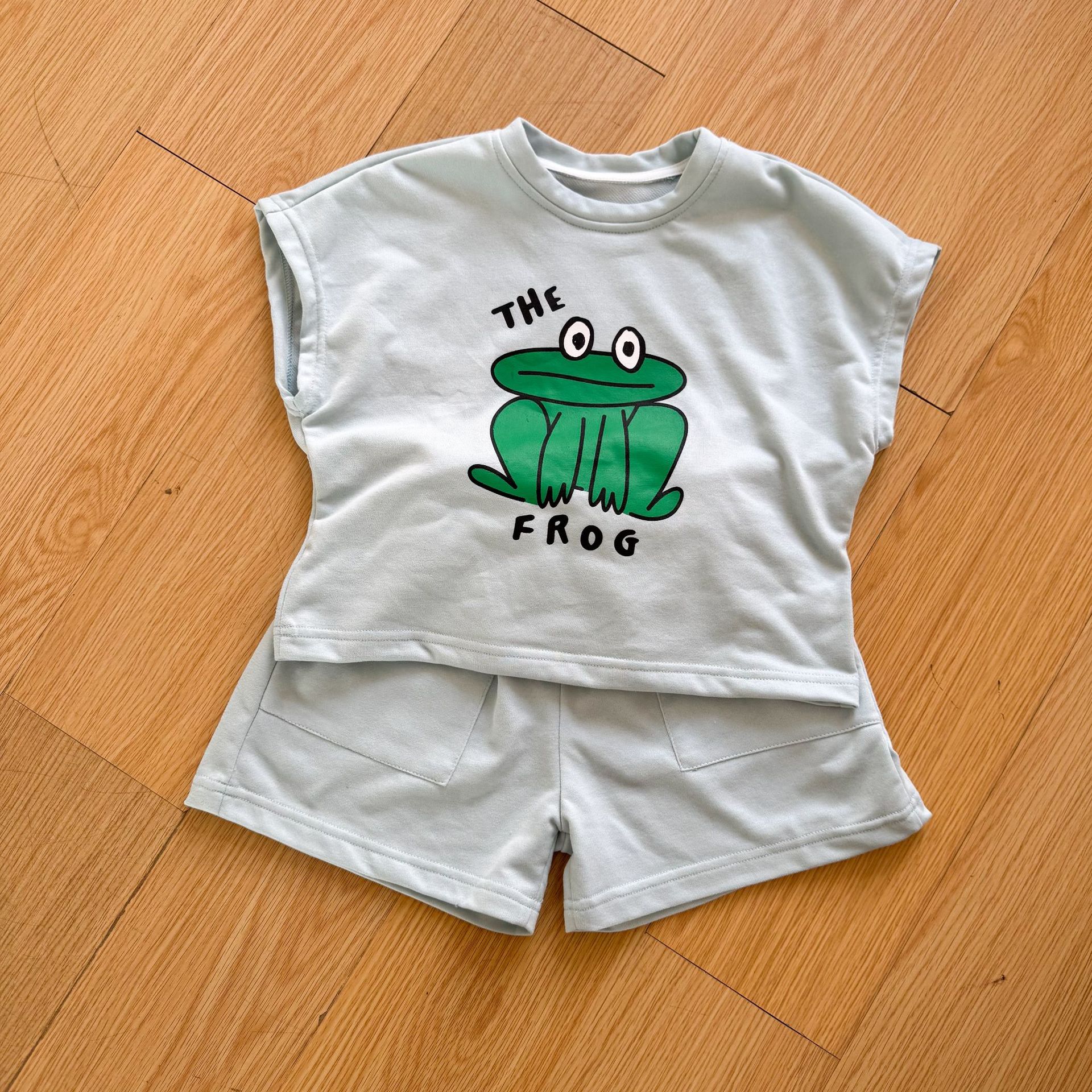 This two-piece set features a frog print short-sleeved T-shirt and shorts, making it comfortable for kids to wear. The T-shirt features a cute frog print , while the shorts have a simple design, creating a coordinated look when combined.