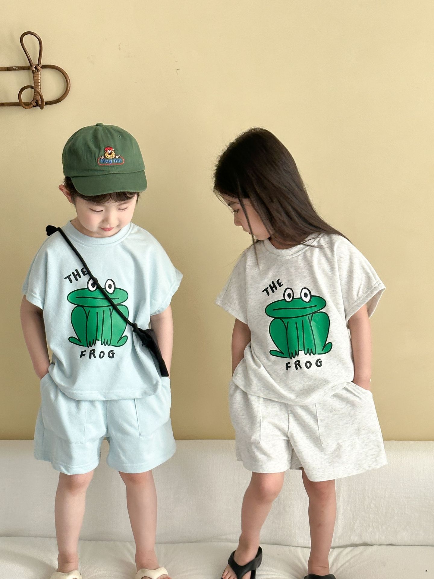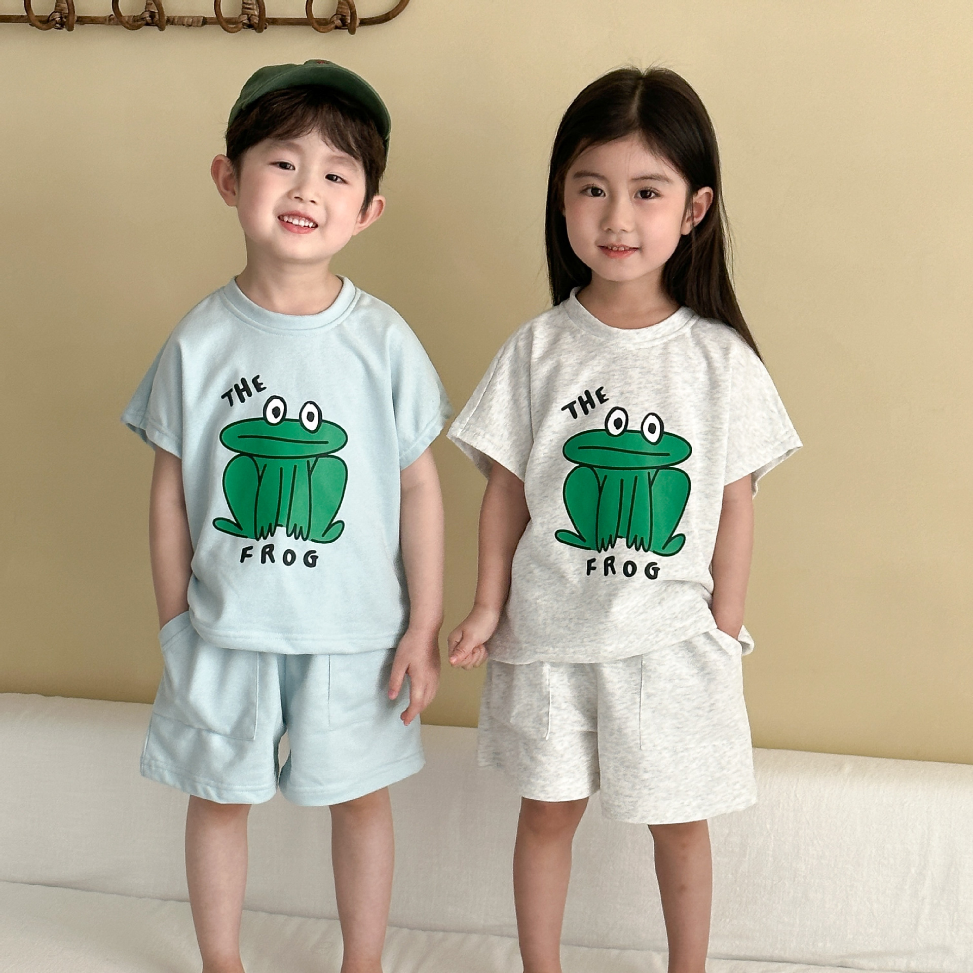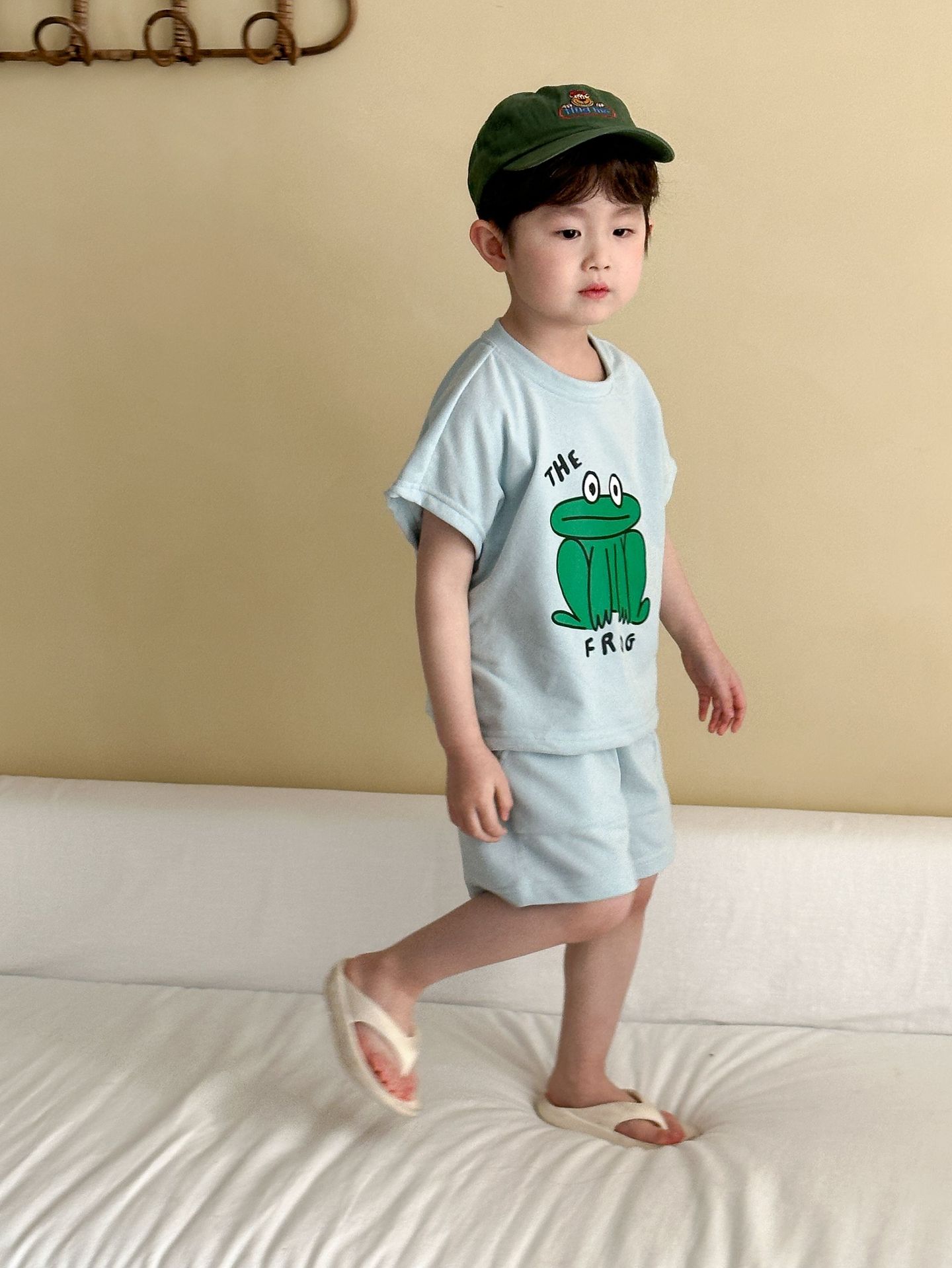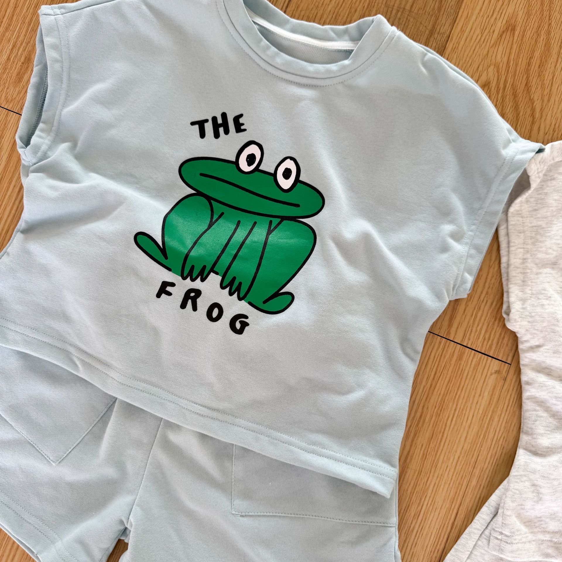 This two-piece set features a frog print short-sleeved T-shirt and shorts, making it comfortable for kids to wear. The T-shirt features a cute frog print , while the shorts have a simple design, creating a coordinated look when combined.