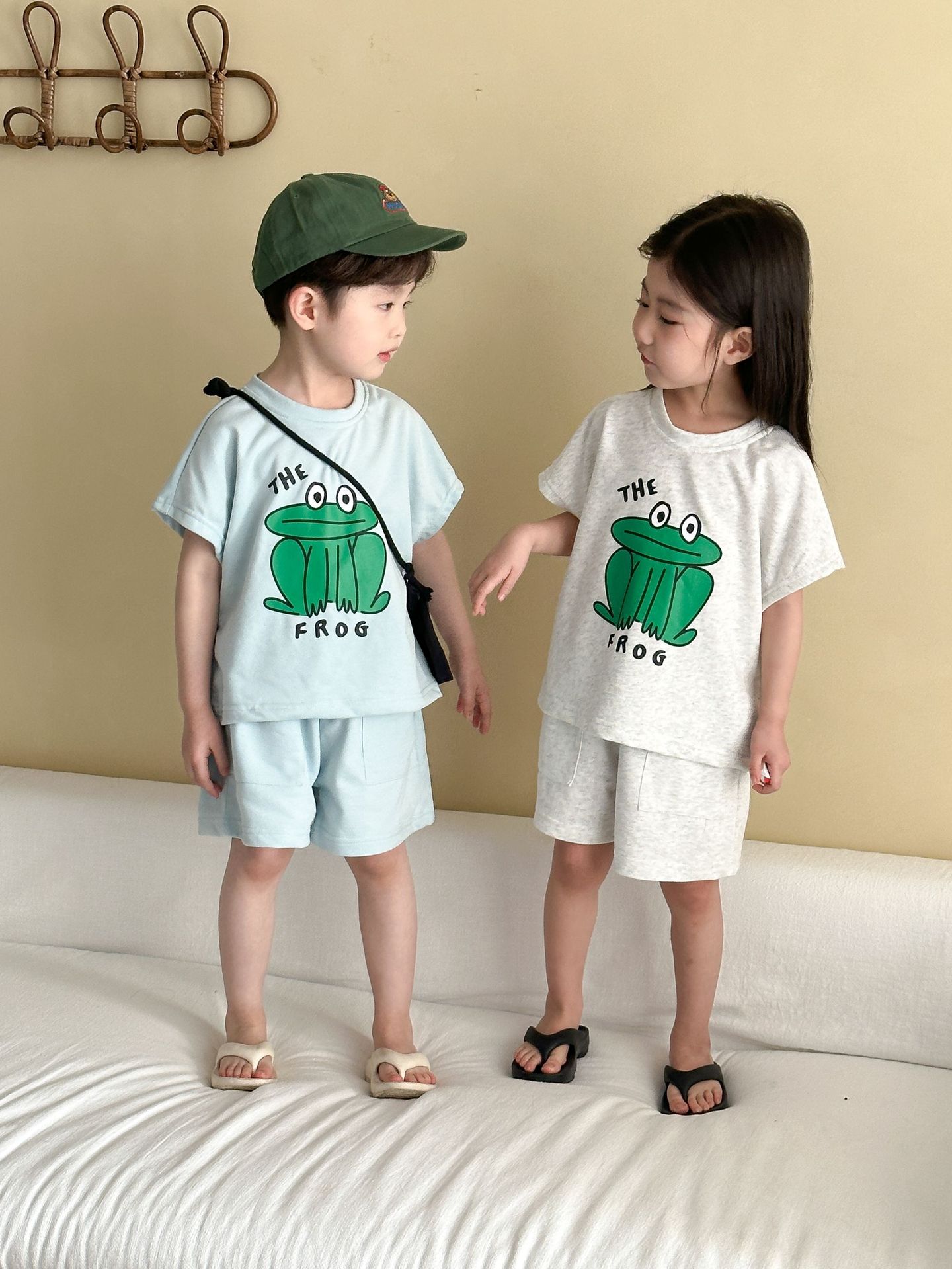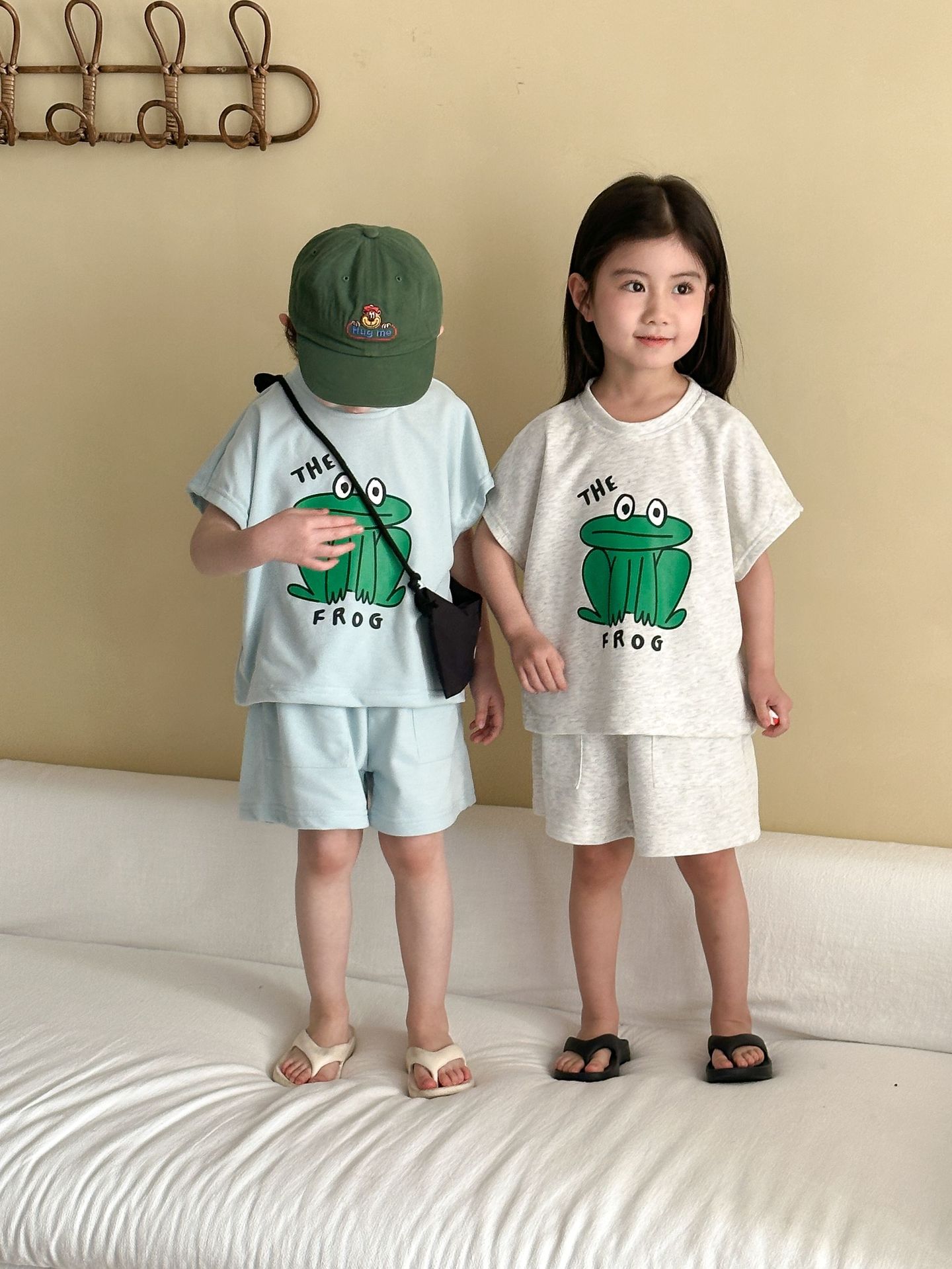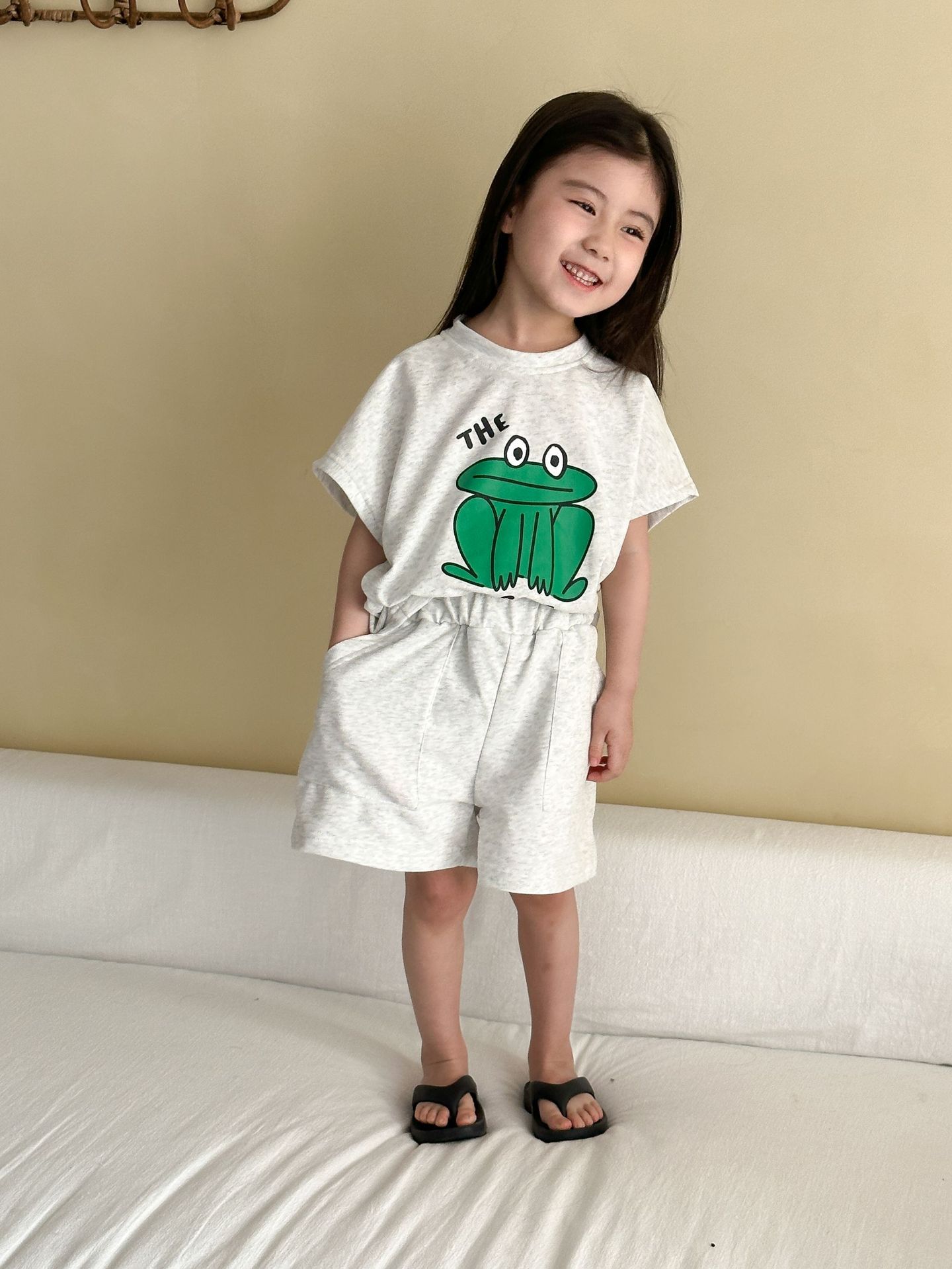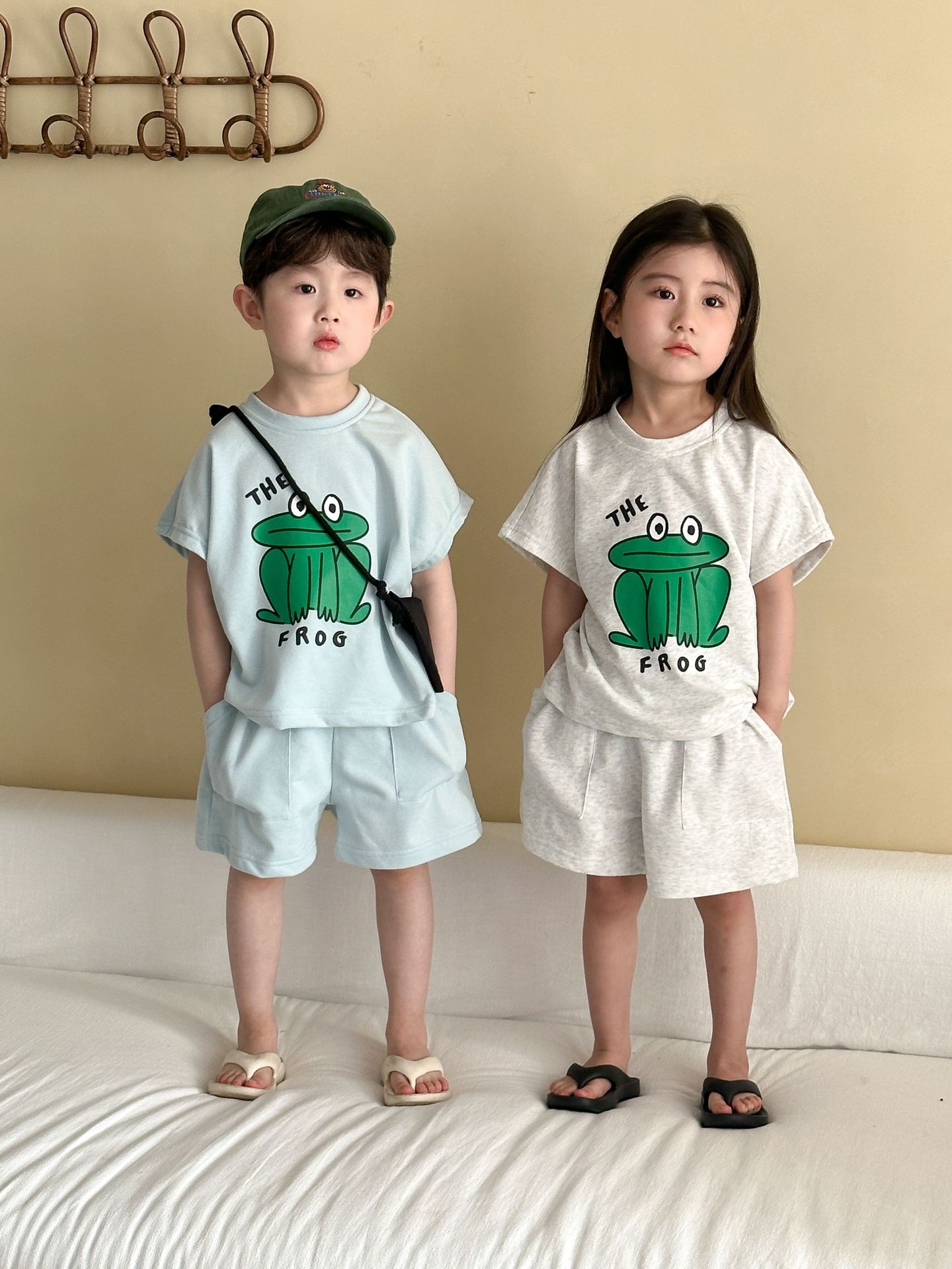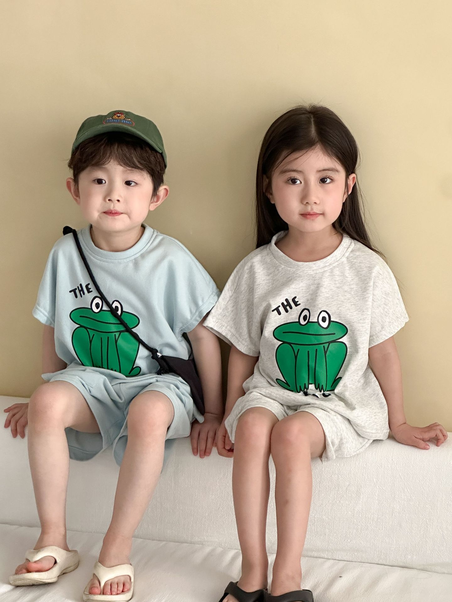 This two-piece set features a frog print short-sleeved T-shirt and shorts, making it comfortable for kids to wear. The T-shirt features a cute frog print , while the shorts have a simple design, creating a coordinated look when combined.