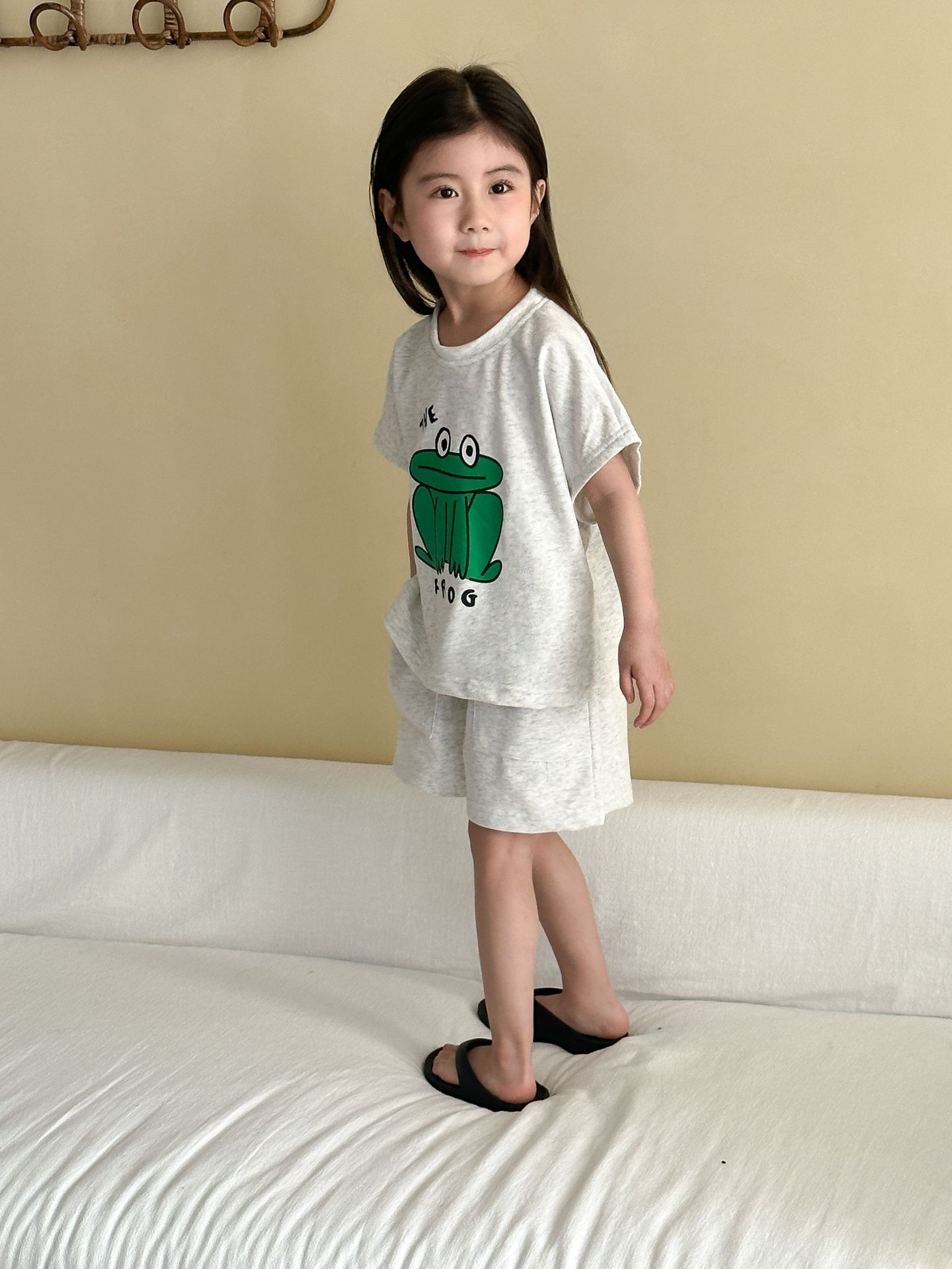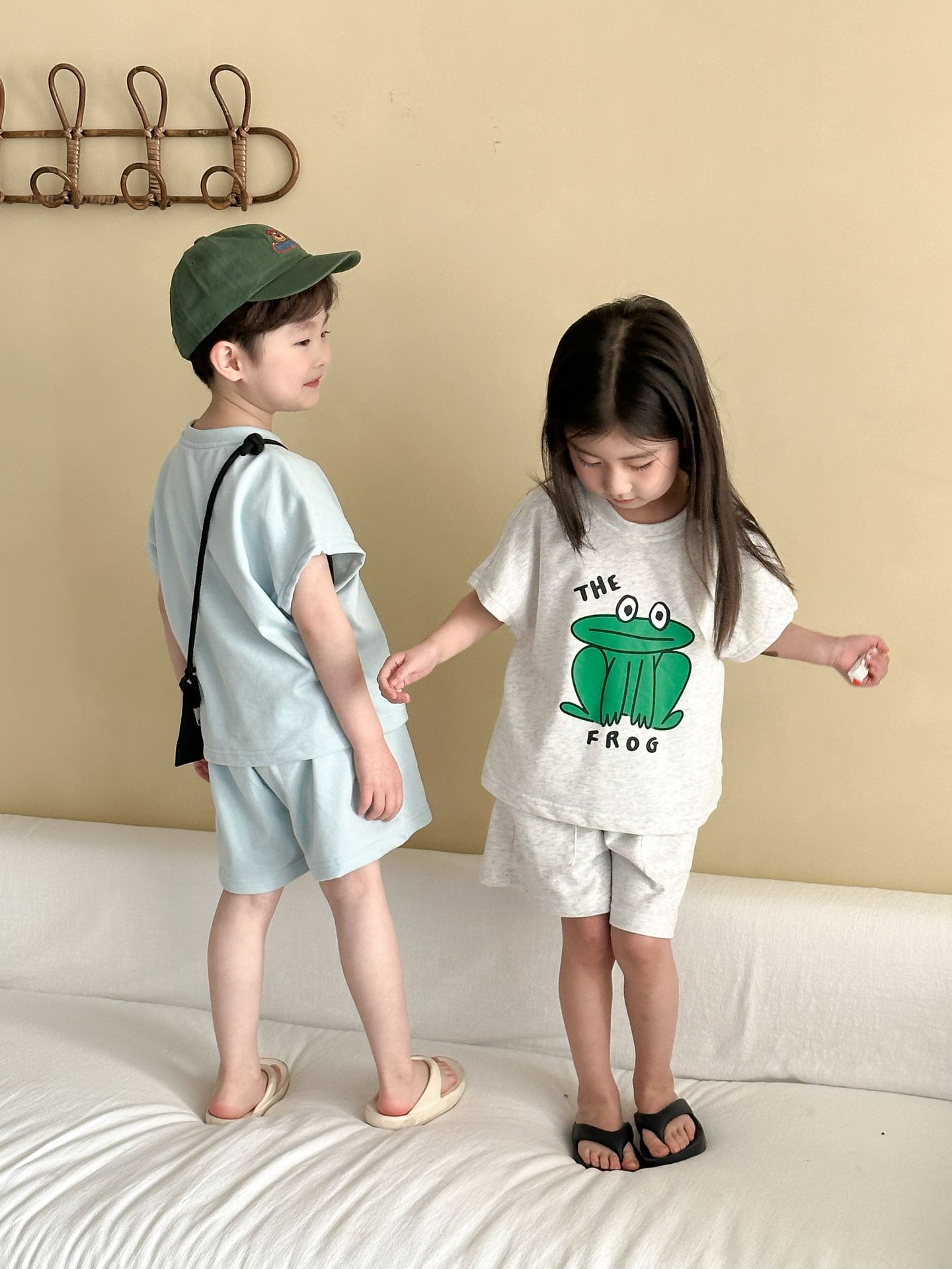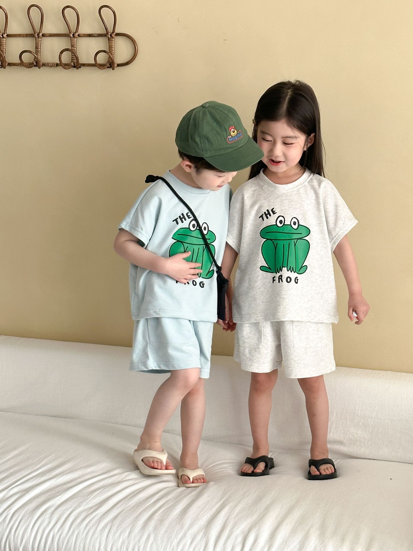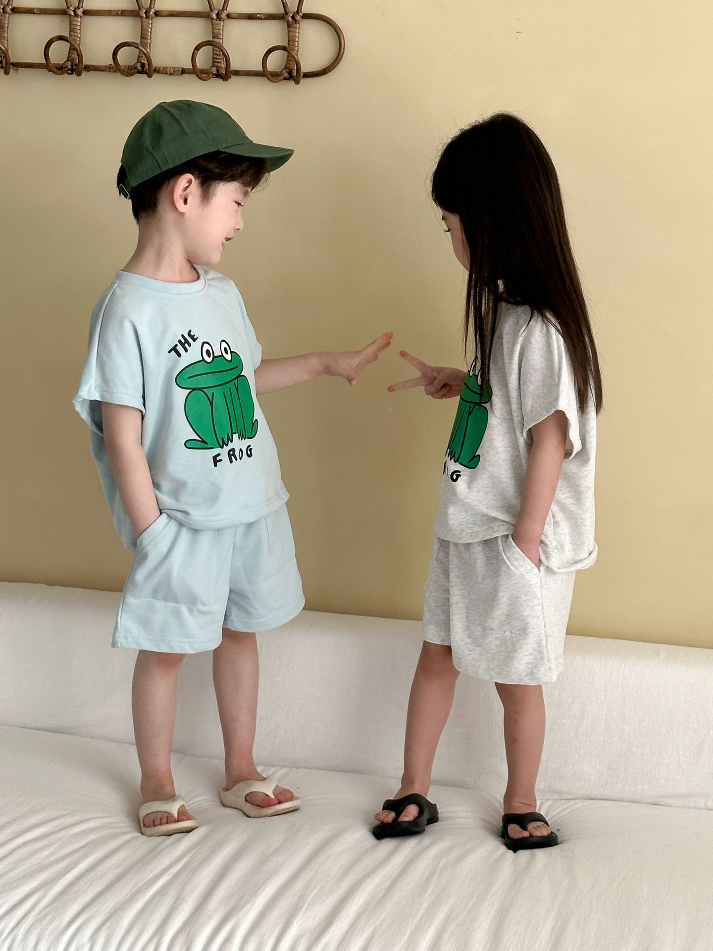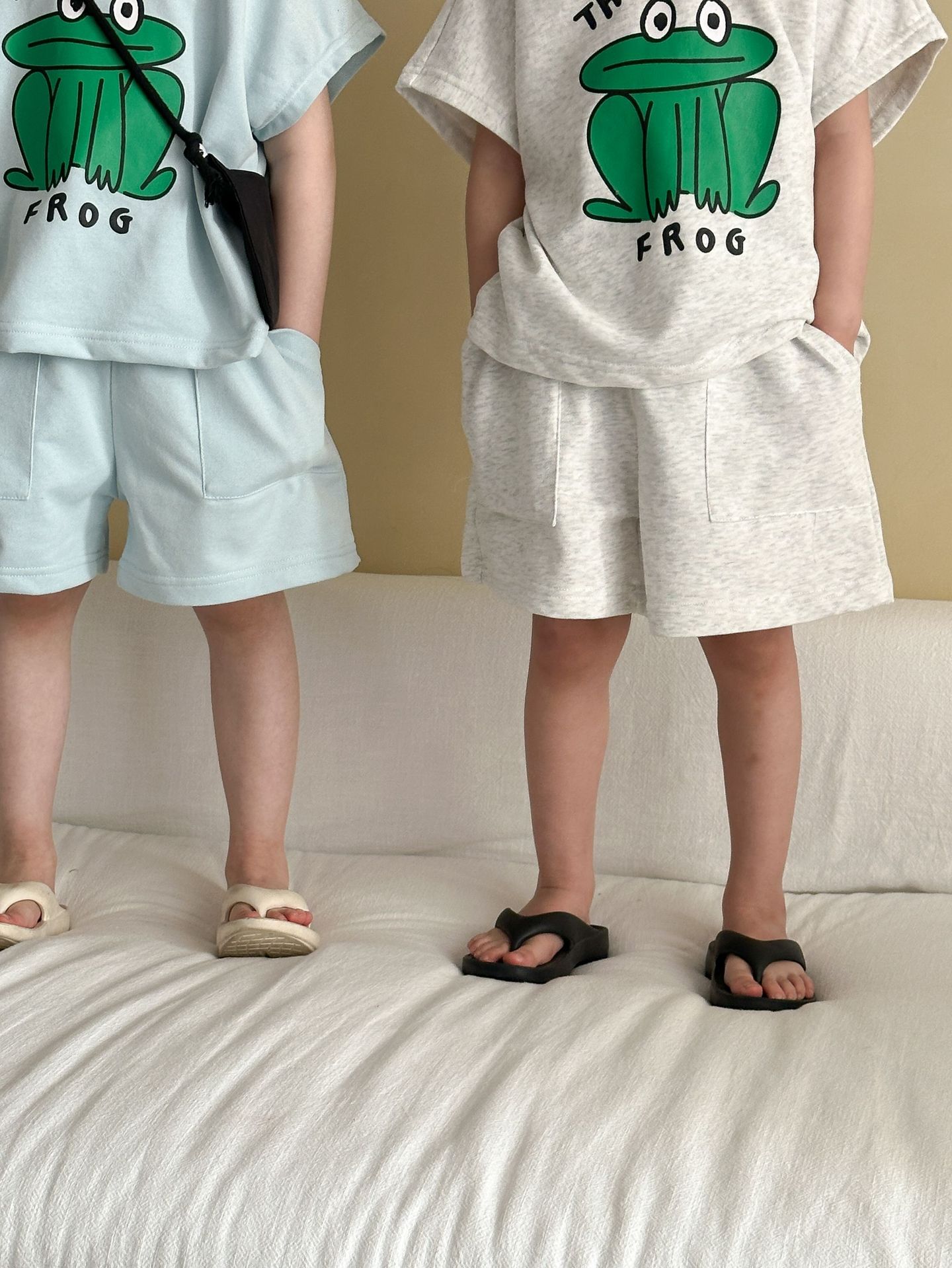 This two-piece set features a frog print short-sleeved T-shirt and shorts, making it comfortable for kids to wear. The T-shirt features a cute frog print , while the shorts have a simple design, creating a coordinated look when combined.