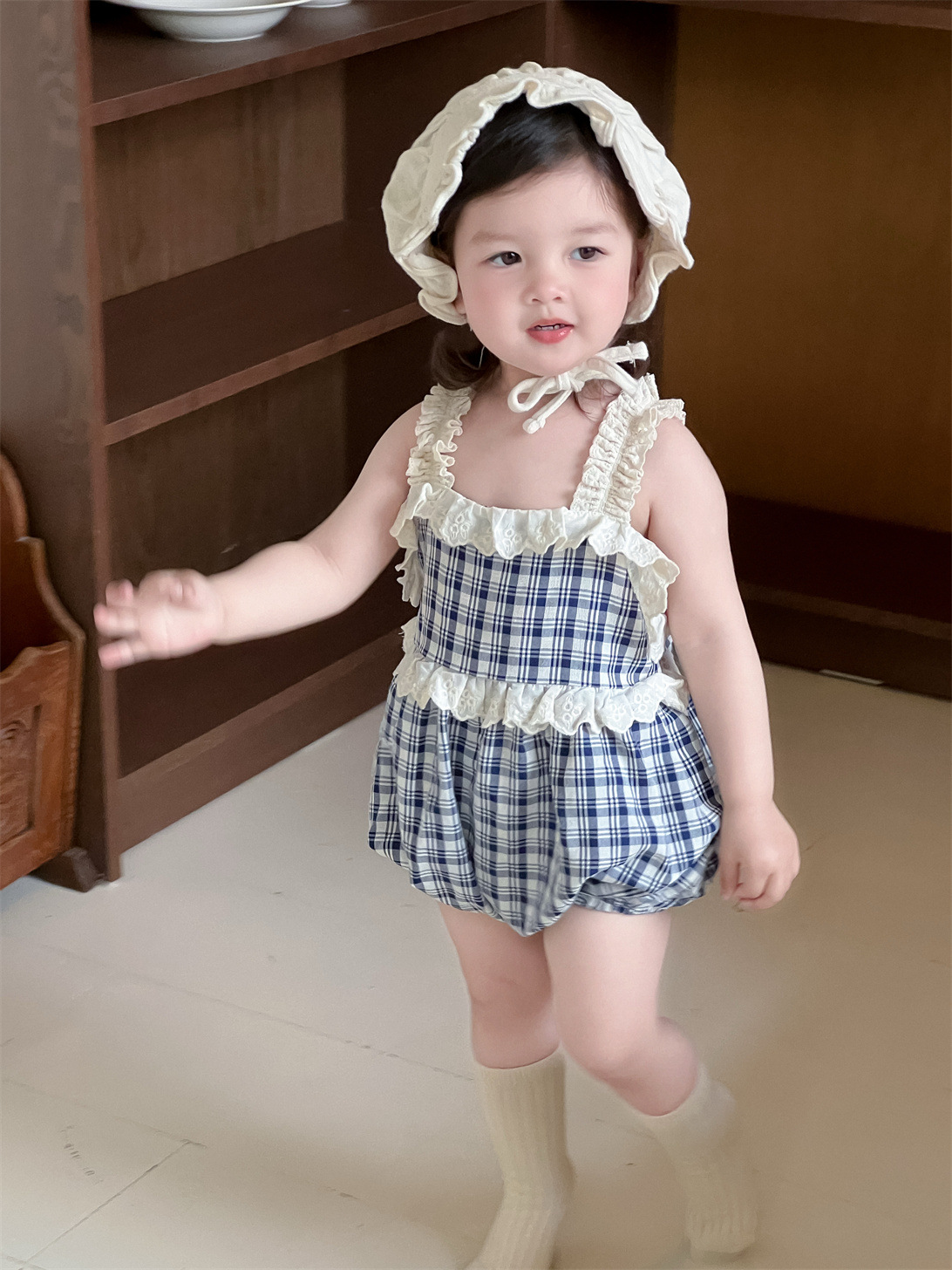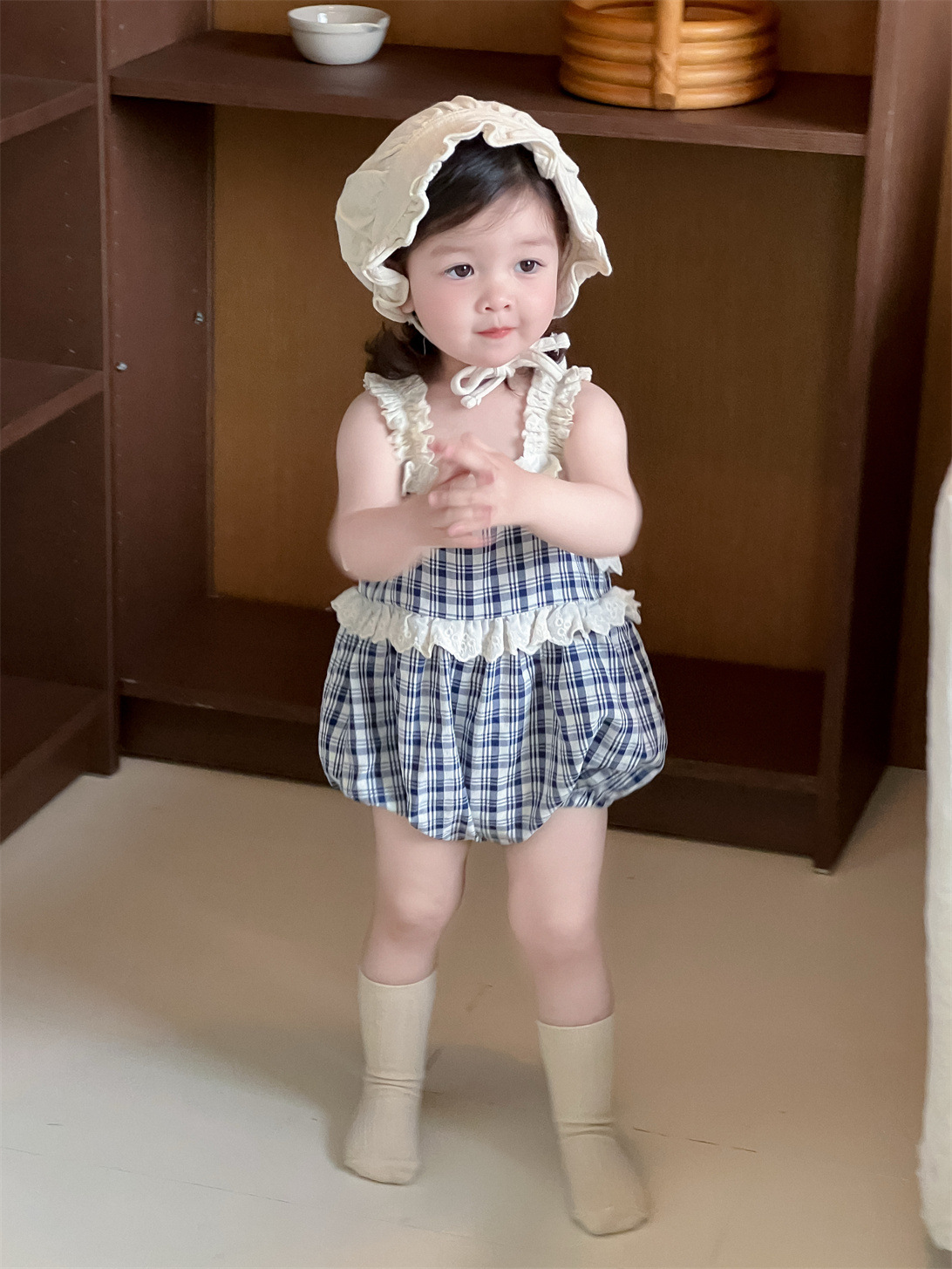 The Check/Striped Frill Camisole Balloon Romper is a camisole-style romper available in a checkered or striped pattern . It features ruffles on the shoulders and a soft, balloon silhouette , creating a cute impression.