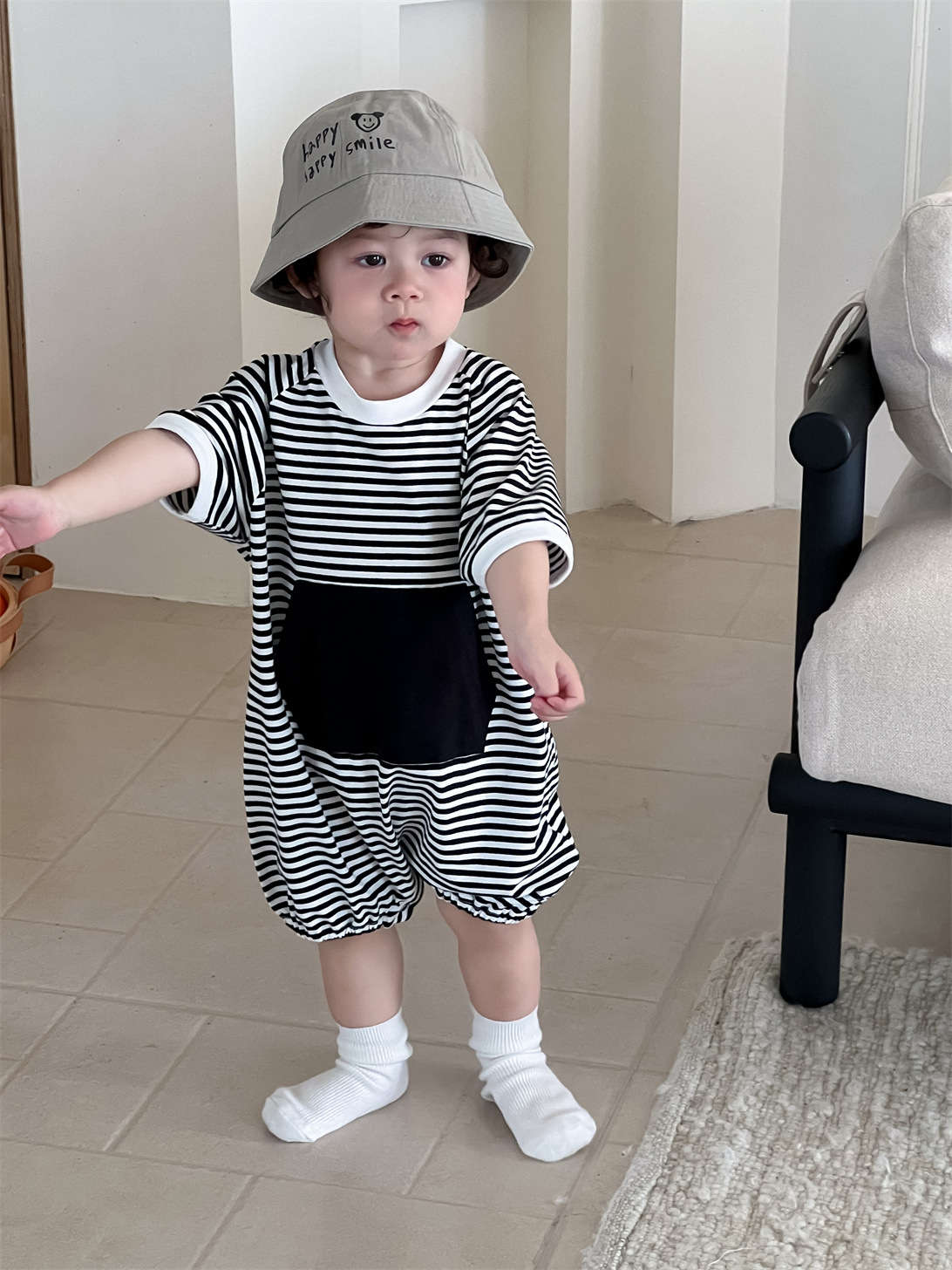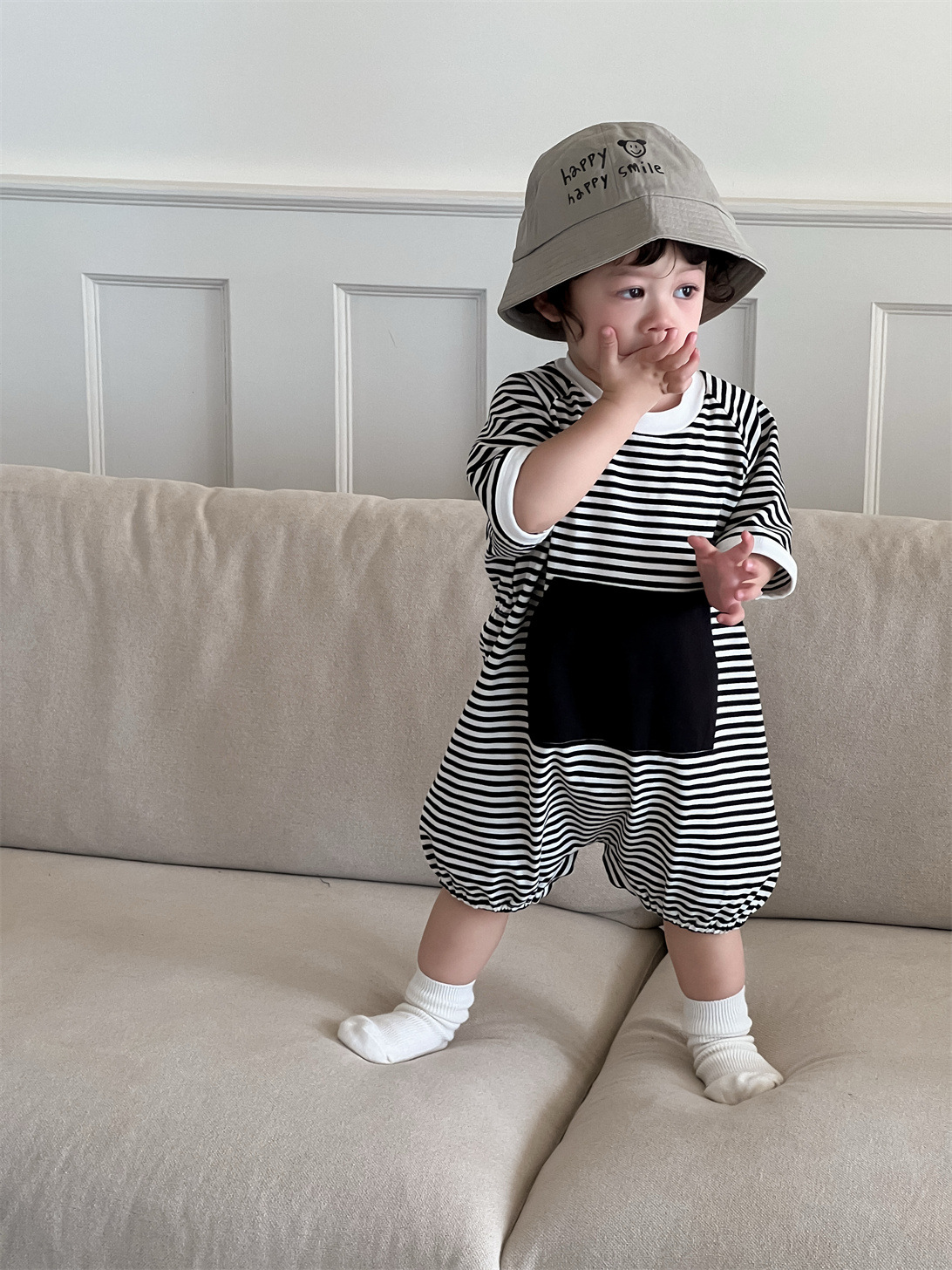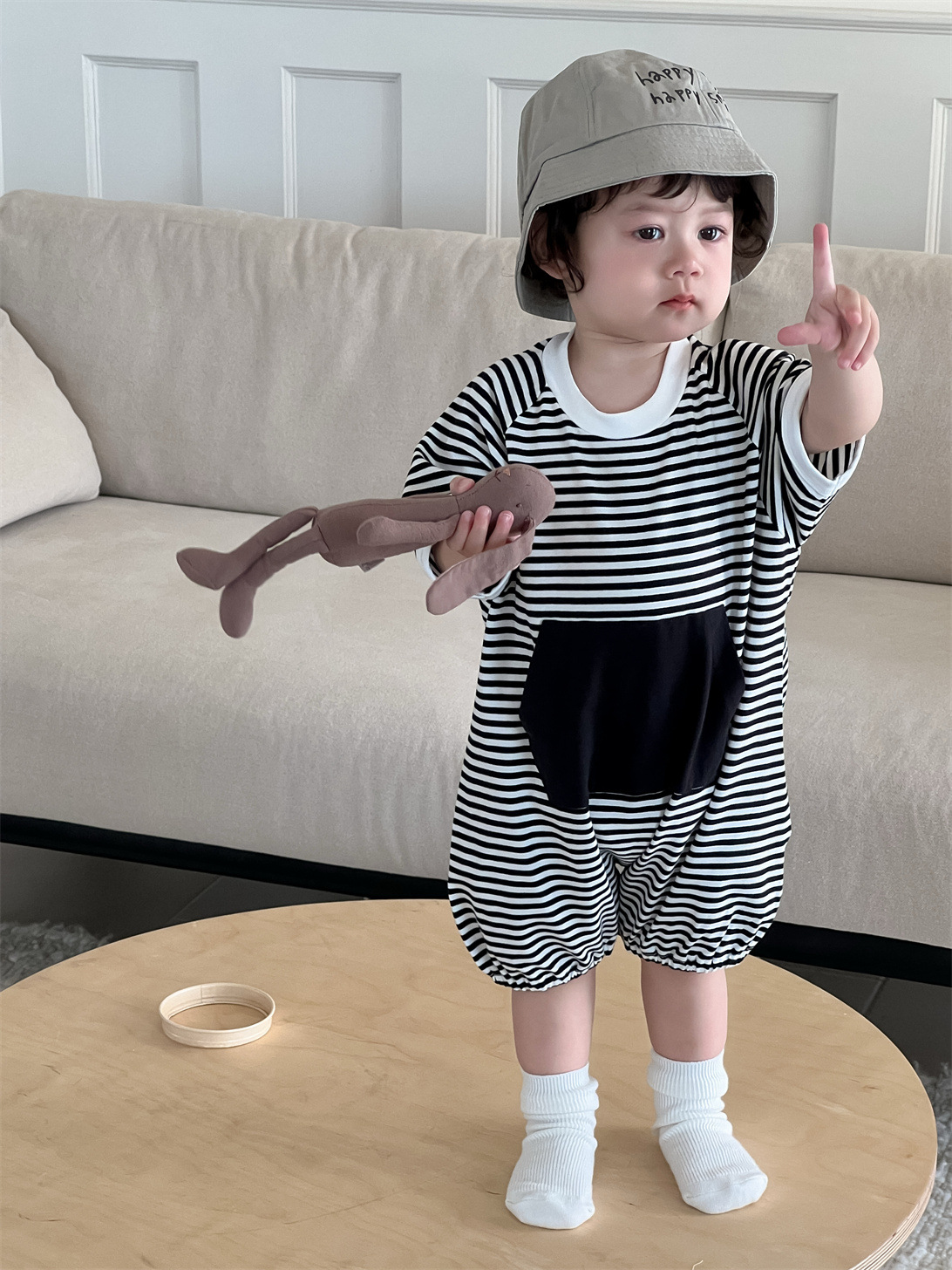 The lightweight material is gentle on your baby's delicate skin and highly breathable. The loose fit allows for freedom of movement and allows for crawling and active movement. The easy-to-put-on and easy-to-take-off design makes diaper changes a breeze. Perfect for everyday wear as well as casual outings, this big-pocket striped short-sleeve jumpsuit is a stylish addition to your child's everyday look.