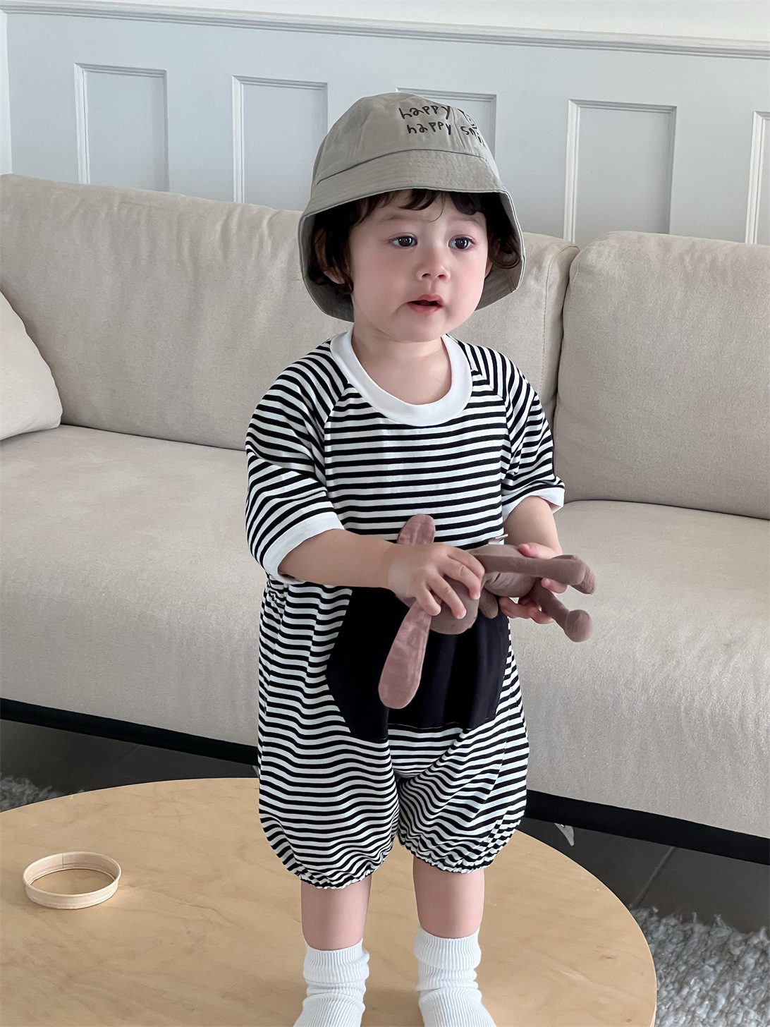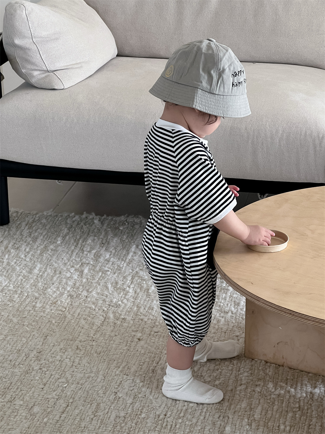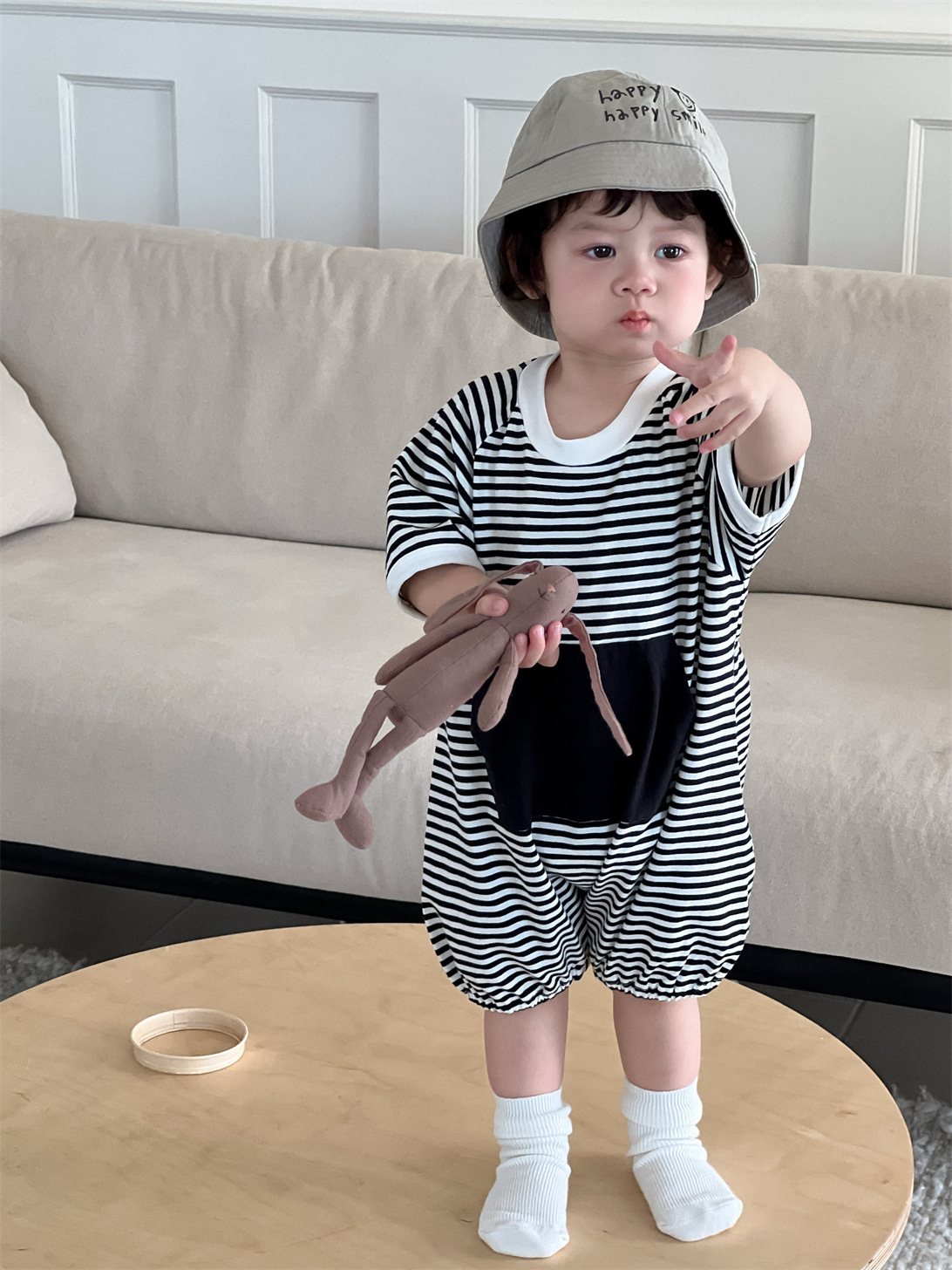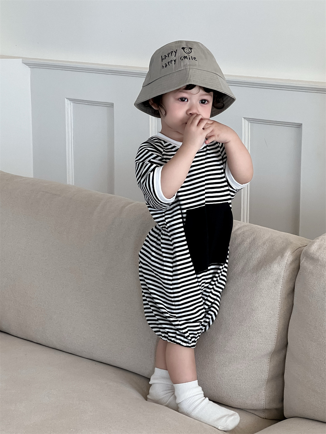 The lightweight material is gentle on your baby's delicate skin and highly breathable. The loose fit allows for freedom of movement and allows for crawling and active movement. The easy-to-put-on and easy-to-take-off design makes diaper changes a breeze. Perfect for everyday wear as well as casual outings, this big-pocket striped short-sleeve jumpsuit is a stylish addition to your child's everyday look.
