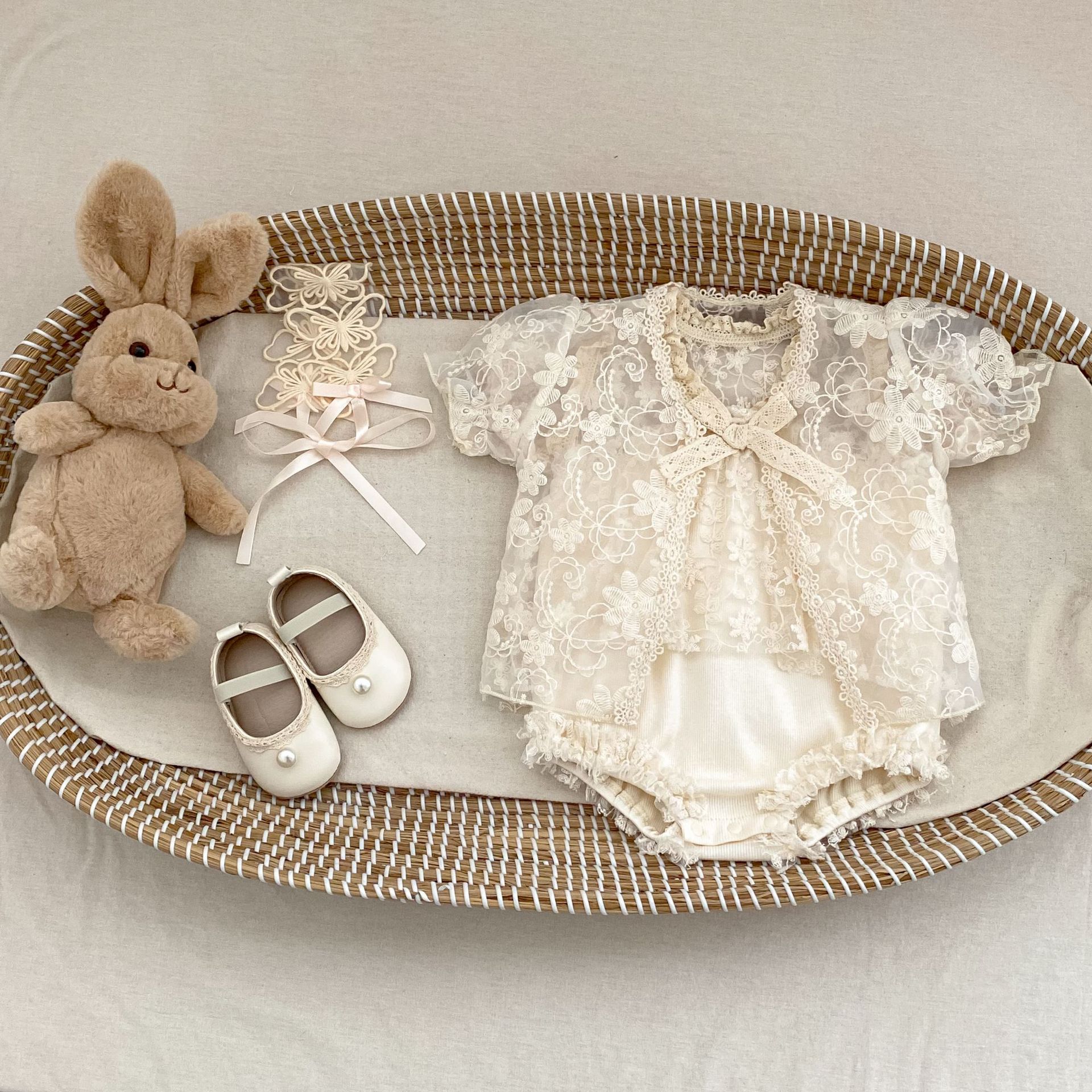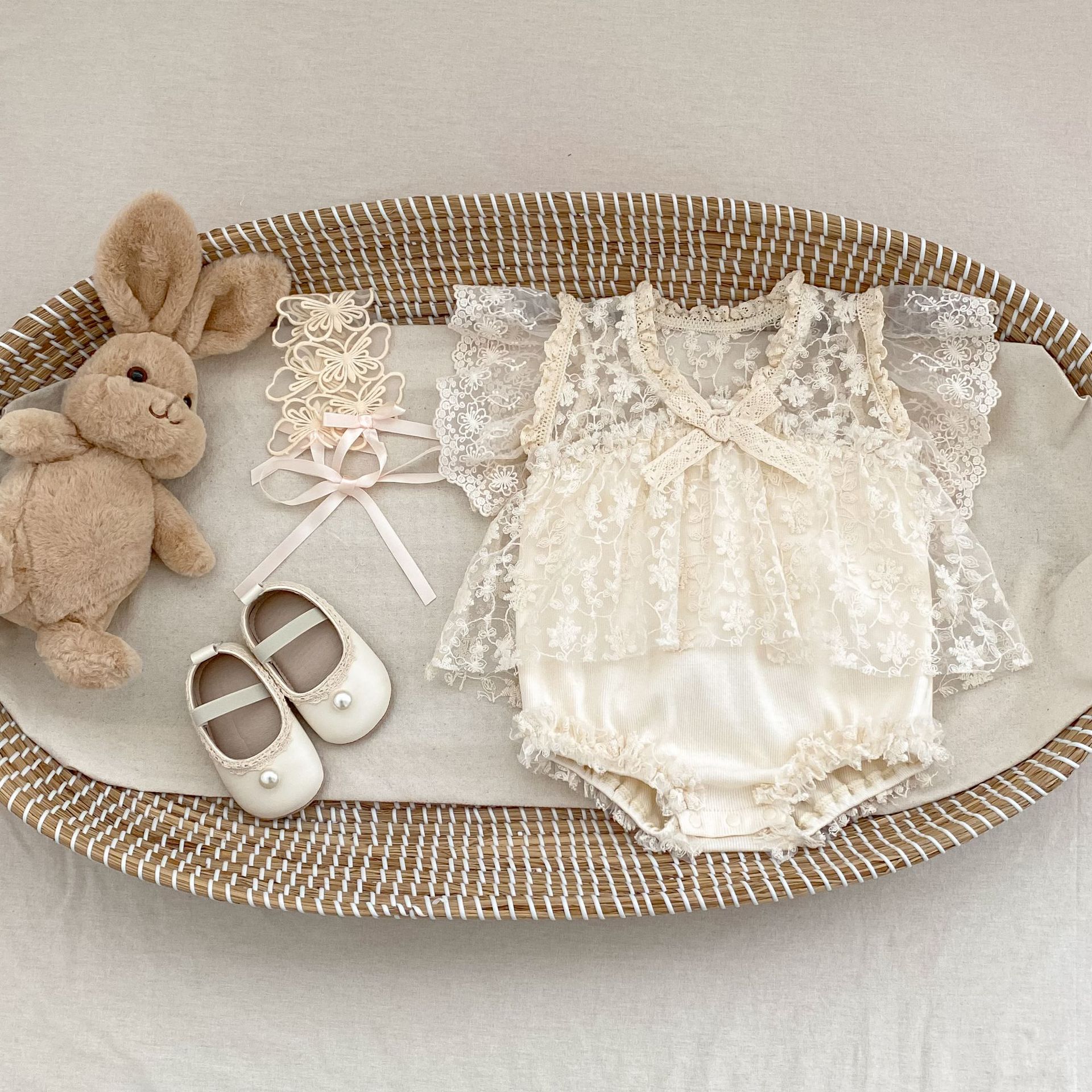 The soft cotton material, combined with delicate lace and embroidery, creates a sophisticated and cute design. It's perfect for going out, as well as for commemorative photos on special occasions like the 100th day after birth. The snap buttons at the crotch make diaper changes a breeze. This highly recommended romper will make your baby even more adorable just by putting it on.