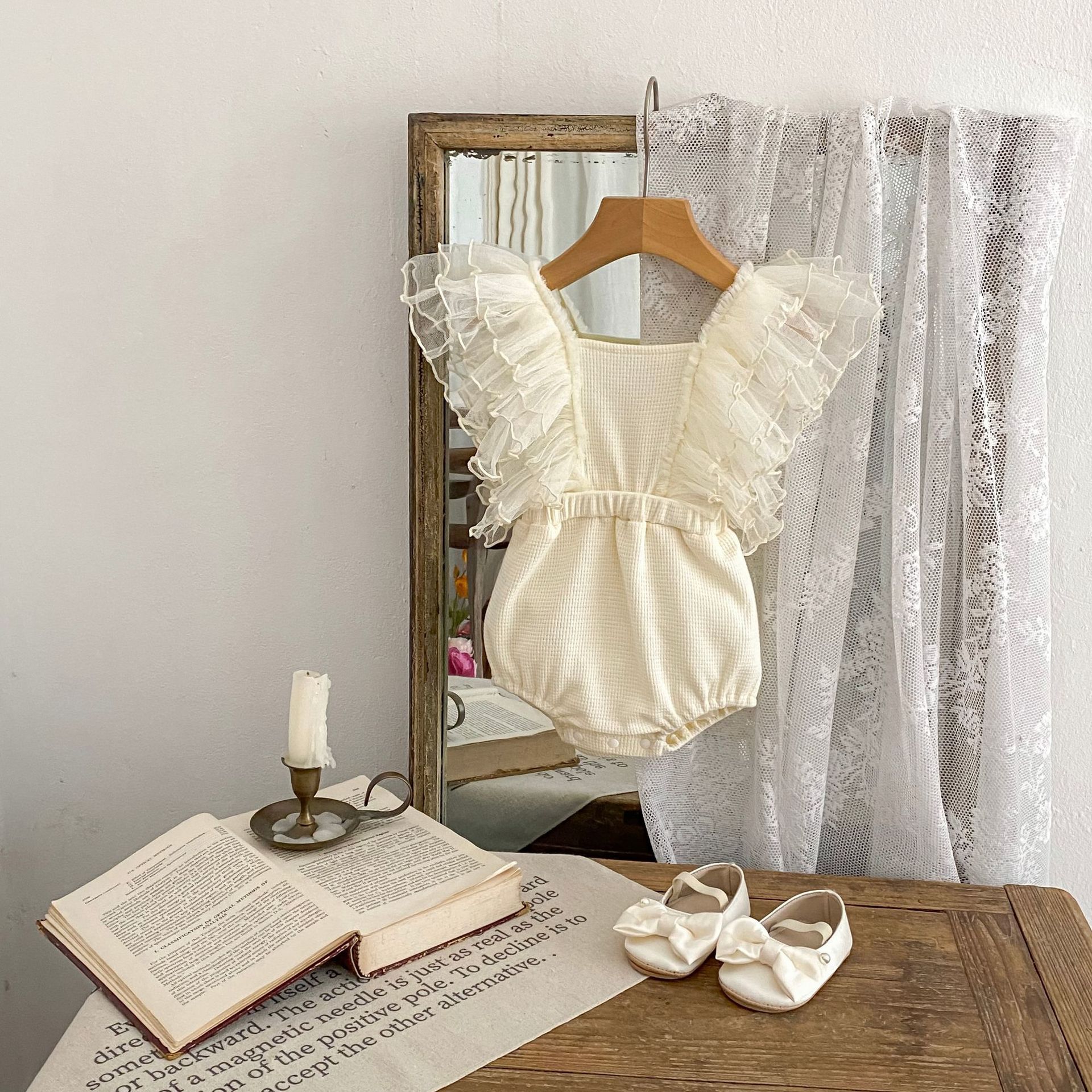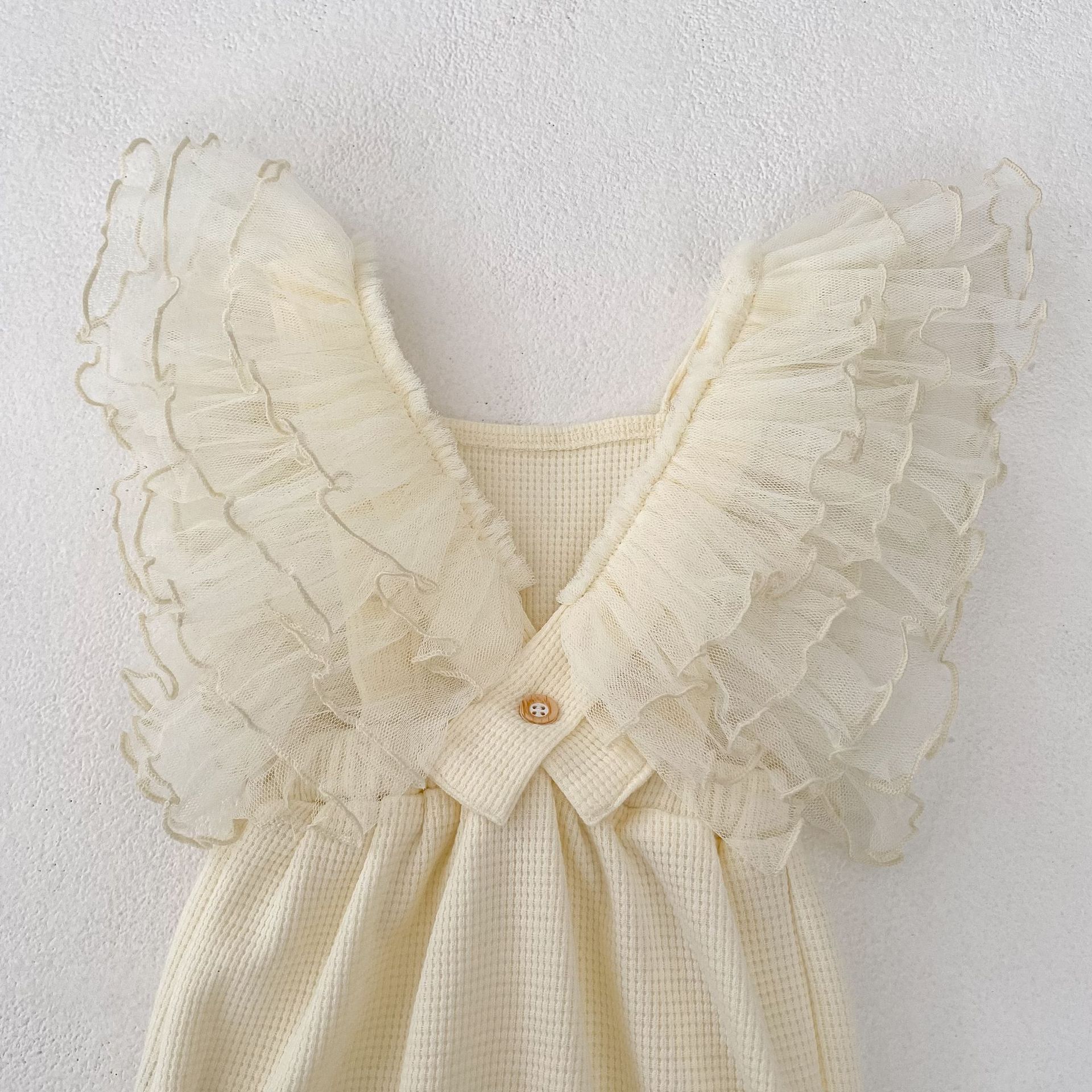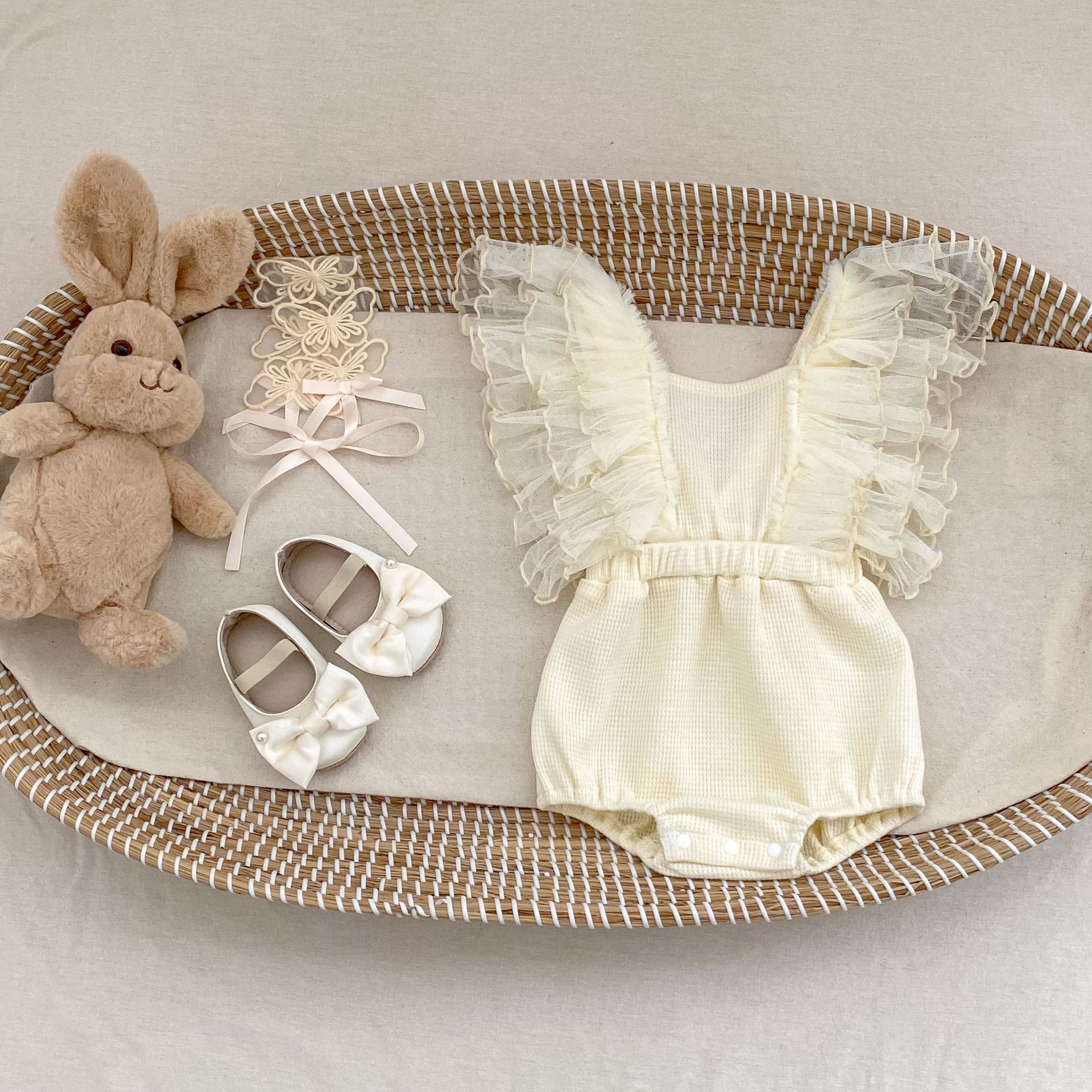 Made from waffle mesh material , it's soft to the touch and highly breathable, ensuring your baby stays comfortable even in the hot summer. The large flying sleeves (ruffled sleeves) that extend from the shoulders to the back resemble butterfly wings, and the cross design on the back is also cute. Snap buttons at the crotch make diaper changes a breeze. Especially recommended for babies who are still crawling or learning to walk, this versatile piece is perfect for everyday wear and outings.