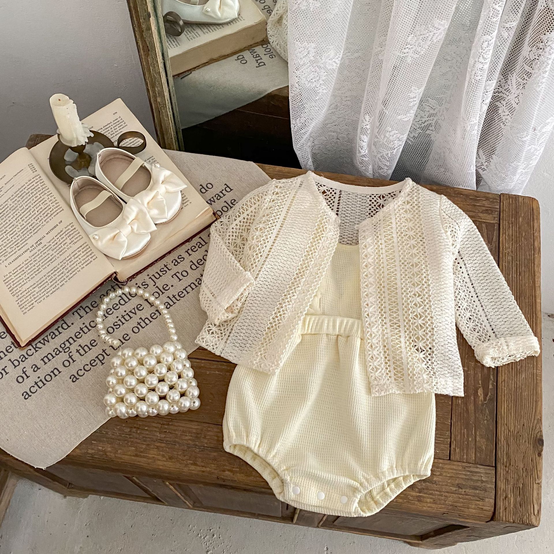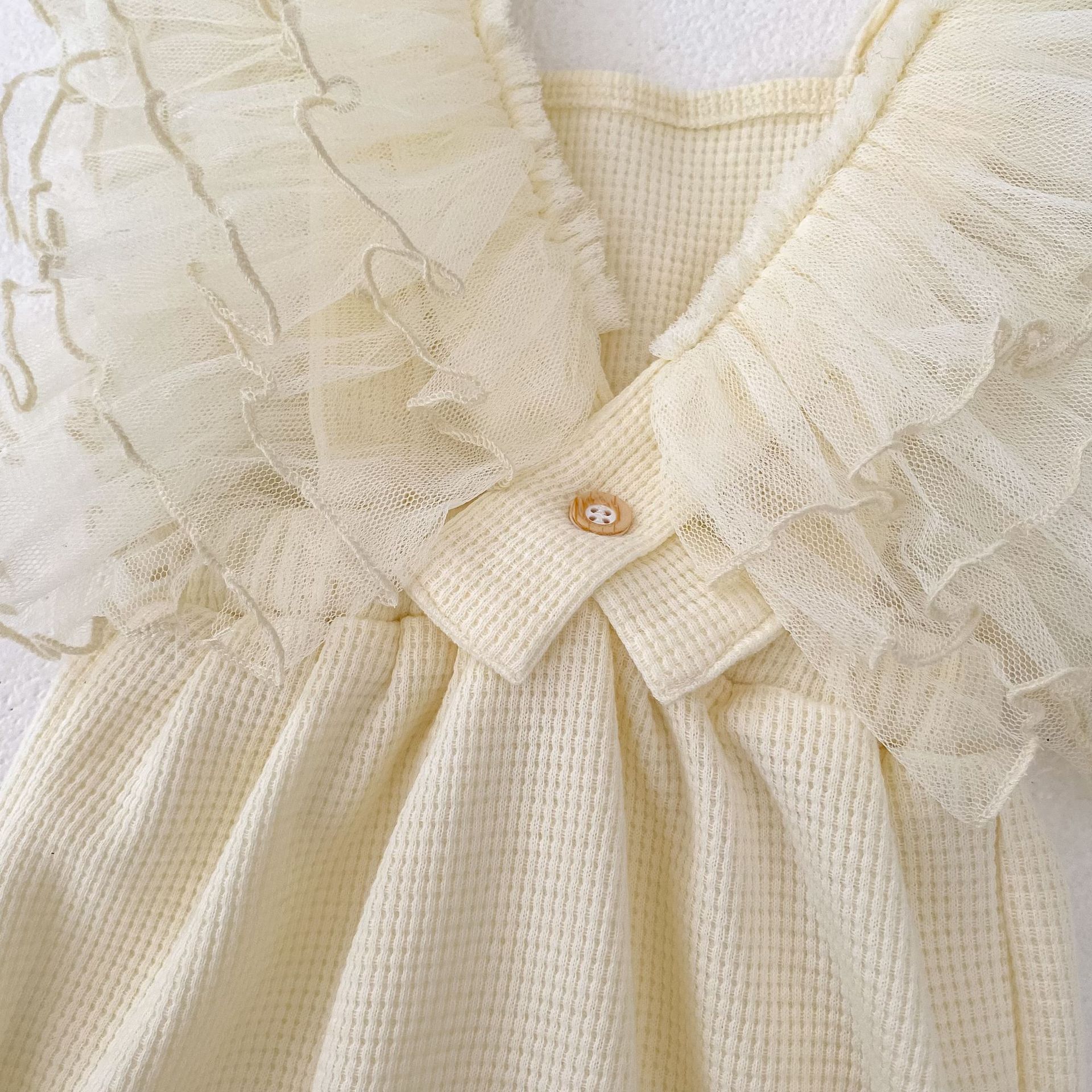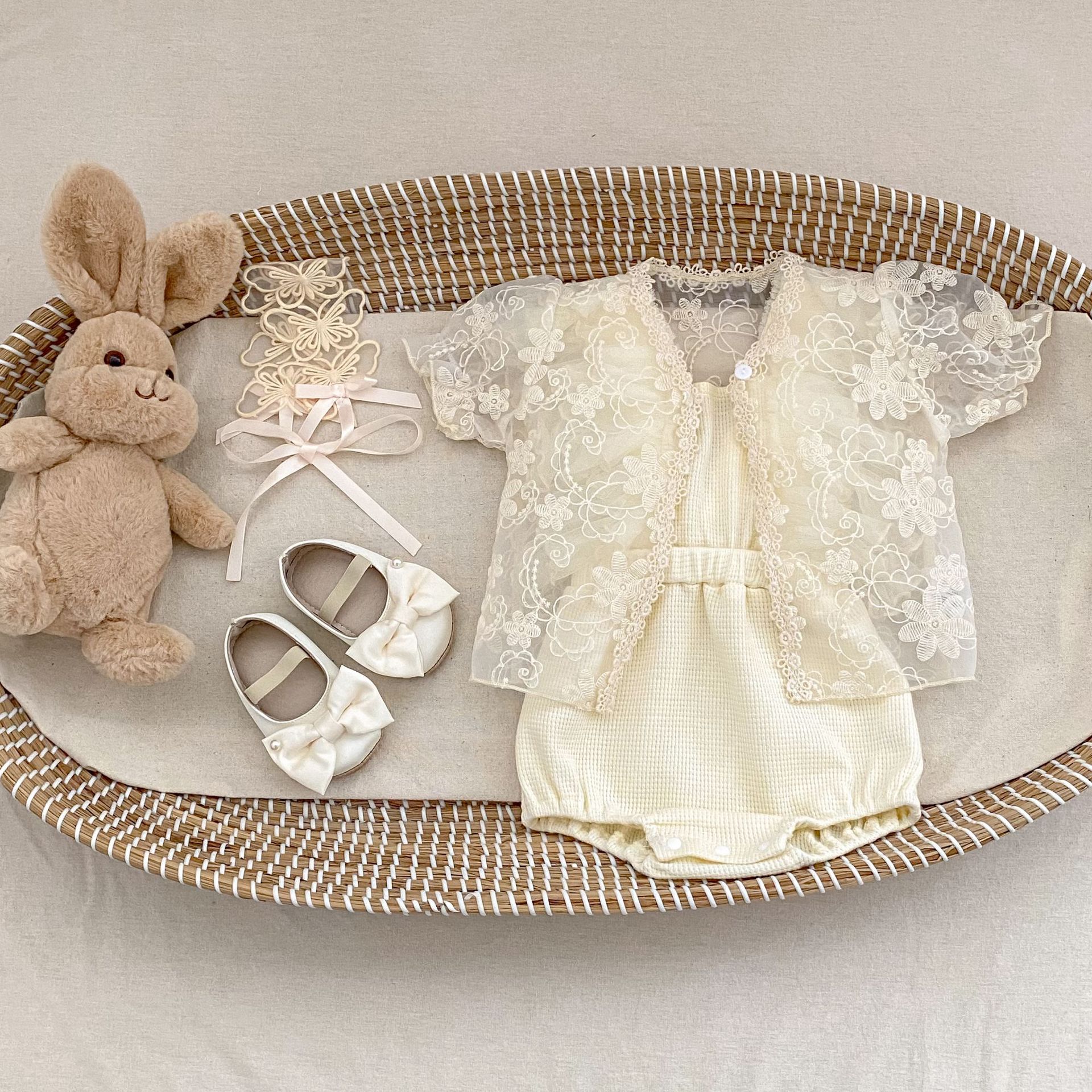 Made from waffle mesh material , it's soft to the touch and highly breathable, ensuring your baby stays comfortable even in the hot summer. The large flying sleeves (ruffled sleeves) that extend from the shoulders to the back resemble butterfly wings, and the cross design on the back is also cute. Snap buttons at the crotch make diaper changes a breeze. Especially recommended for babies who are still crawling or learning to walk, this versatile piece is perfect for everyday wear and outings.